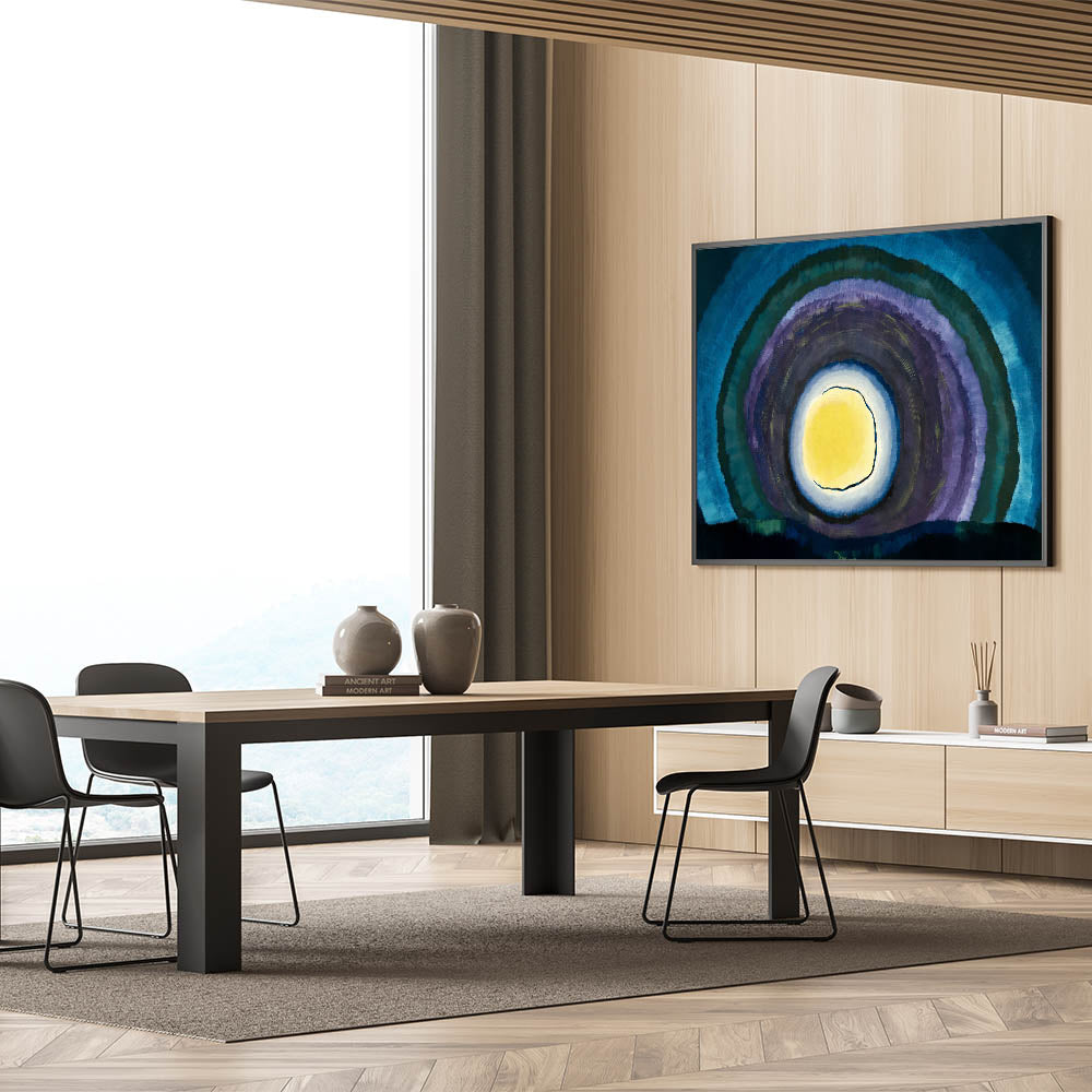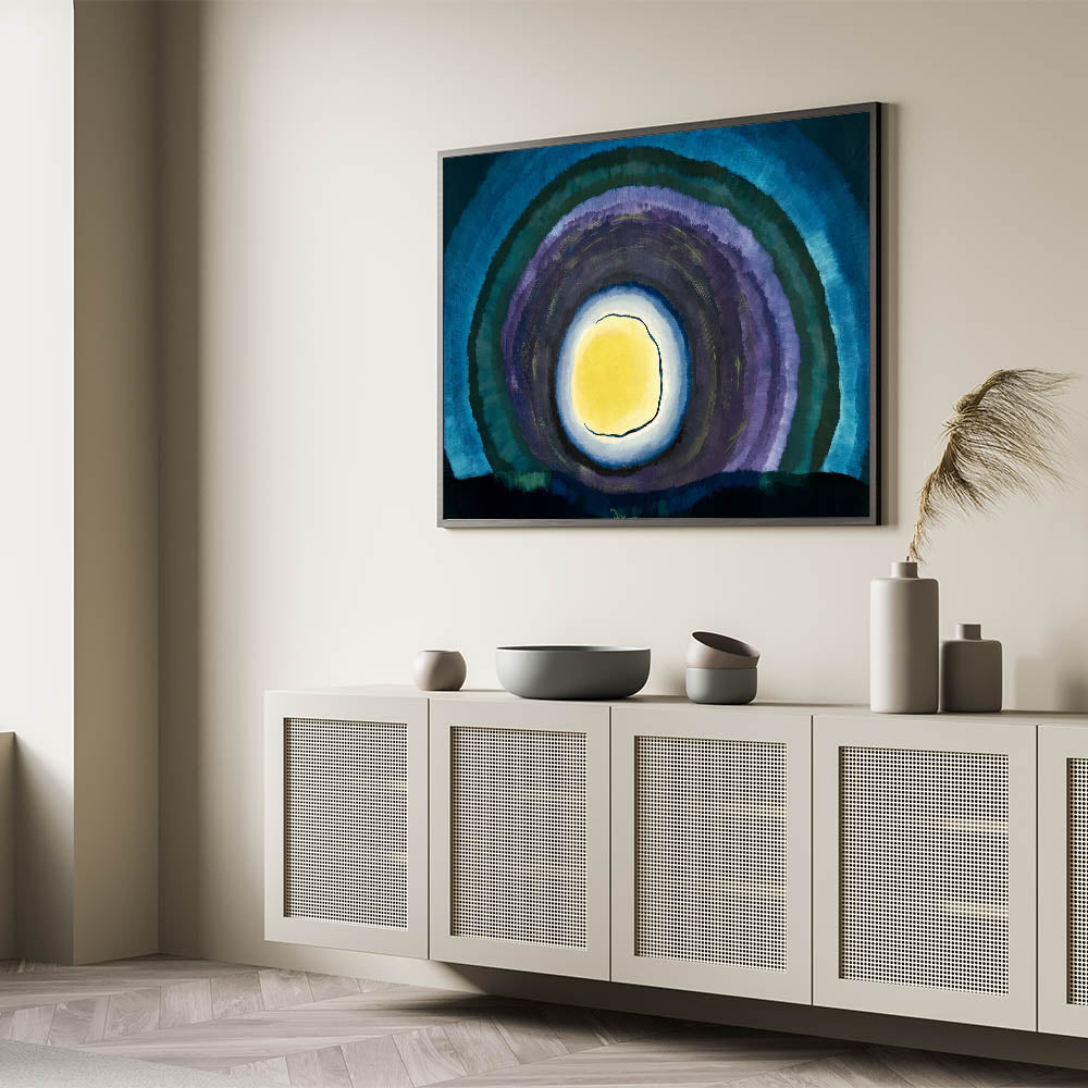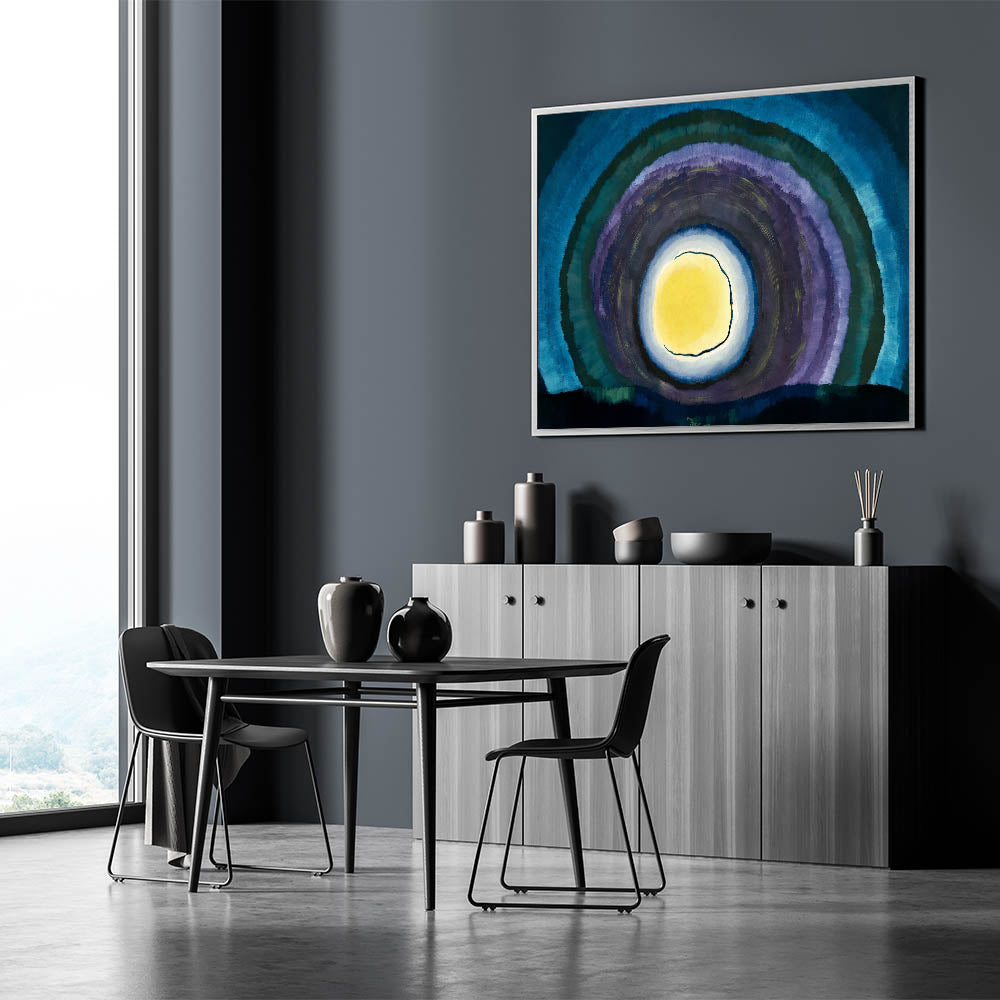 Infuse your space with the energy and beauty of a radiant sunrise through this stunning piece of modern wall art. The concentric layers of bold colors—ranging from deep blues and greens to rich purples and a vibrant yellow core—create a mesmerizing visual effect. This abstract depiction of a sunrise captures the interplay of light and color, offering a modern take on a timeless natural phenomenon.