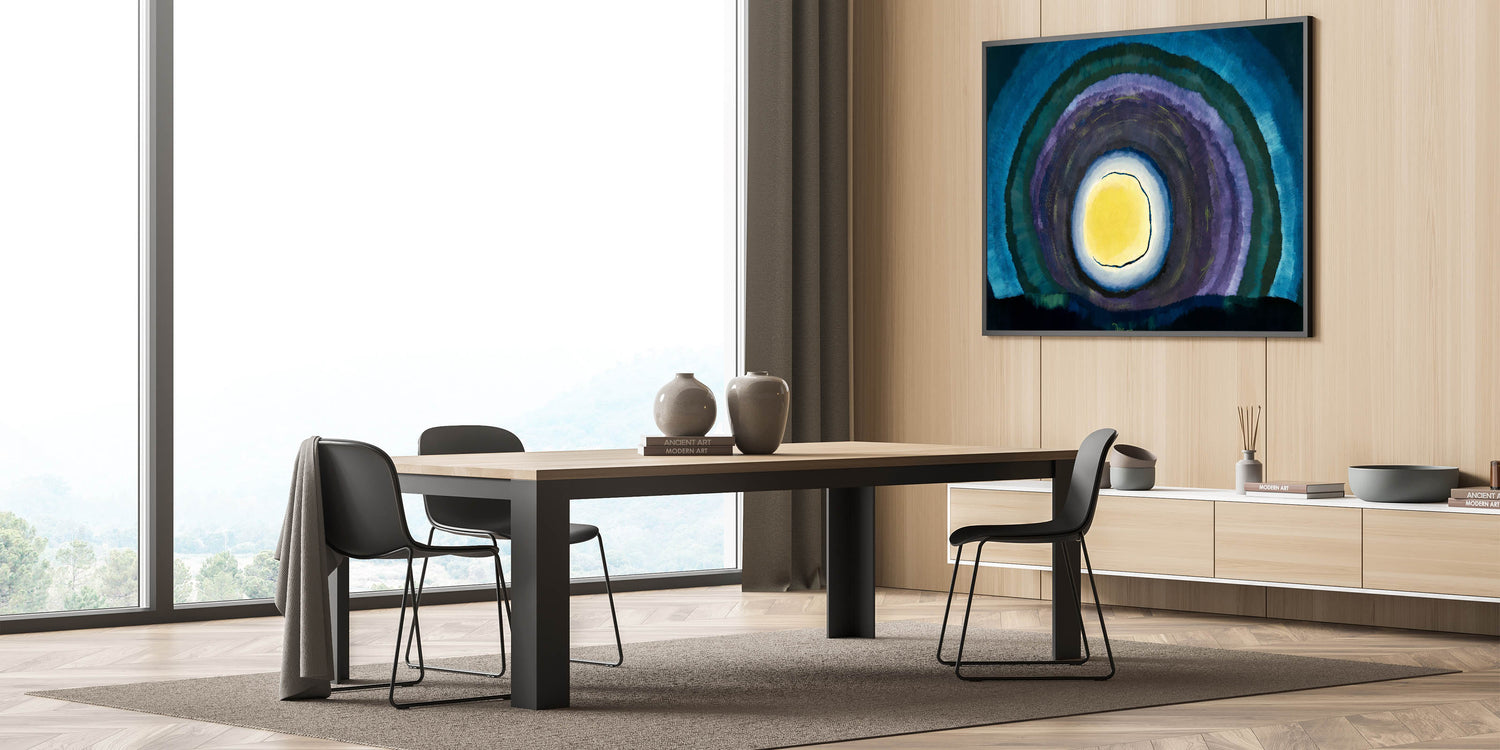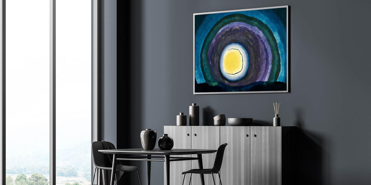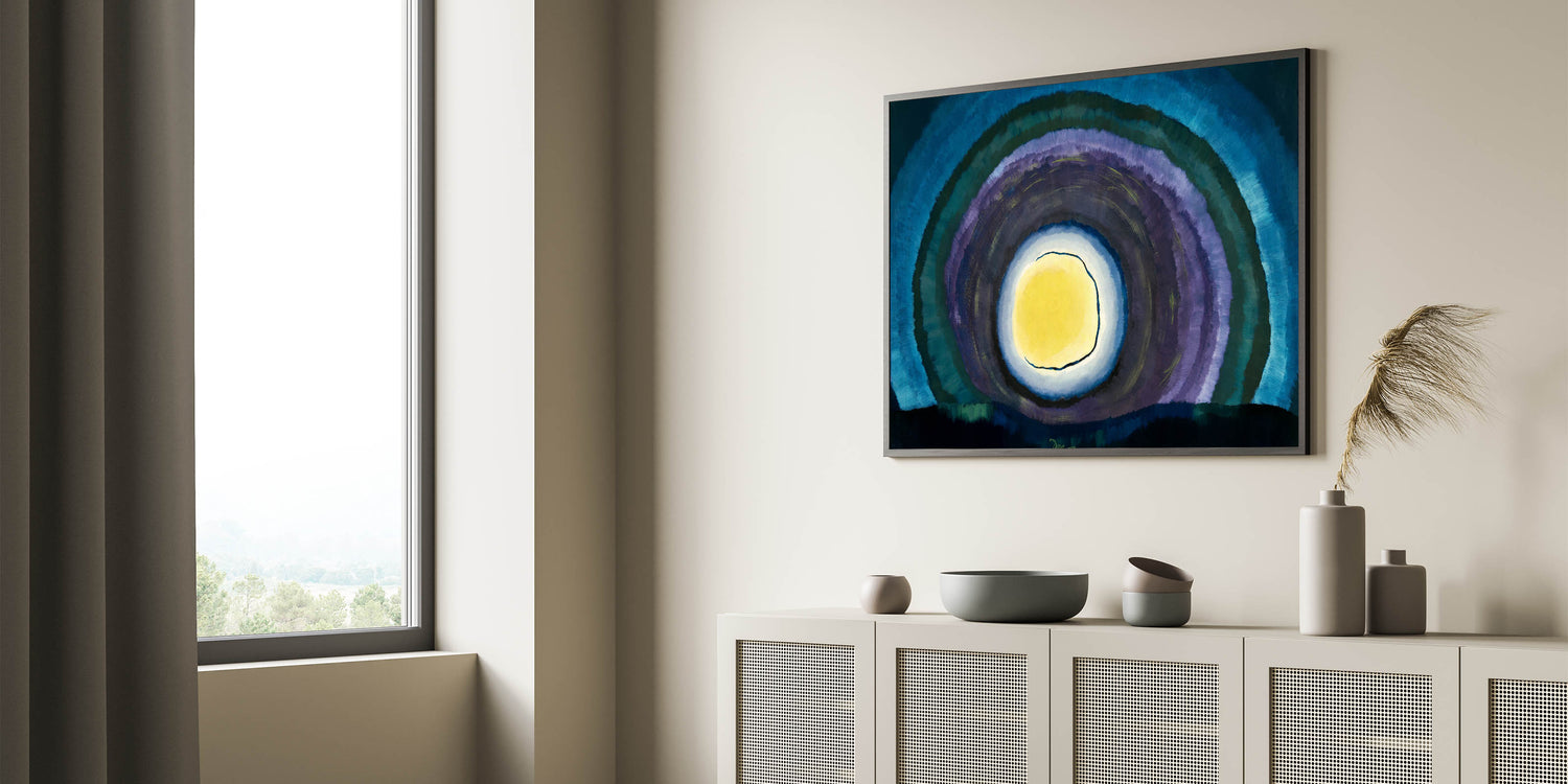 Infuse your space with the energy and beauty of a radiant sunrise through this stunning piece of modern wall art. The concentric layers of bold colors—ranging from deep blues and greens to rich purples and a vibrant yellow core—create a mesmerizing visual effect. This abstract depiction of a sunrise captures the interplay of light and color, offering a modern take on a timeless natural phenomenon.