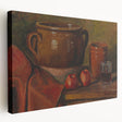 Infuse your home with timeless charm through this stunning modern wall art inspired by Alfred William Finch's "Still Life, 1923." This captivating piece showcases a warm, rustic arrangement of pottery, a glass of wine, and vibrant red apples set against a textured backdrop. The earthy tones and realistic detailing evoke a sense of coziness and sophistication, making it a perfect addition to modern and traditional decor alike.
