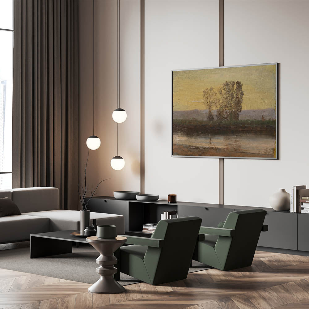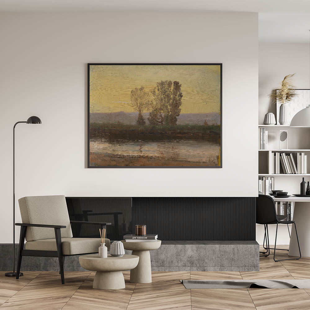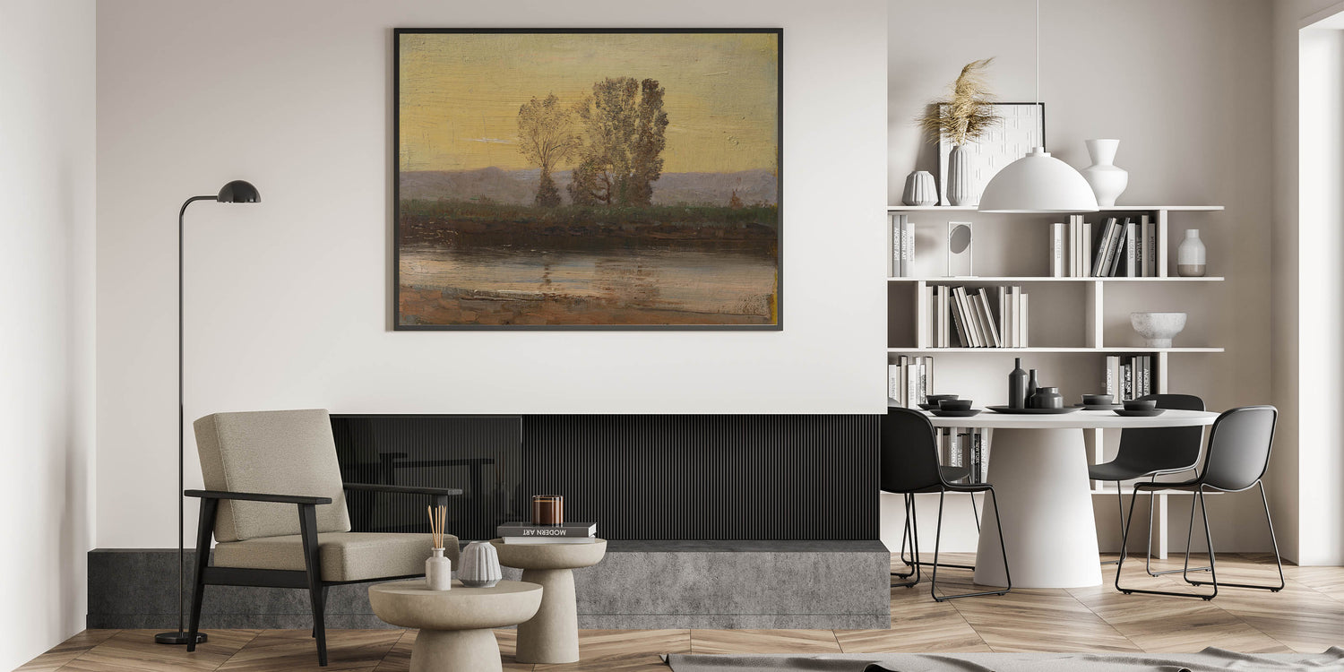 Transform your living space with this elegant and tranquil piece of modern wall art. Featuring a serene twilight landscape, the artwork beautifully captures the interplay of soft light and nature’s calmness. The cluster of trees reflected in the still waters of the river evokes a sense of peace and harmony, making it a perfect addition to your contemporary home decor.