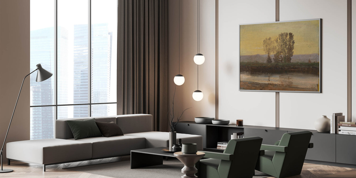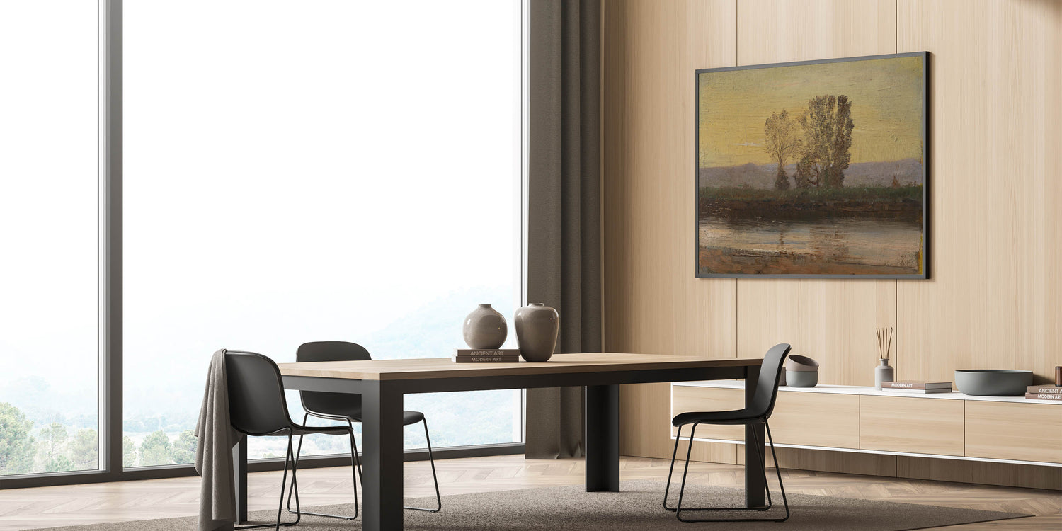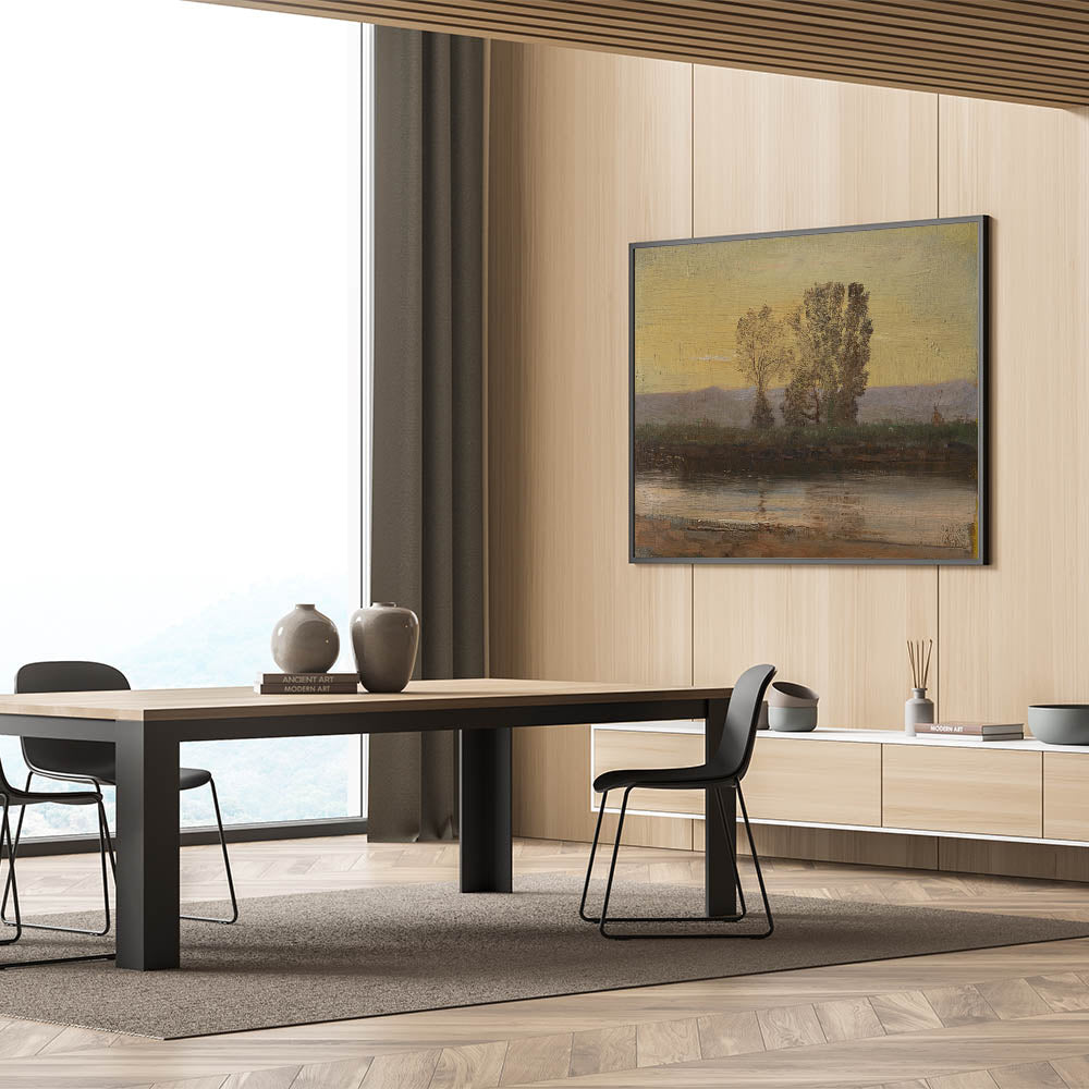 Transform your living space with this elegant and tranquil piece of modern wall art. Featuring a serene twilight landscape, the artwork beautifully captures the interplay of soft light and nature’s calmness. The cluster of trees reflected in the still waters of the river evokes a sense of peace and harmony, making it a perfect addition to your contemporary home decor.