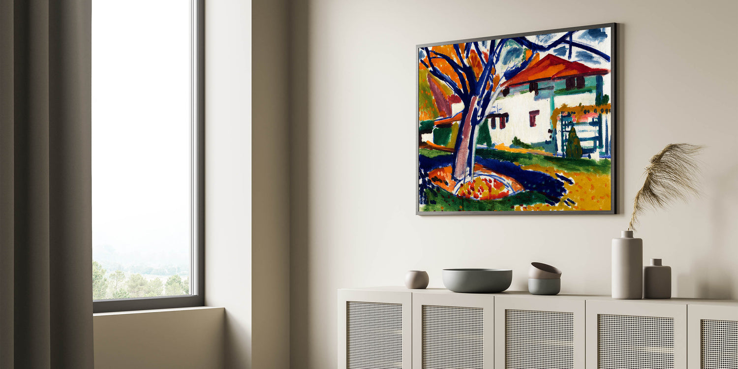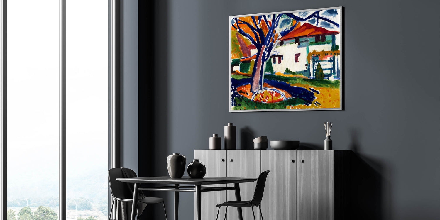 Bring a bold statement to your home with this striking modern wall art inspired by Henry Lyman Sayen's "Blue Trees" (1915–1916). This dynamic composition features vibrant blue tree branches, a lively mix of autumn tones, and a charming white house in the background. The bold brushstrokes and energetic color palette capture the essence of modern expressionism, making it an ideal piece for contemporary art lovers.