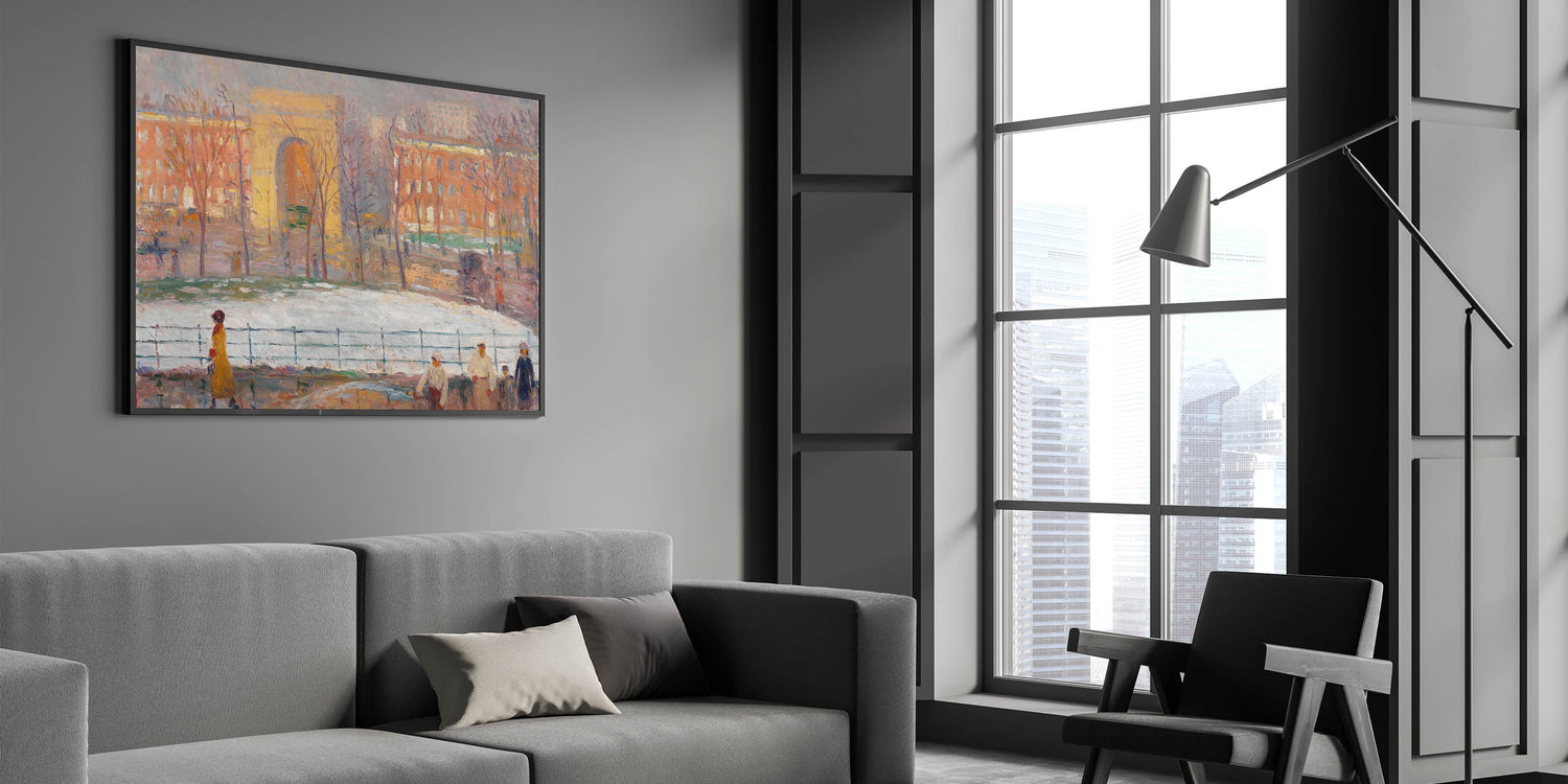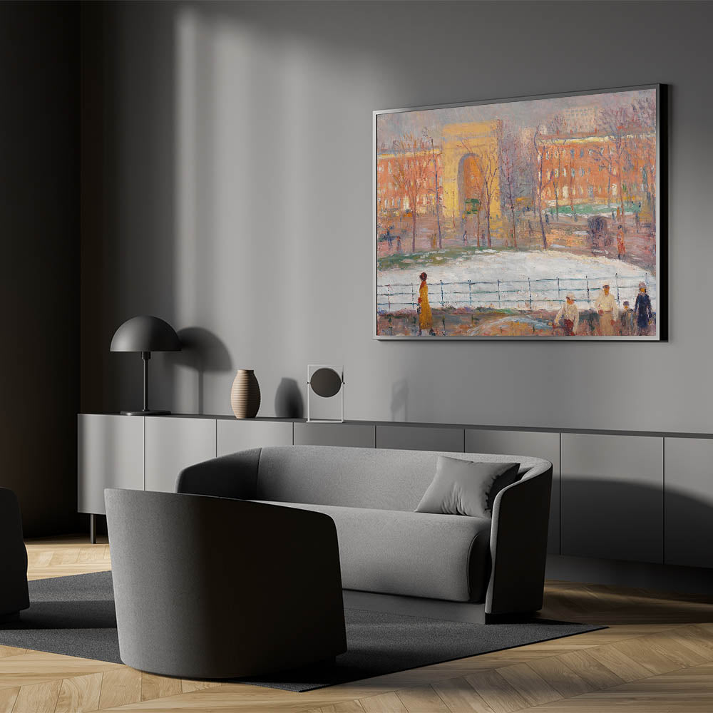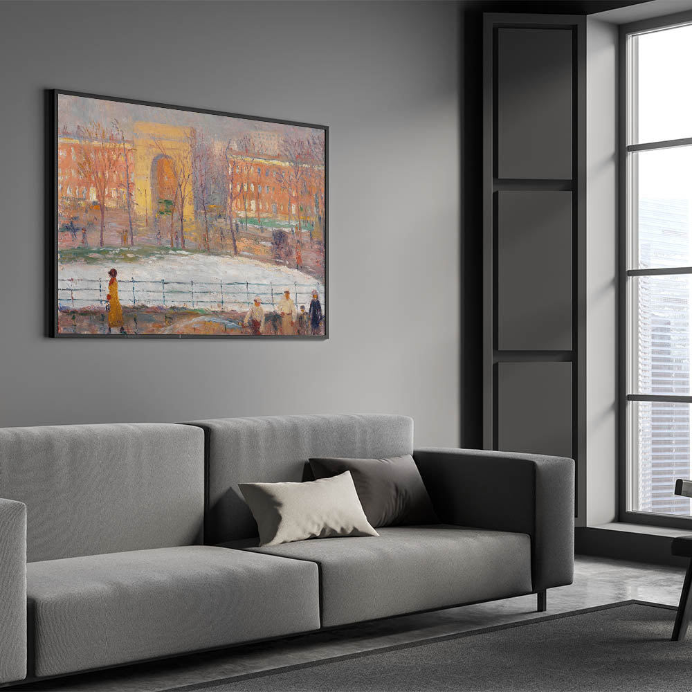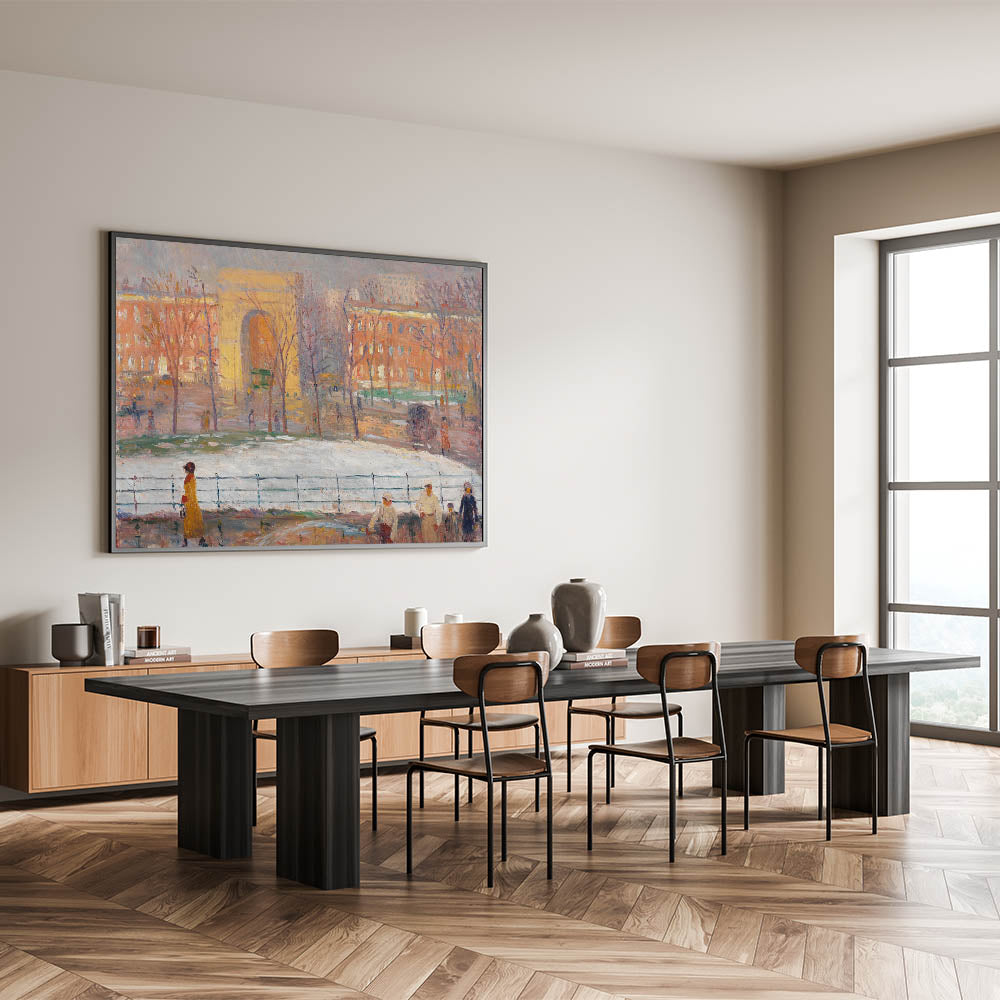 Capture the essence of a bustling city with this vibrant piece of modern wall art. Depicting a lively scene at Washington Square, the artwork features street cleaners and passersby set against a backdrop of warm red brick buildings and a glowing arch. The soft pastel tones of the snowy ground and trees create a beautiful contrast, adding depth and atmosphere to the urban setting.