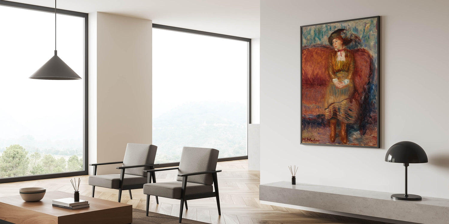 Modern Wall Art - Woman Seated on Red Sofa in Vibrant Impressionist Style