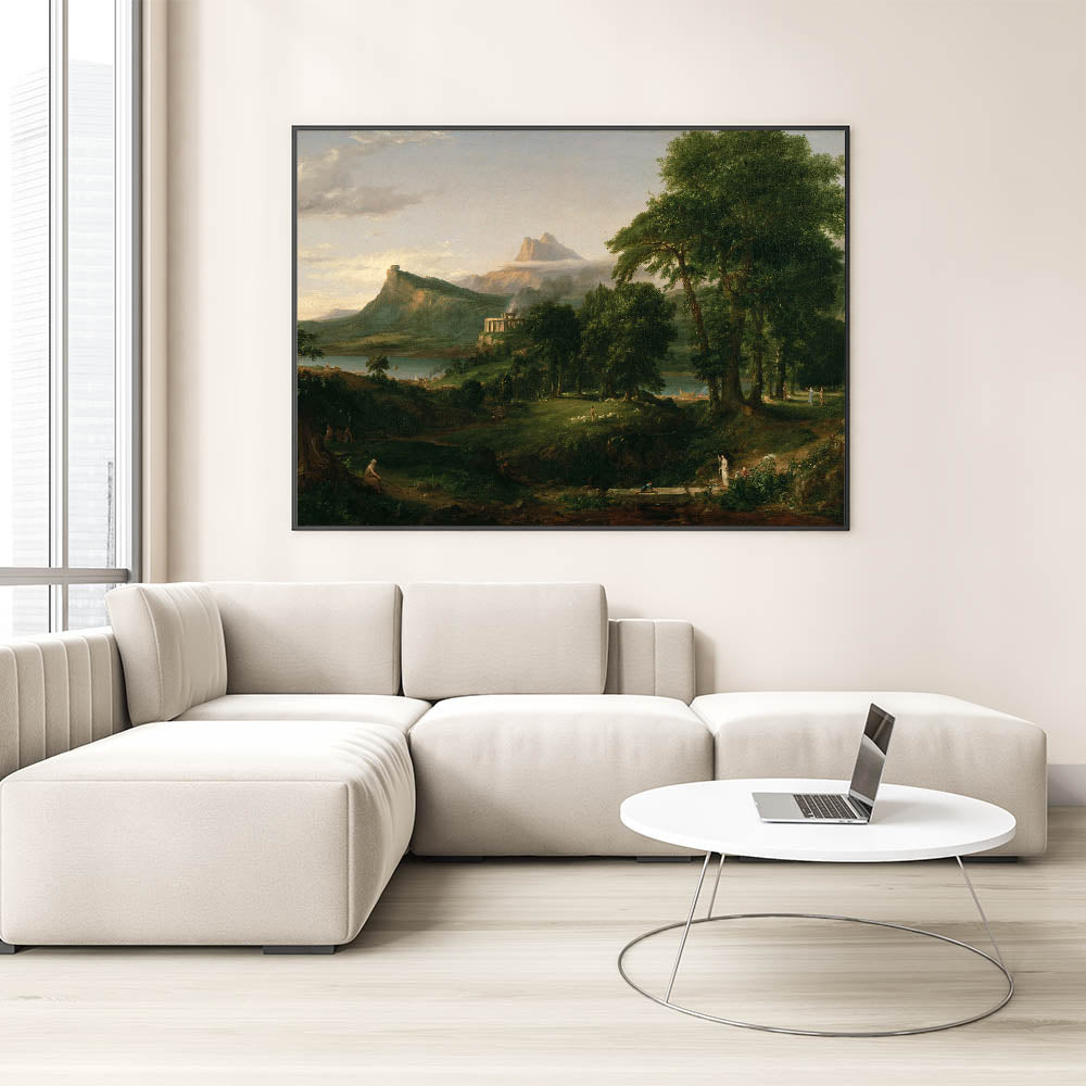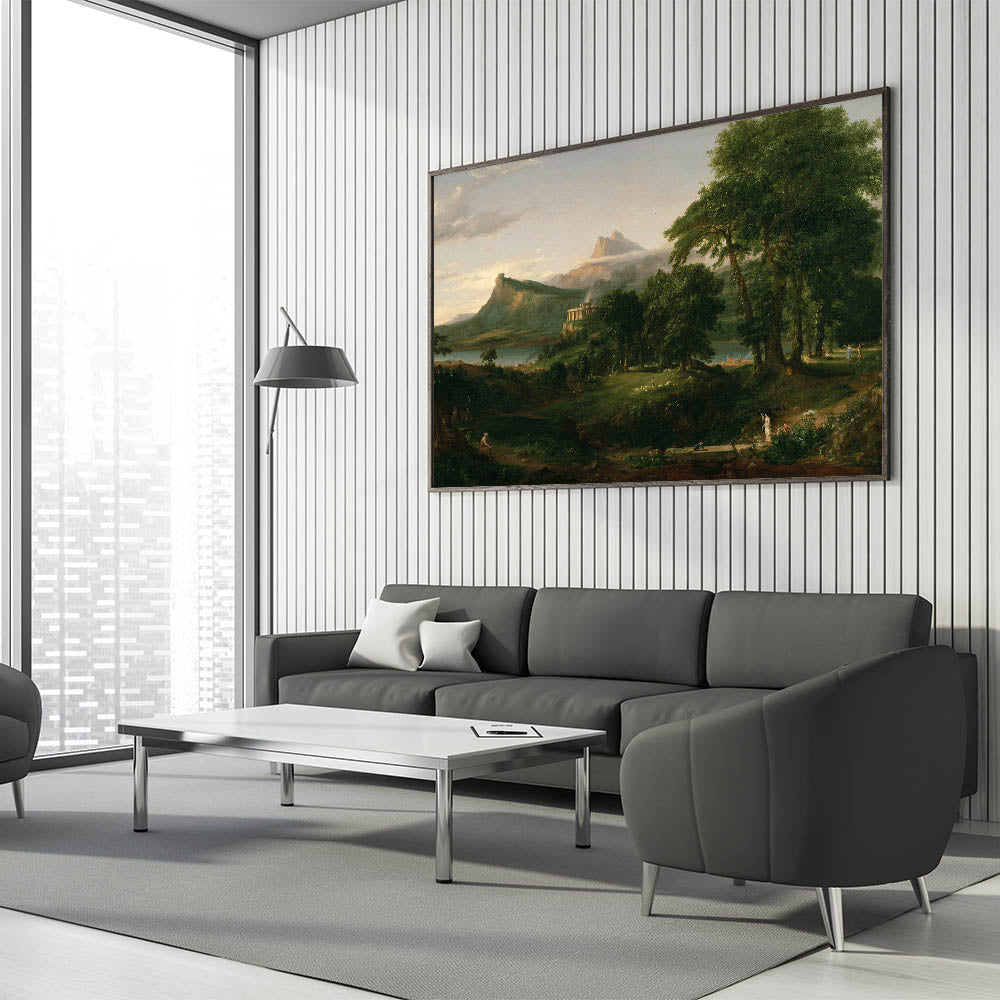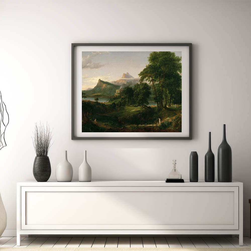 Transform your space with the idyllic charm of Romanticism style wall art through this breathtaking pastoral landscape by Thomas Cole. Part of the renowned series The Course of Empire, this artwork captures the beauty of nature and harmonious living, hallmark themes of the Romantic era. With its verdant greenery, serene waters, and classical architecture, this piece evokes a timeless sense of peace and balance.