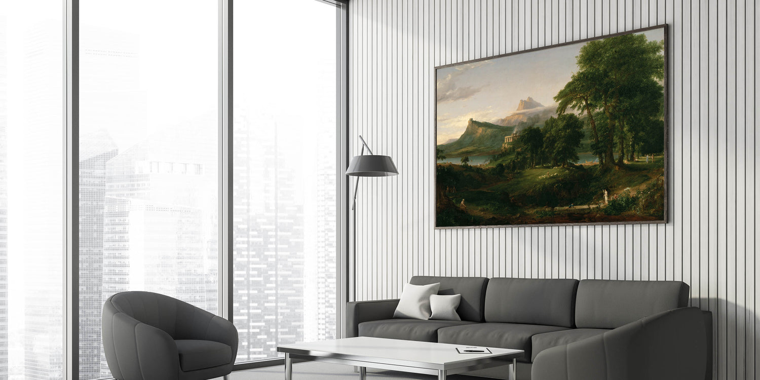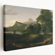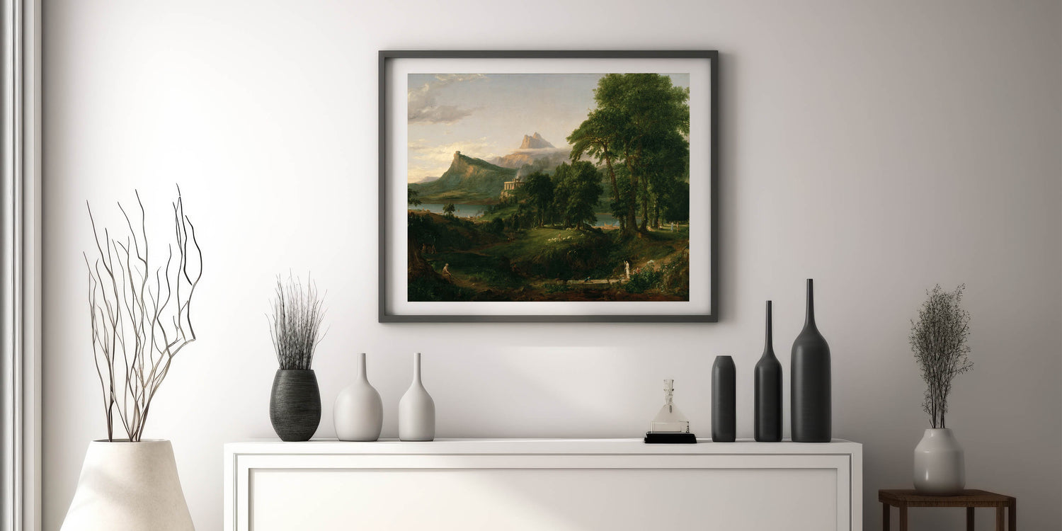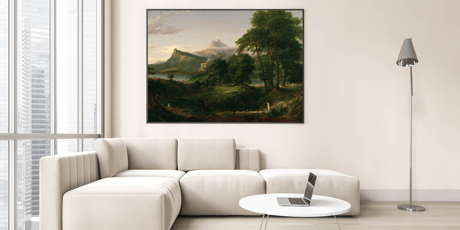 Transform your space with the idyllic charm of Romanticism style wall art through this breathtaking pastoral landscape by Thomas Cole. Part of the renowned series The Course of Empire, this artwork captures the beauty of nature and harmonious living, hallmark themes of the Romantic era. With its verdant greenery, serene waters, and classical architecture, this piece evokes a timeless sense of peace and balance.