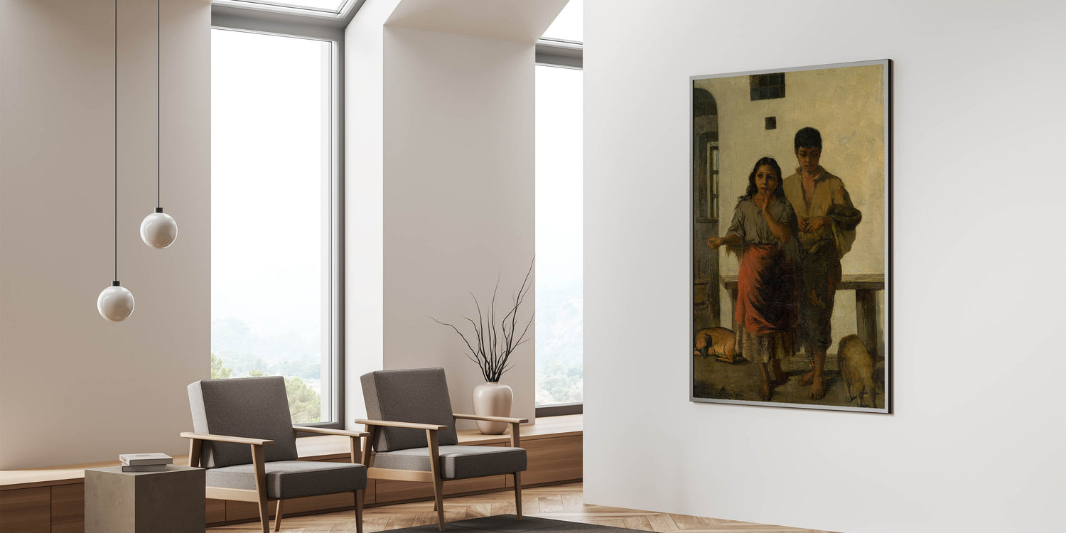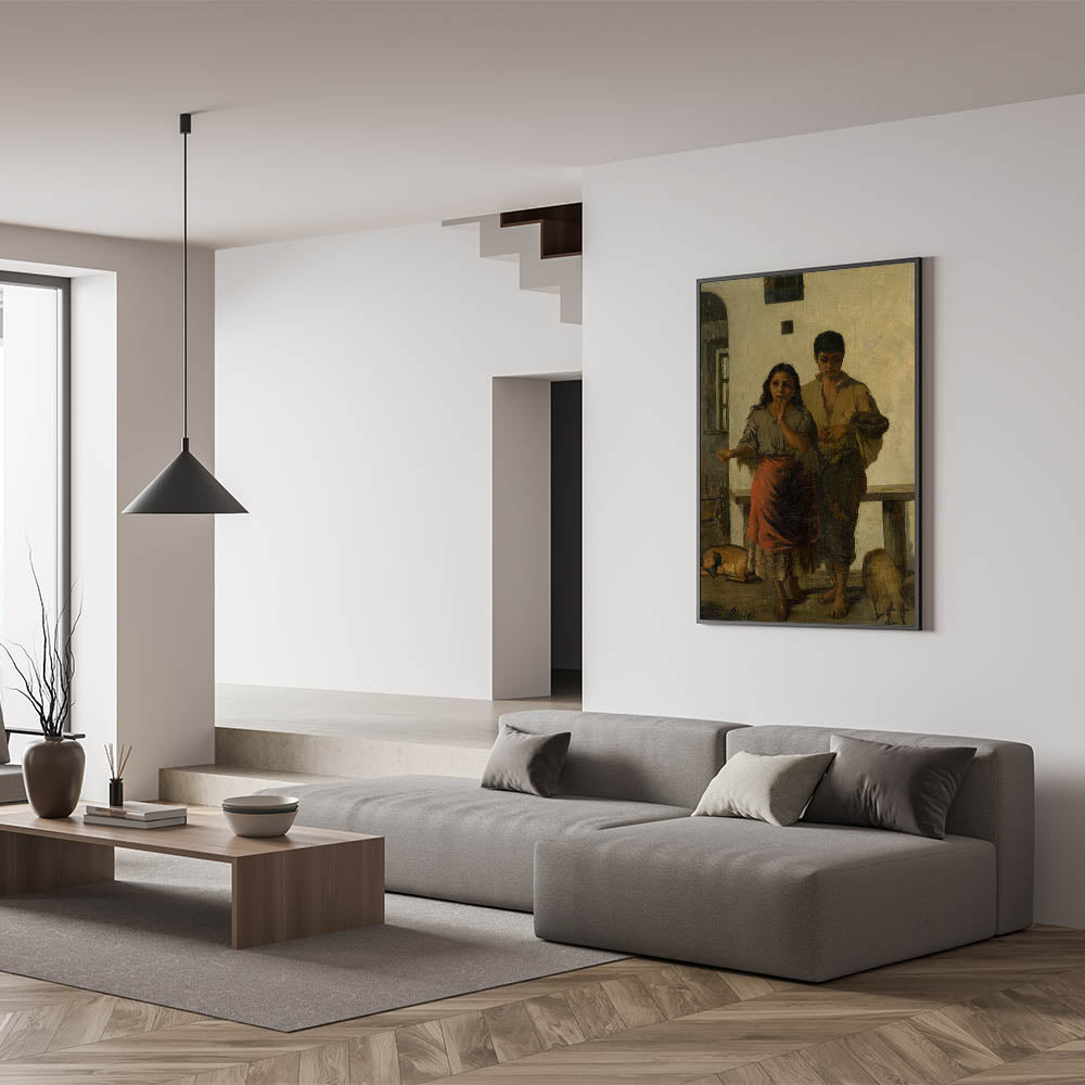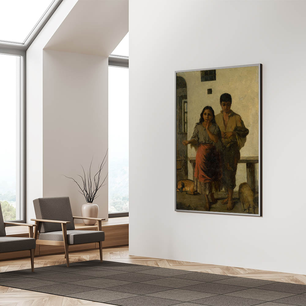 Add a touch of rustic charm to your decor with "A Gypsy with a Gypsy Woman," a captivating Realism art piece that portrays two figures in a modest interior setting. The artist captures the depth of emotion in their expressions, emphasizing themes of resilience and companionship. The subdued tones and intricate details create an intimate scene that brings warmth and storytelling to any room.