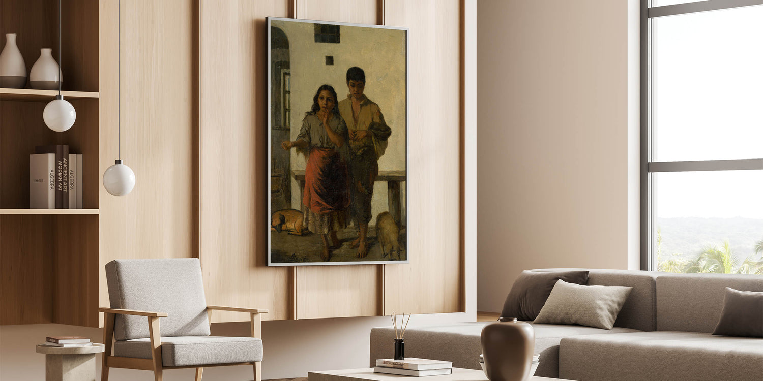 - Realism art print featuring rustic, earth-toned colors and expressive figures
