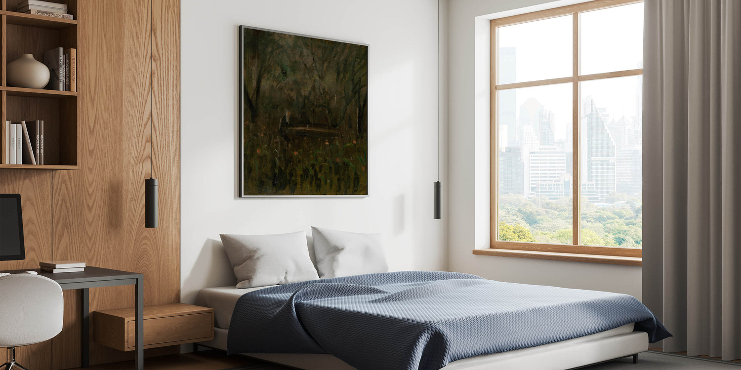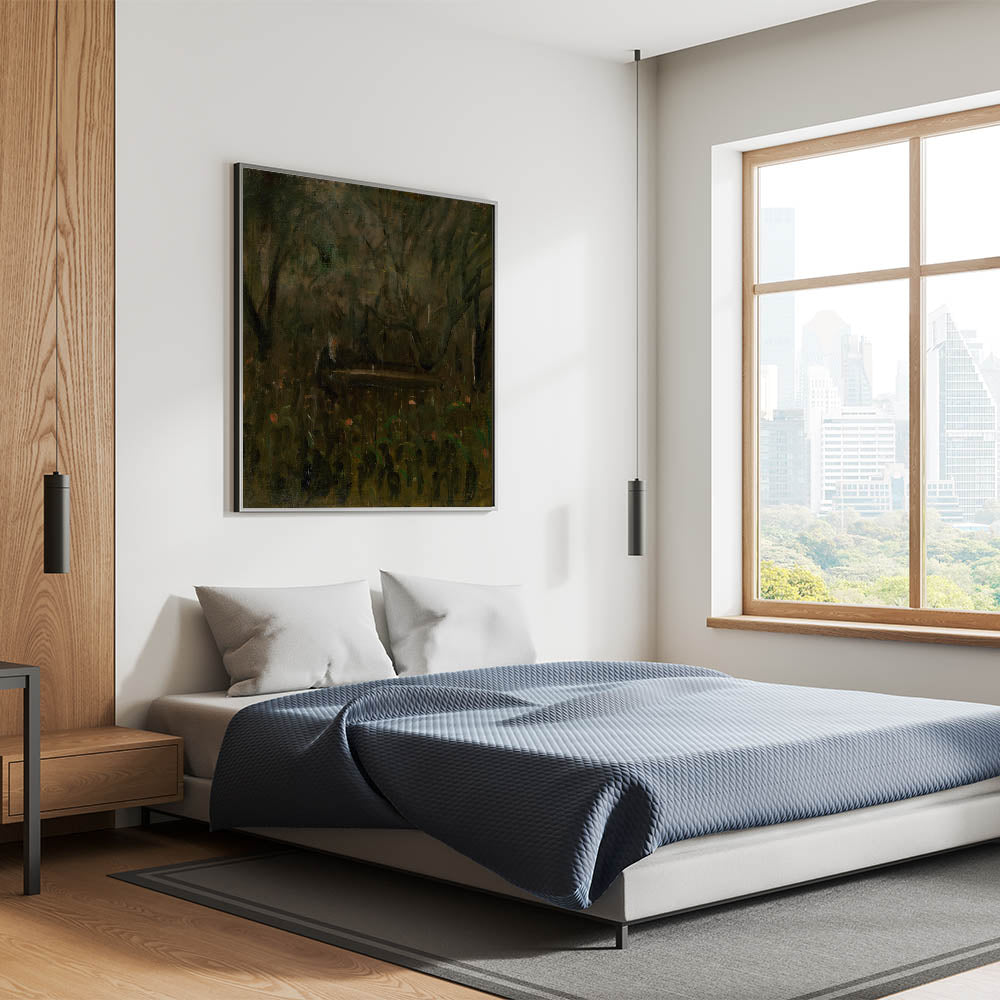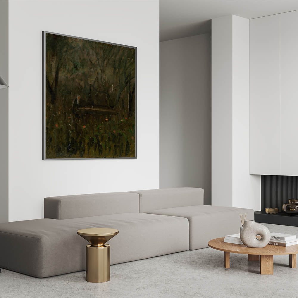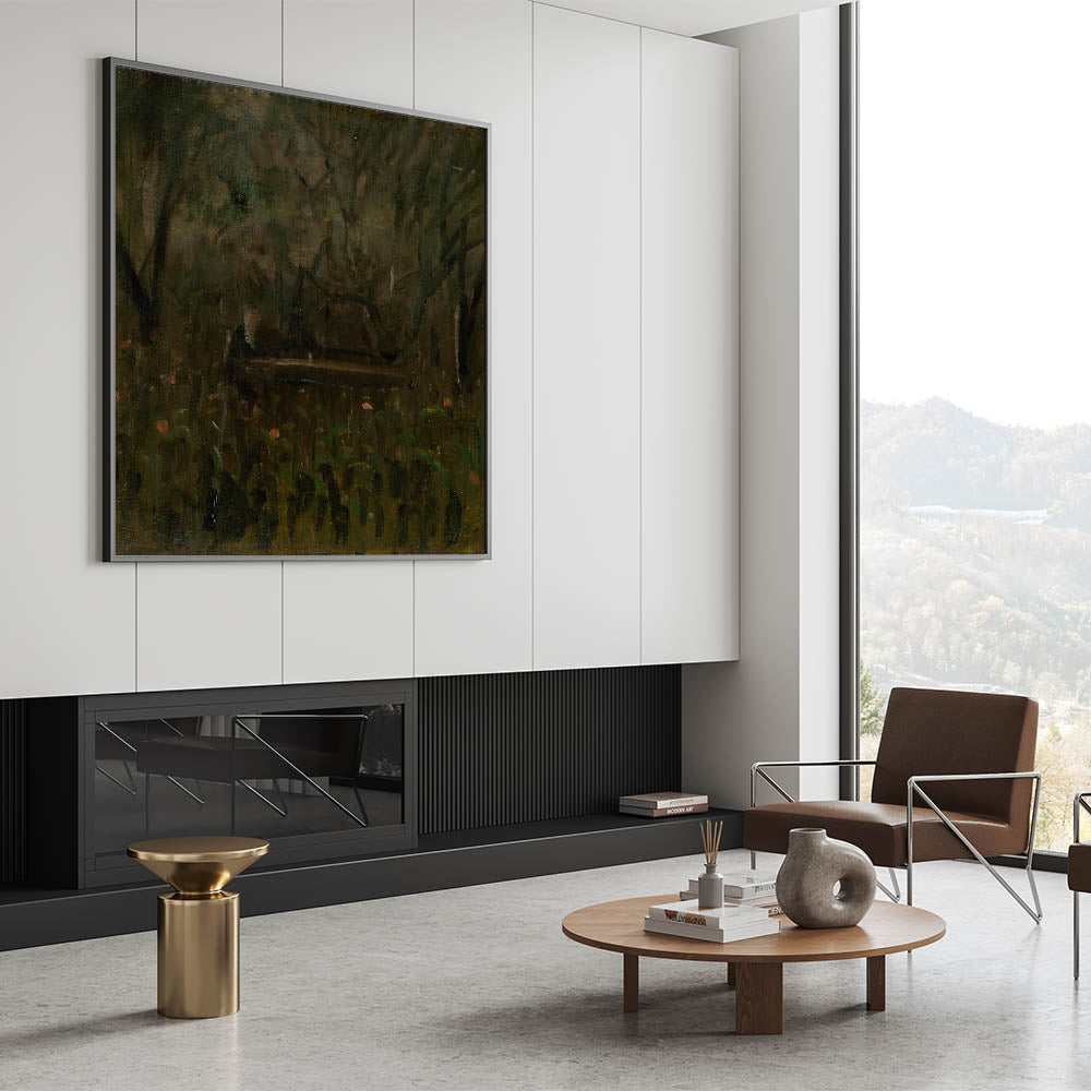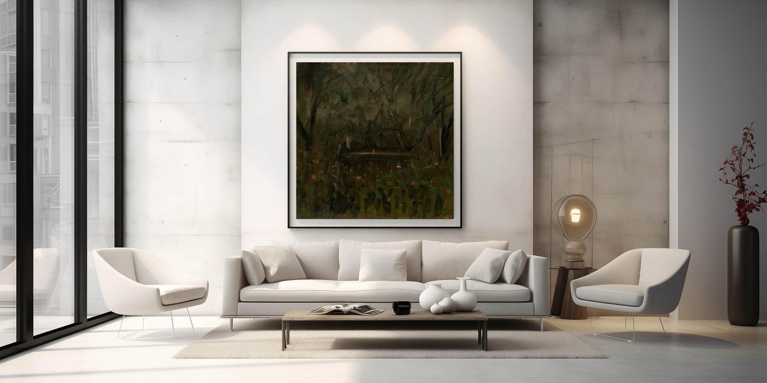 Add an aura of mystery and depth to your space with "In the Garden at the Table" by László Mednyánszky. This captivating Realism artwork portrays a shadowed garden scene, where dim light filters through dense foliage, hinting at a quiet figure seated at a table amidst the greenery. The rich, dark tones and nuanced brushstrokes evoke a sense of solitude and introspection, making it an ideal choice for art enthusiasts who appreciate emotional depth in their decor.