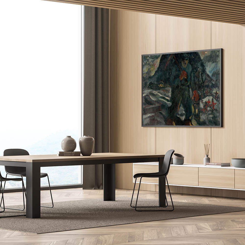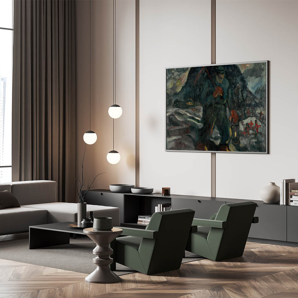 Add Miner to your art collection to bring depth and intensity to your space. This powerful piece of art realism reflects the strength of the human spirit, making it a captivating addition to any setting.