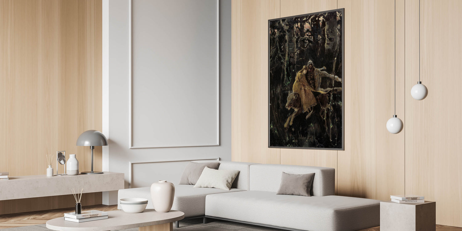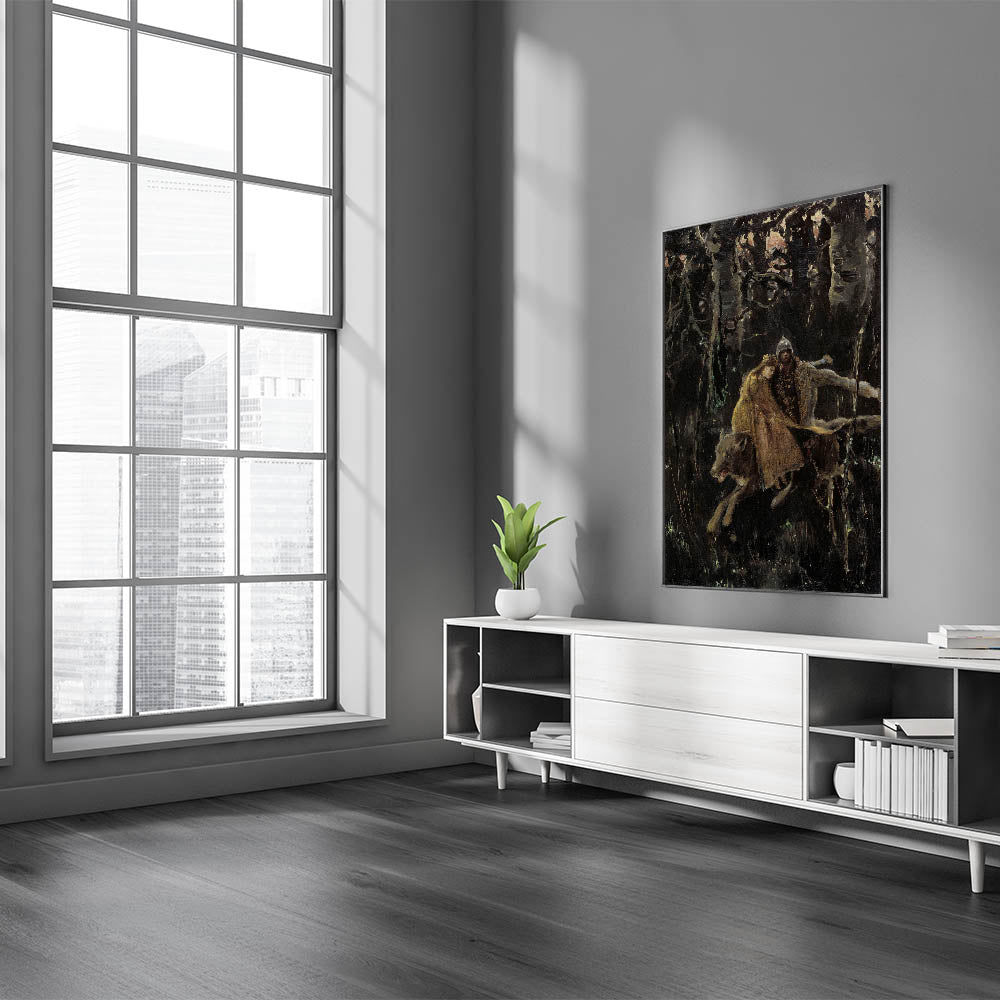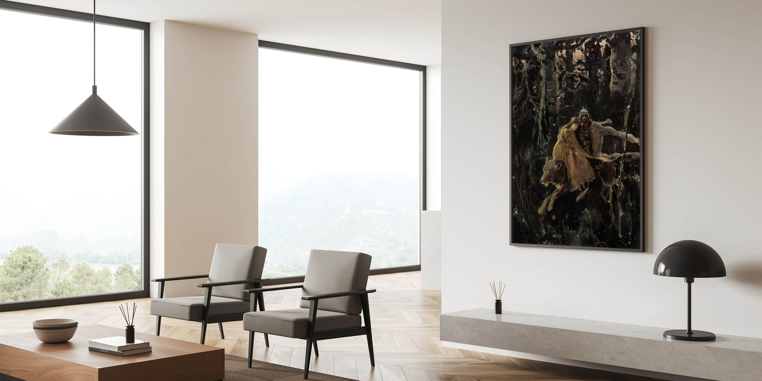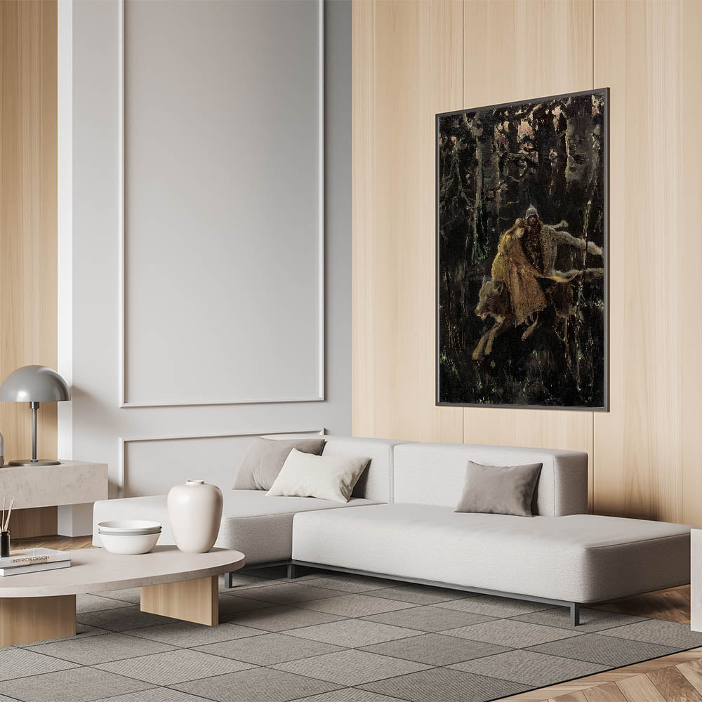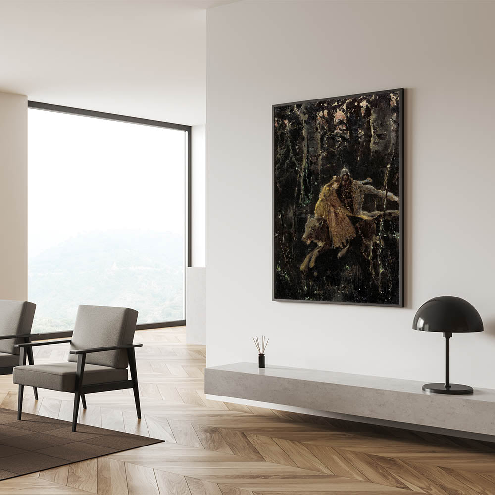 Bring a sense of adventure and mystery to your space with this Realism art print featuring an iconic scene of a prince and a maiden escaping through a dark forest on a wild beast. This realistic painting, with its detailed brushstrokes and rich, earthy tones, captures the tension and courage of the characters, making it a timeless choice for lovers of classical art. The shadowy forest and the powerful creature emphasize the bravery and vulnerability present in this epic moment.