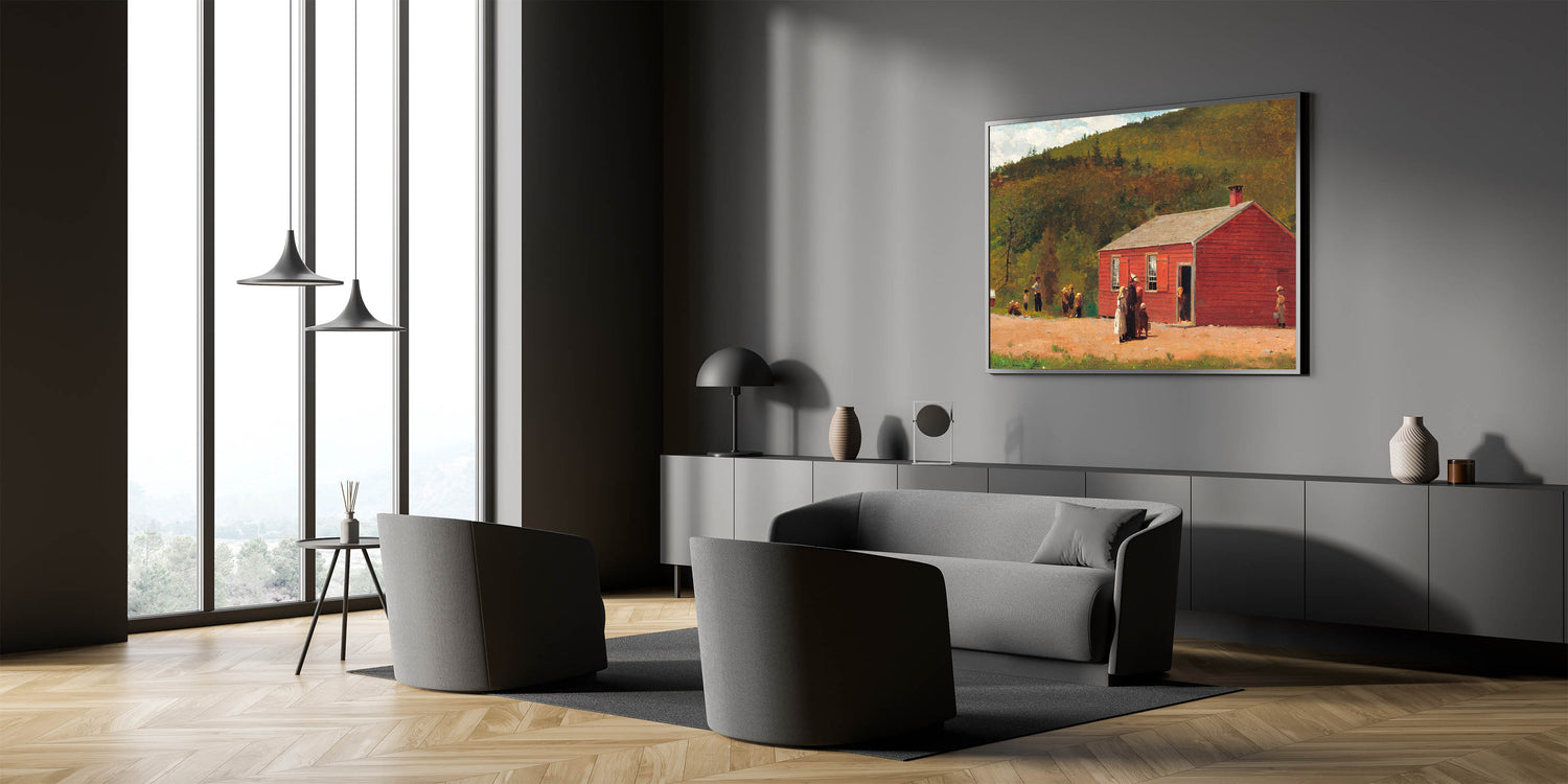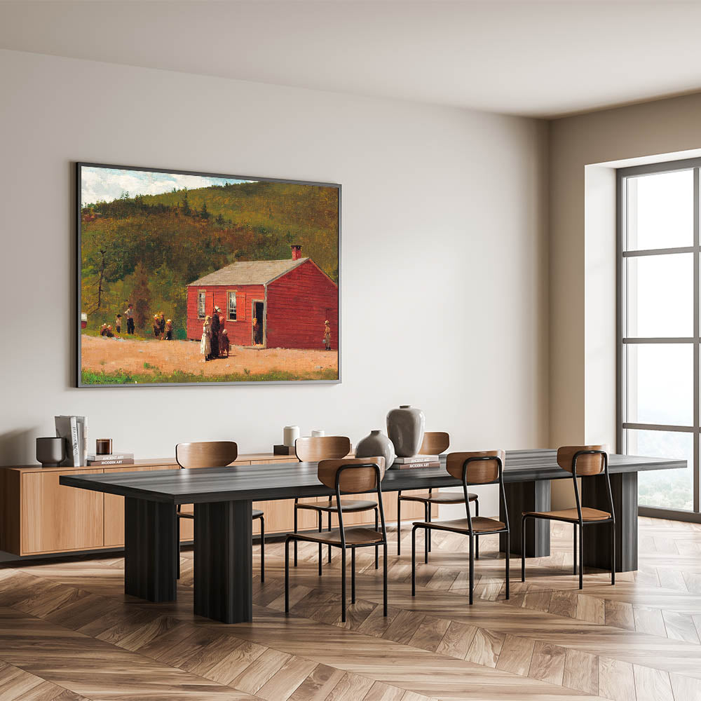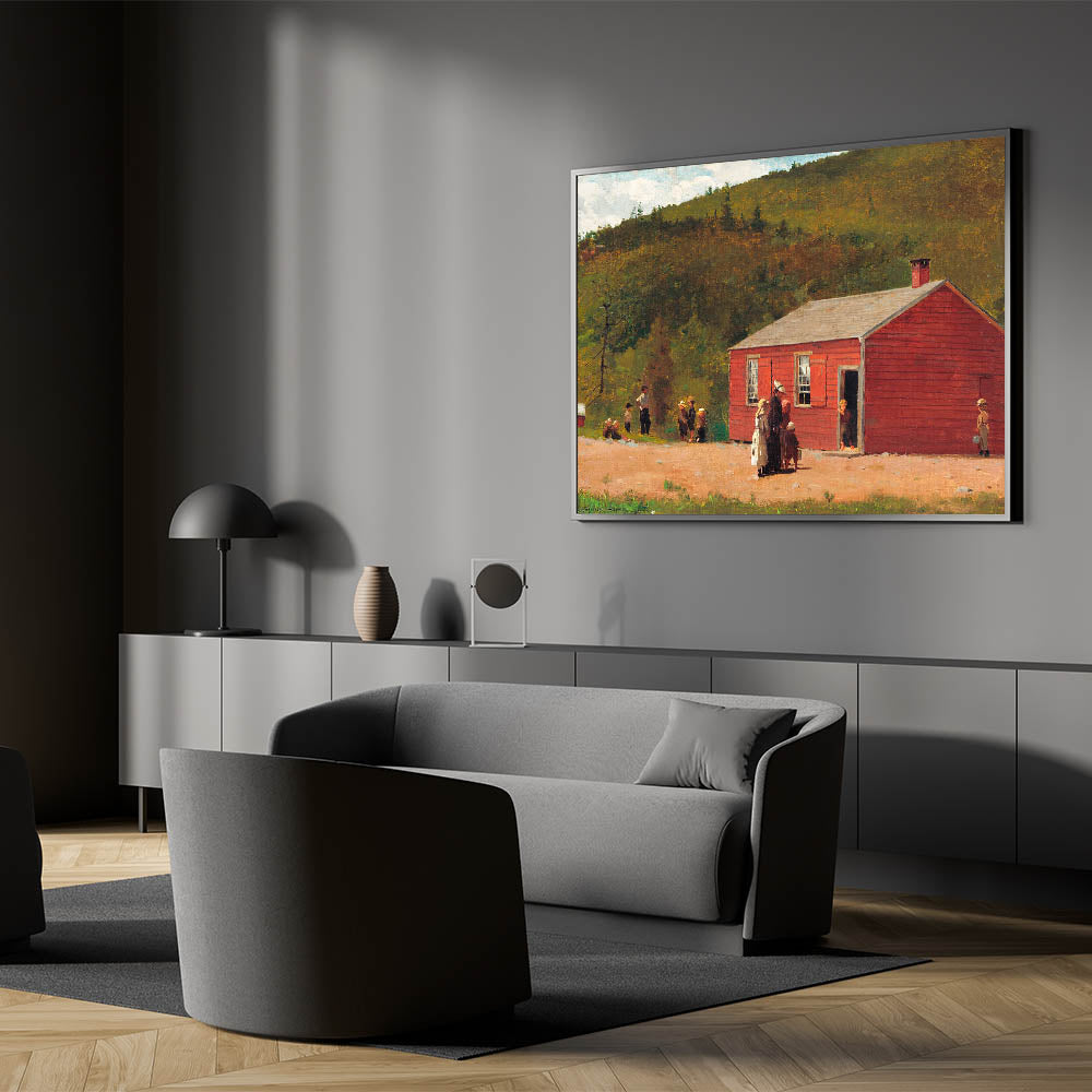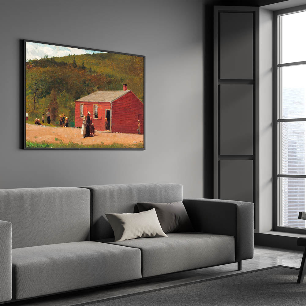 Capture the essence of rural life with this beautifully detailed Realism art print, depicting a quaint schoolhouse scene from the late 19th century. This piece, rich in historical and cultural charm, showcases children and adults gathered around a classic red schoolhouse against a lush green landscape. Ideal for lovers of classical realism and historical art, this print adds a nostalgic, timeless feel to any space.