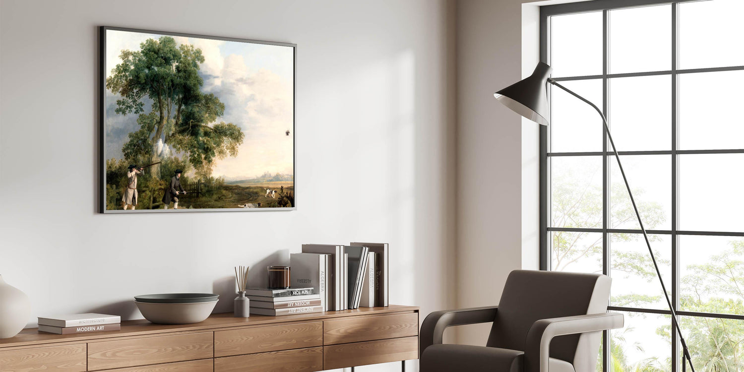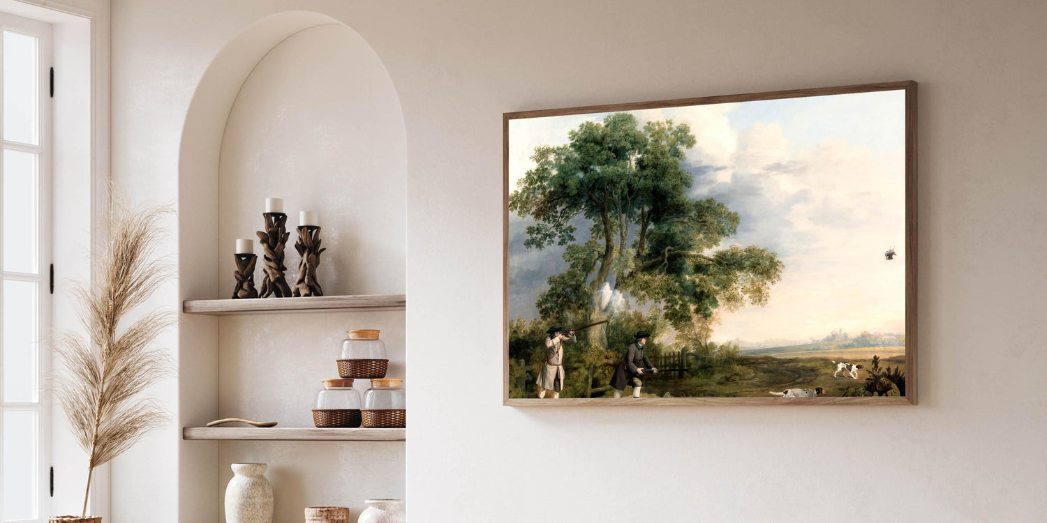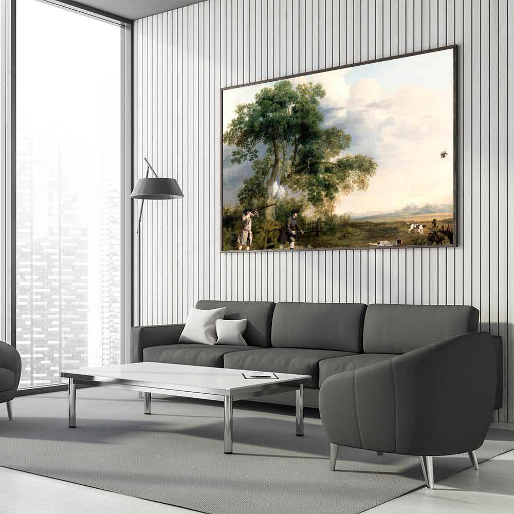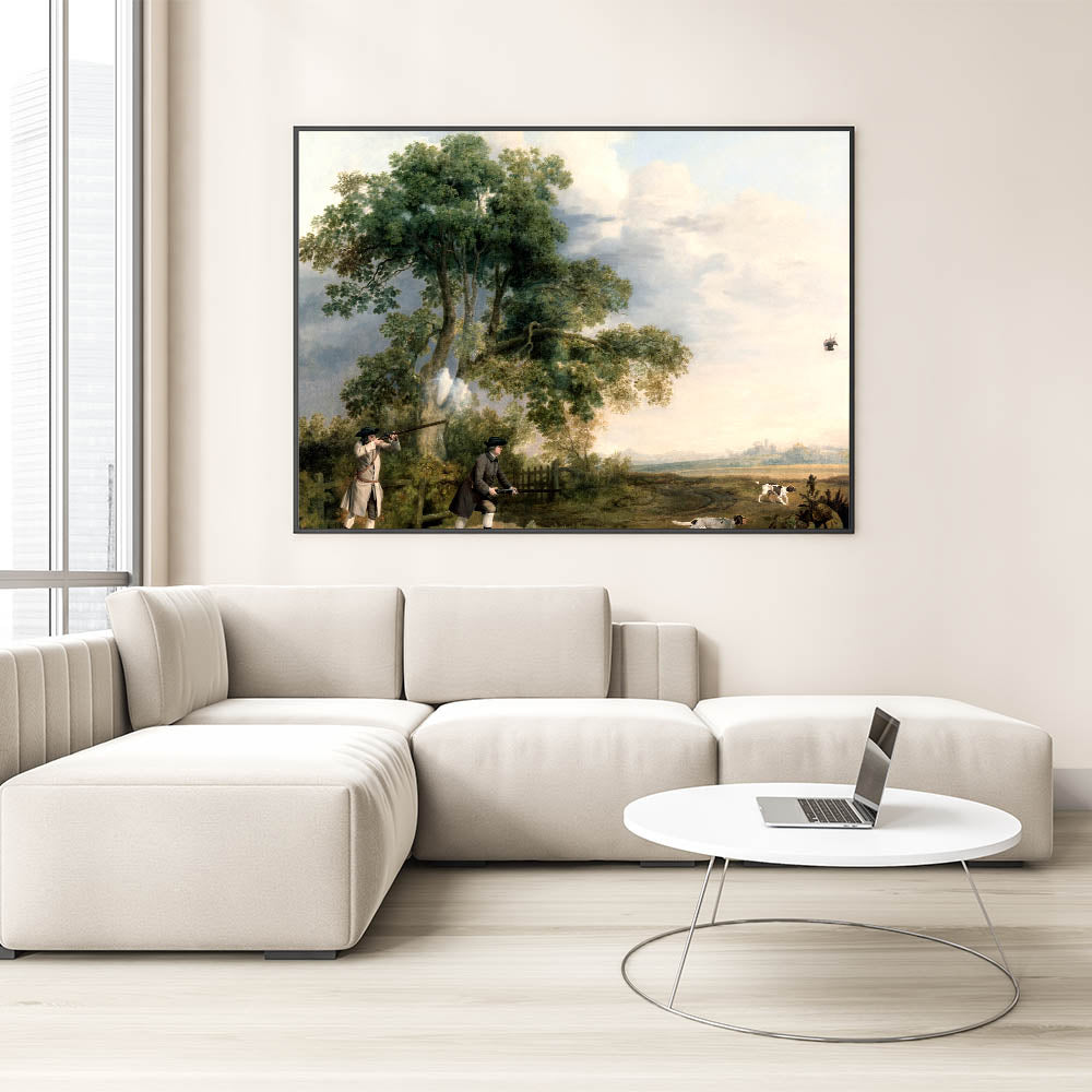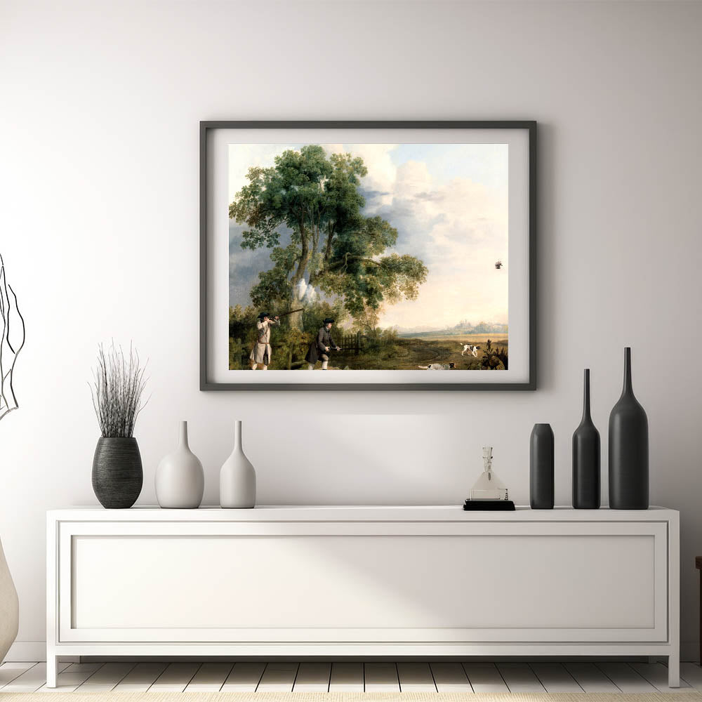 Capture the elegance of traditional sporting life with Two Gentlemen Shooting by George Stubbs, a classic realism art print depicting an 18th-century hunting scene. This artwork illustrates two gentlemen accompanied by their loyal hunting dogs, immersed in the countryside, skillfully capturing the moment of a bird taking flight. Ideal for those who appreciate historical themes and fine art realism, this piece brings a refined sense of nature and sport into your space.