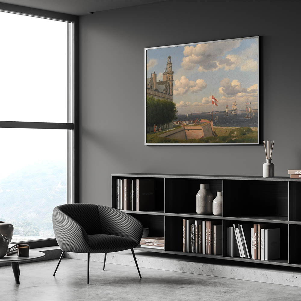 This captivating Realism artwork, View from Kronborg by C.W. Eckersberg, offers a picturesque scene of Denmark’s iconic Kronborg Castle overlooking the Sound, with a glimpse of ships on the water heading toward the Swedish coast. Eckersberg's keen eye for detail and perspective is evident in the meticulous rendering of the castle, flag, and ships, all framed by a soft, cloud-filled sky. This piece captures a historical and serene maritime setting, making it a perfect choice for those who appreciate nautical themes and classical Realism.