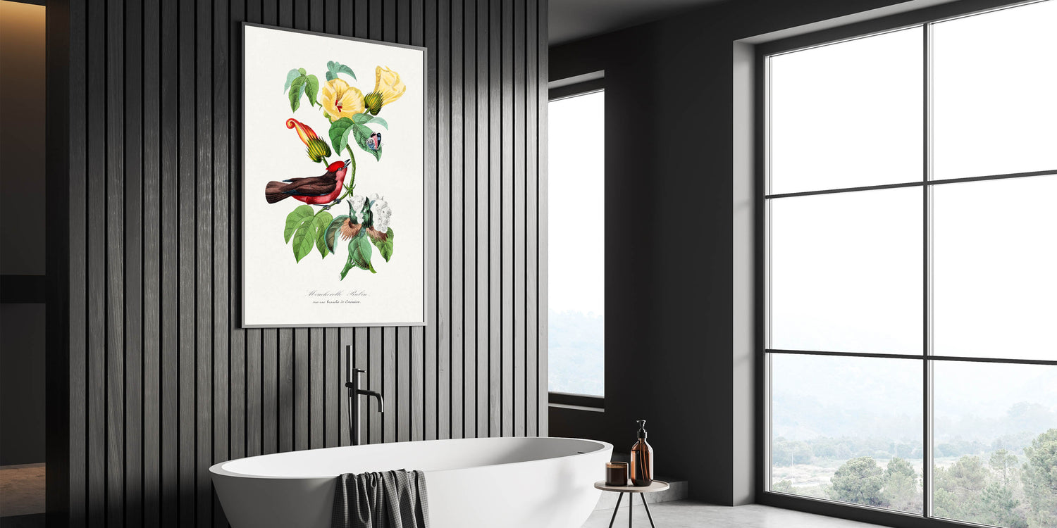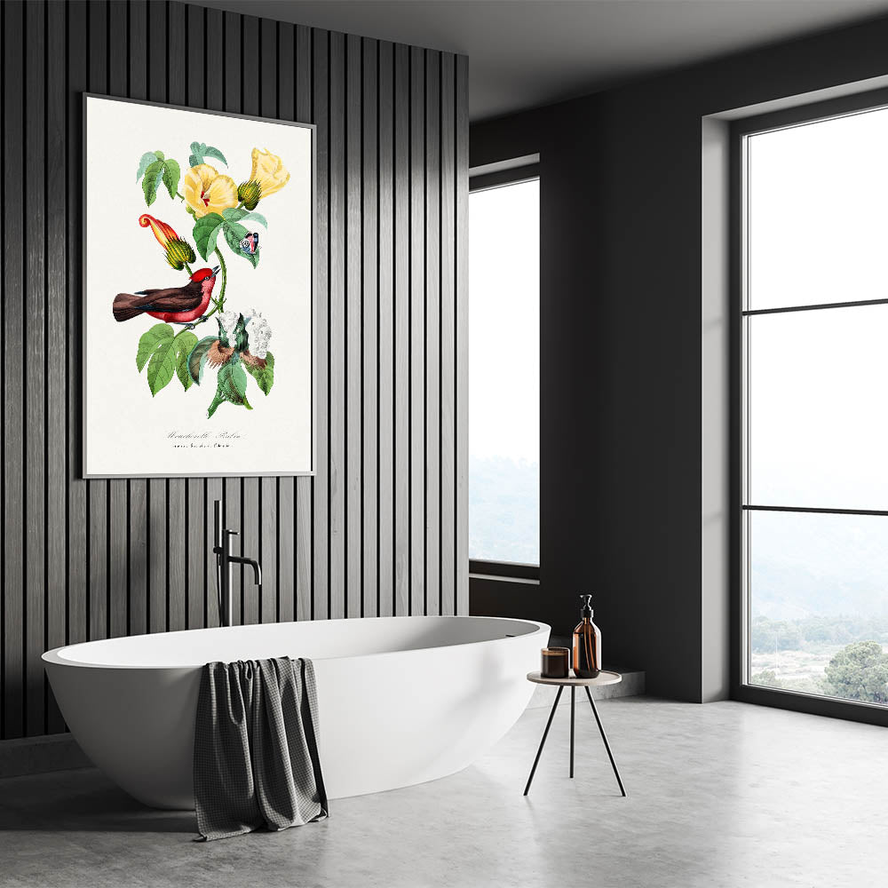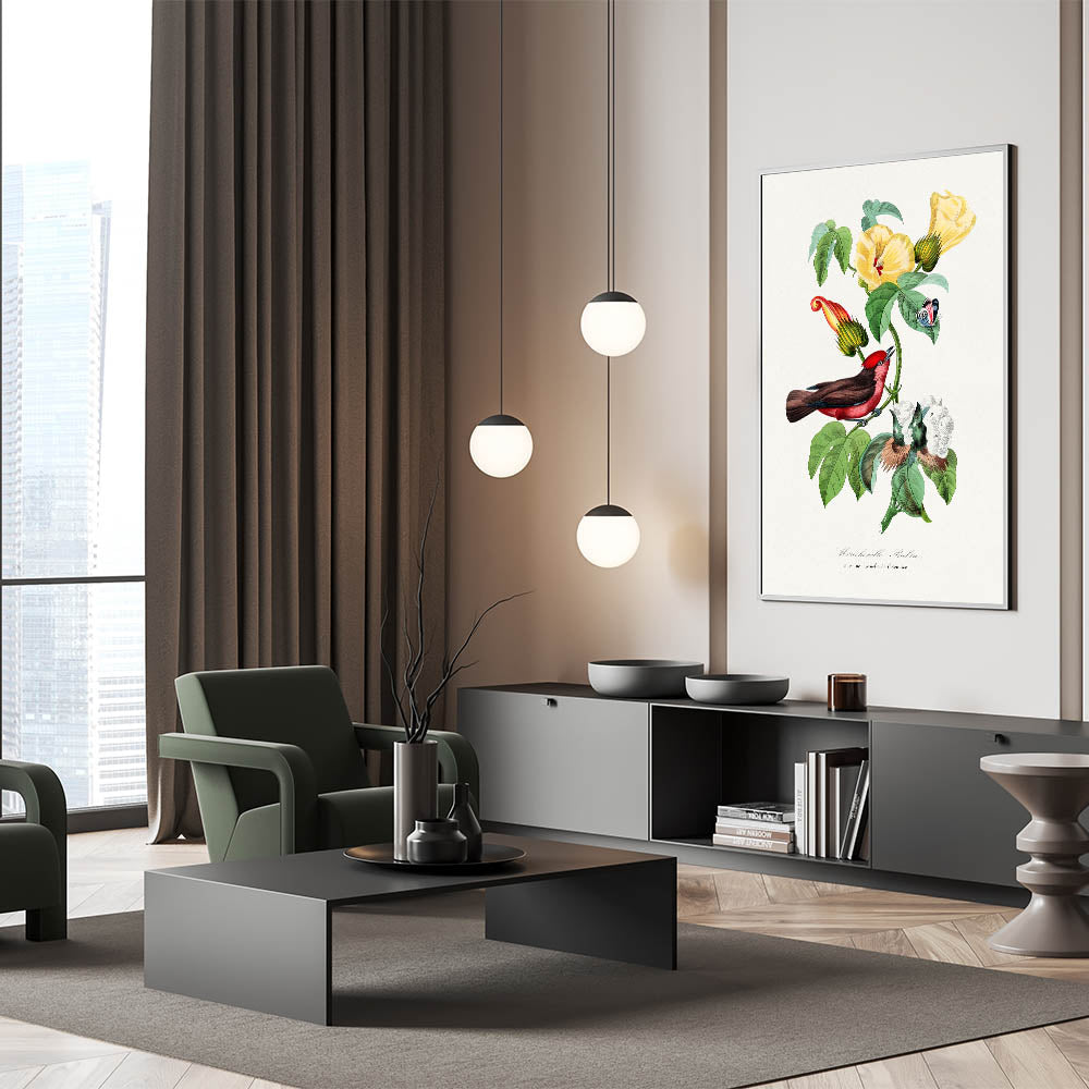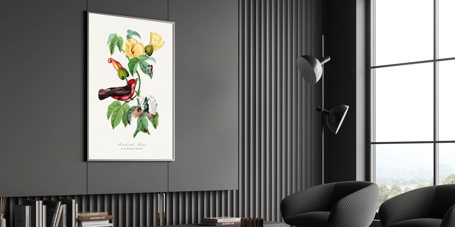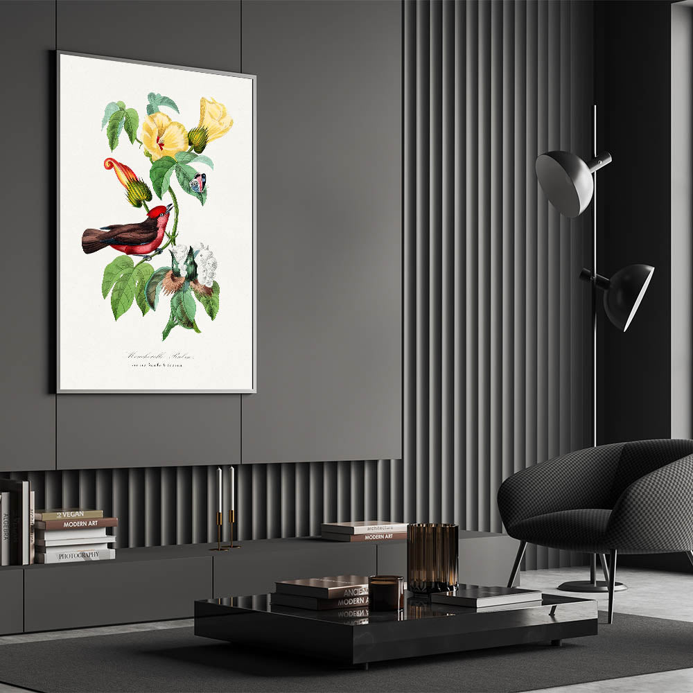 Elevate your interior with the vibrant beauty of Romanticism style wall art, captured in this detailed illustration of a Vermilion Flycatcher perched on a flowering branch. From the 1842 edition of Le Jardin Des Plantes by Paul Gervais, this artwork seamlessly blends scientific observation with artistic elegance. The striking contrast of the bird’s vivid red plumage against the delicate green leaves and yellow blossoms exemplifies the Romantic era's fascination with nature and its beauty.
