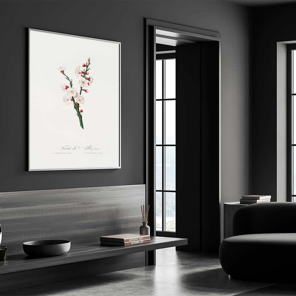 Experience the delicate beauty of nature with this Romanticism-style wall art featuring the Apricot Flower (Prunus Armeniaca) from "Pomona Italiana" by Giorgio Gallesio. This exquisite botanical illustration showcases the fine artistry of the Romantic era, celebrating the elegance of flora with a timeless and detailed depiction of apricot blossoms. Perfect for adding a touch of natural sophistication to any living space.