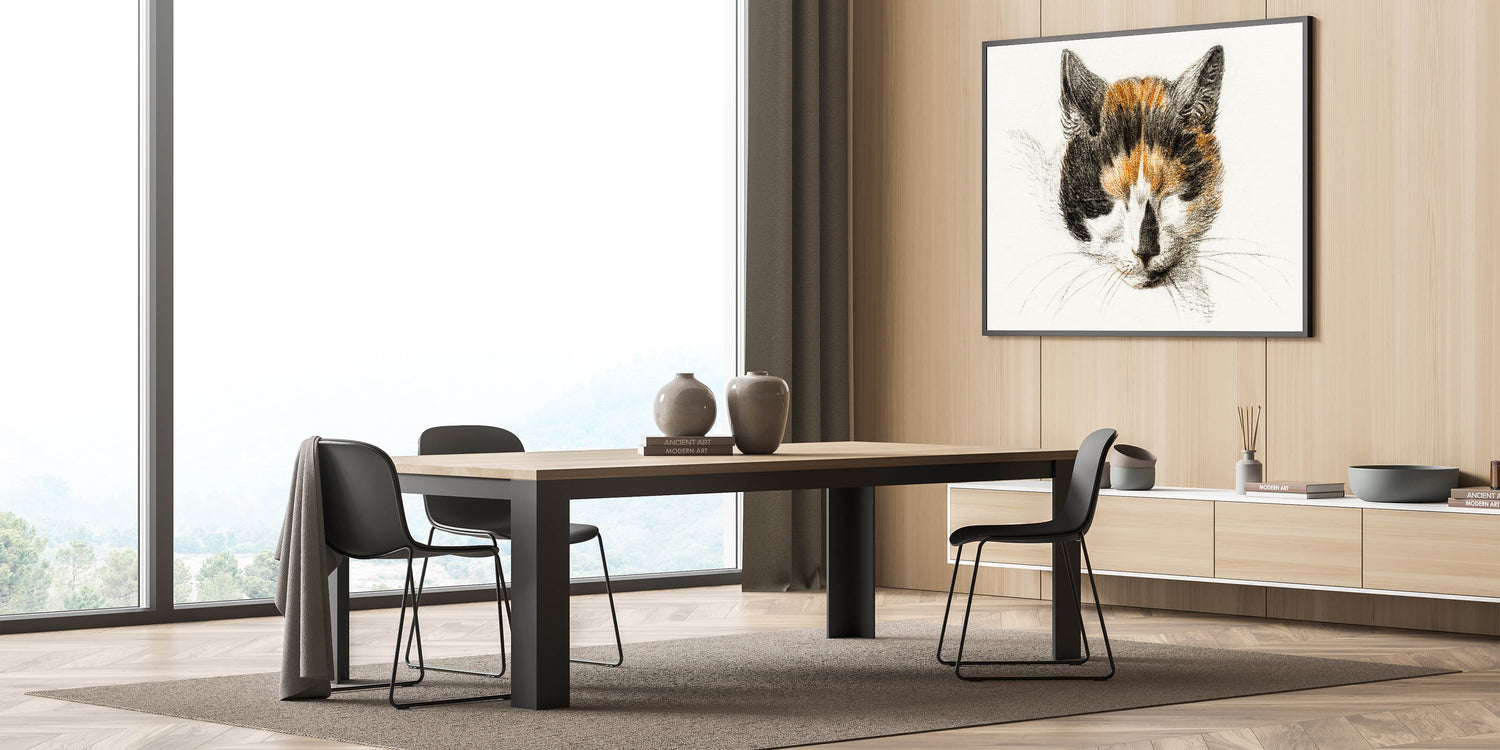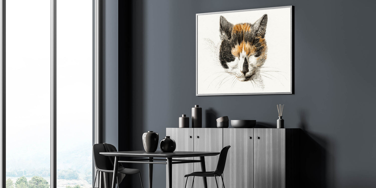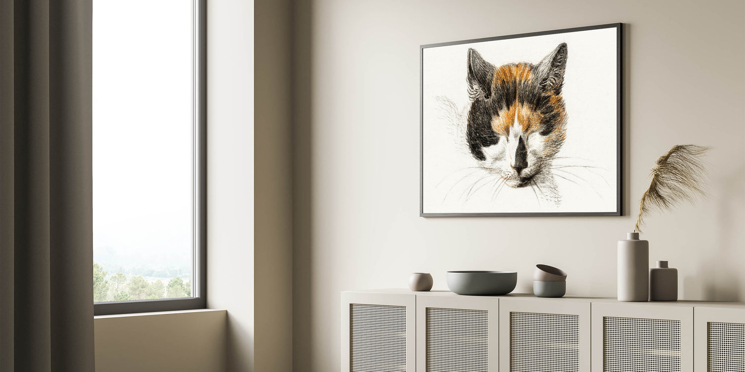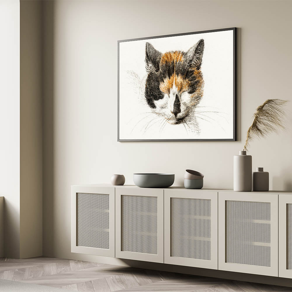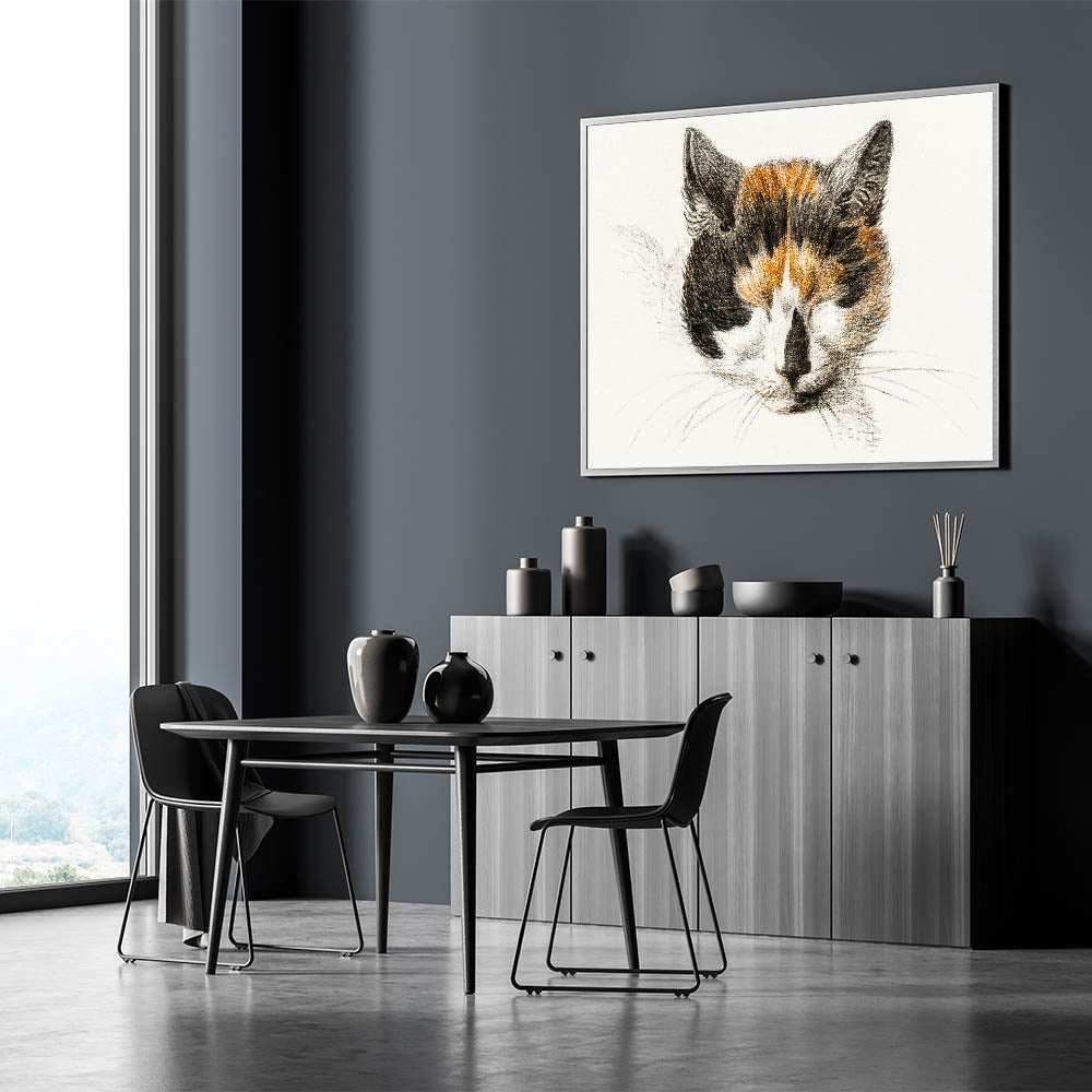 Bring a touch of Romanticism to your home with Head of a Calico Cat with Closed Eyes (1819) by Jean Bernard. This delicate drawing captures the serene beauty of a calico cat in quiet repose, embodying the Romanticism style wall art's appreciation for simple yet profound moments of life. The soft, detailed strokes and warm tones reflect a timeless charm, making it an ideal piece for art lovers and animal enthusiasts alike.