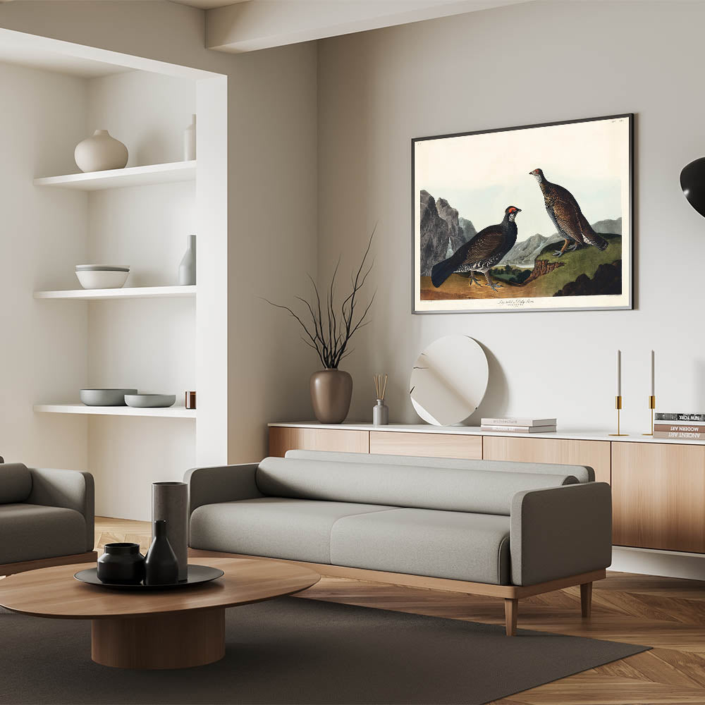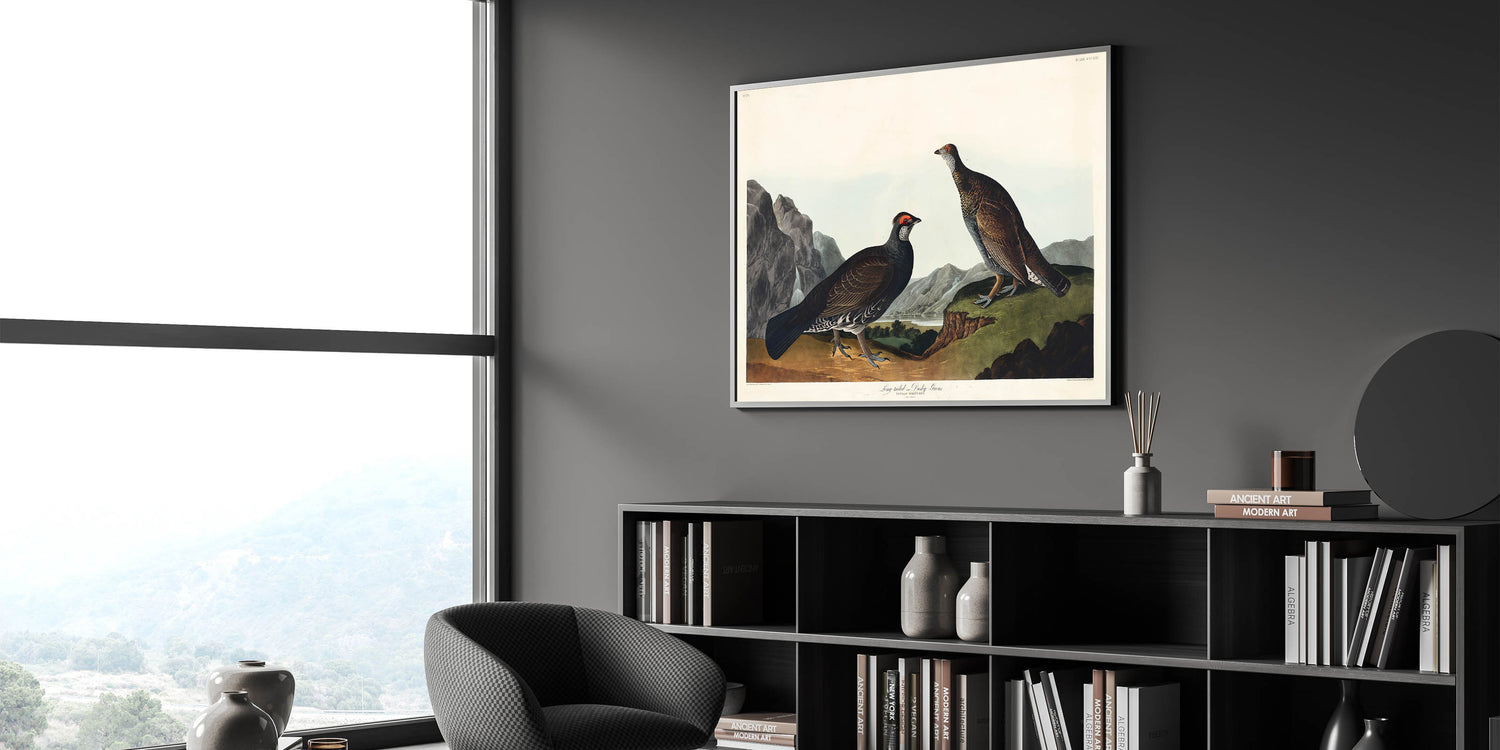 Immerse yourself in the beauty of Romanticism with Long-tailed or Dusky Grouse from Birds of America (1827) by John James Audubon. This exquisite artwork captures the grandeur of nature, showcasing two dusky grouse against a serene mountainous backdrop. Audubon’s attention to detail and emotional landscapes make this piece a hallmark of Romanticism style wall art.