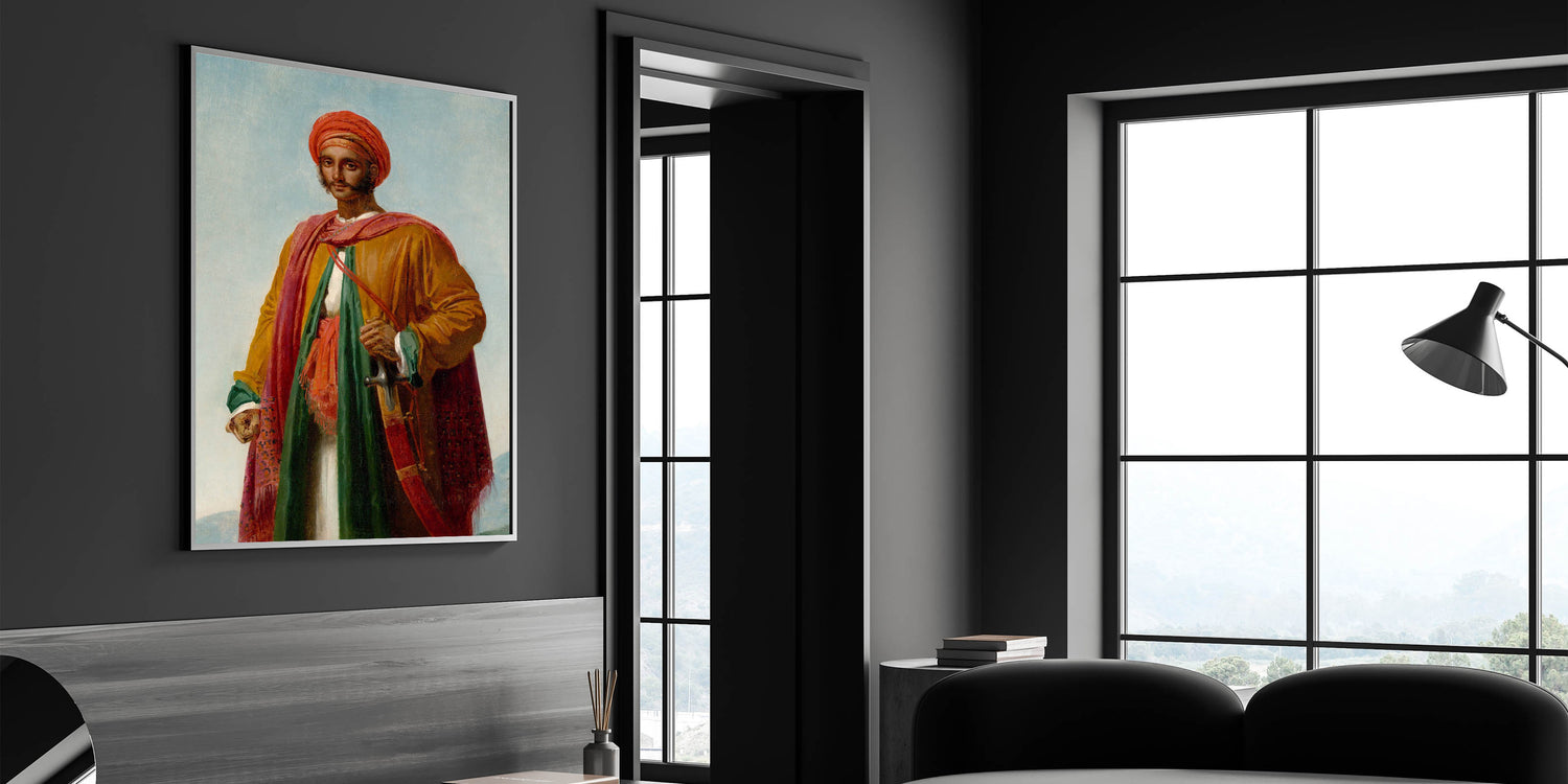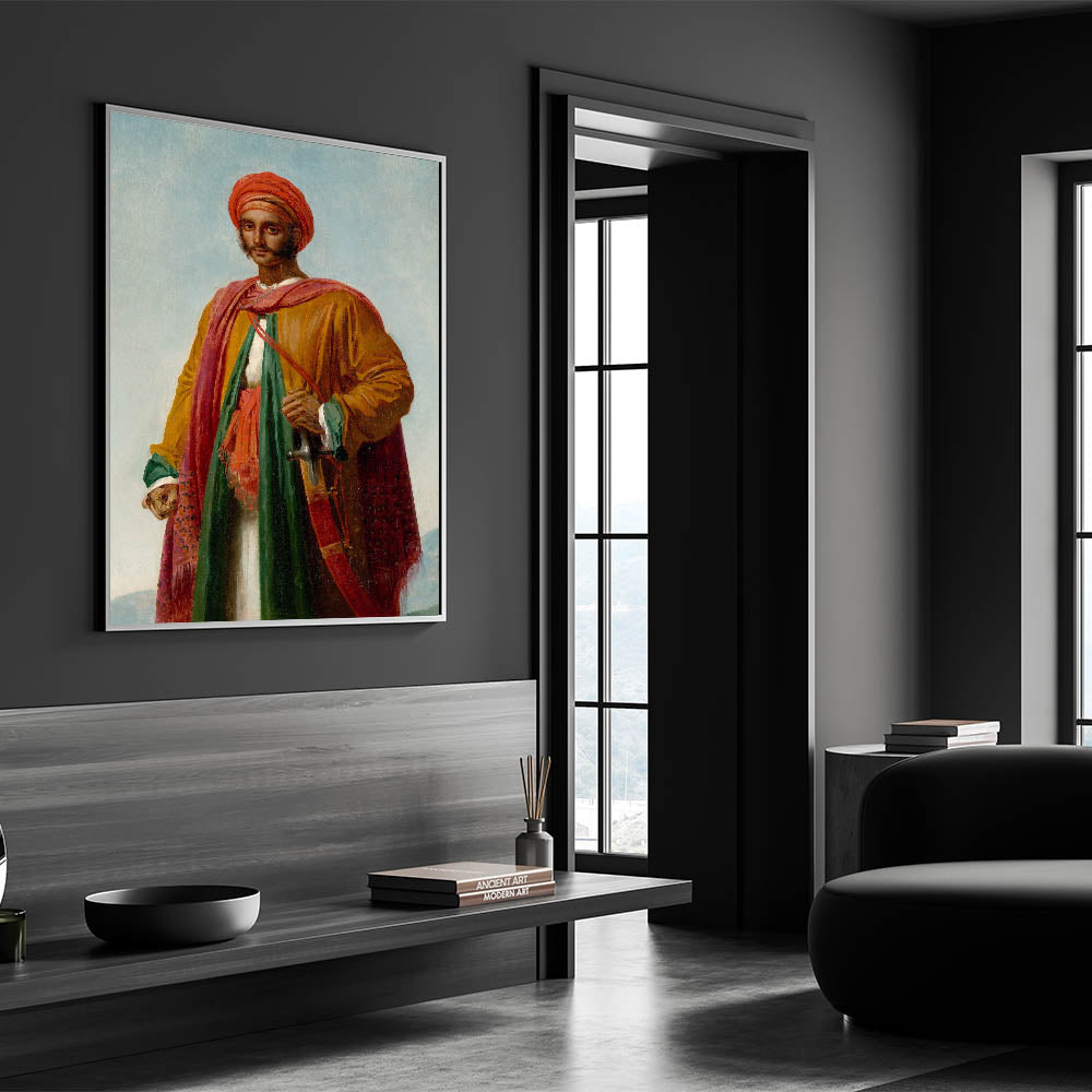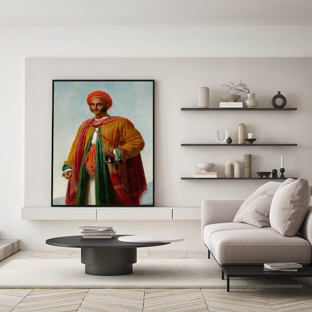 Celebrate the grace and cultural richness of Romanticism with Study for Portrait of an Indian by Anne-Louis Girodet-Trioson. This stunning artwork presents a dignified figure dressed in vibrant traditional attire, holding a finely crafted sword. The detailed brushwork and rich color palette reflect the Romanticism style wall art's fascination with exoticism and cultural exploration.