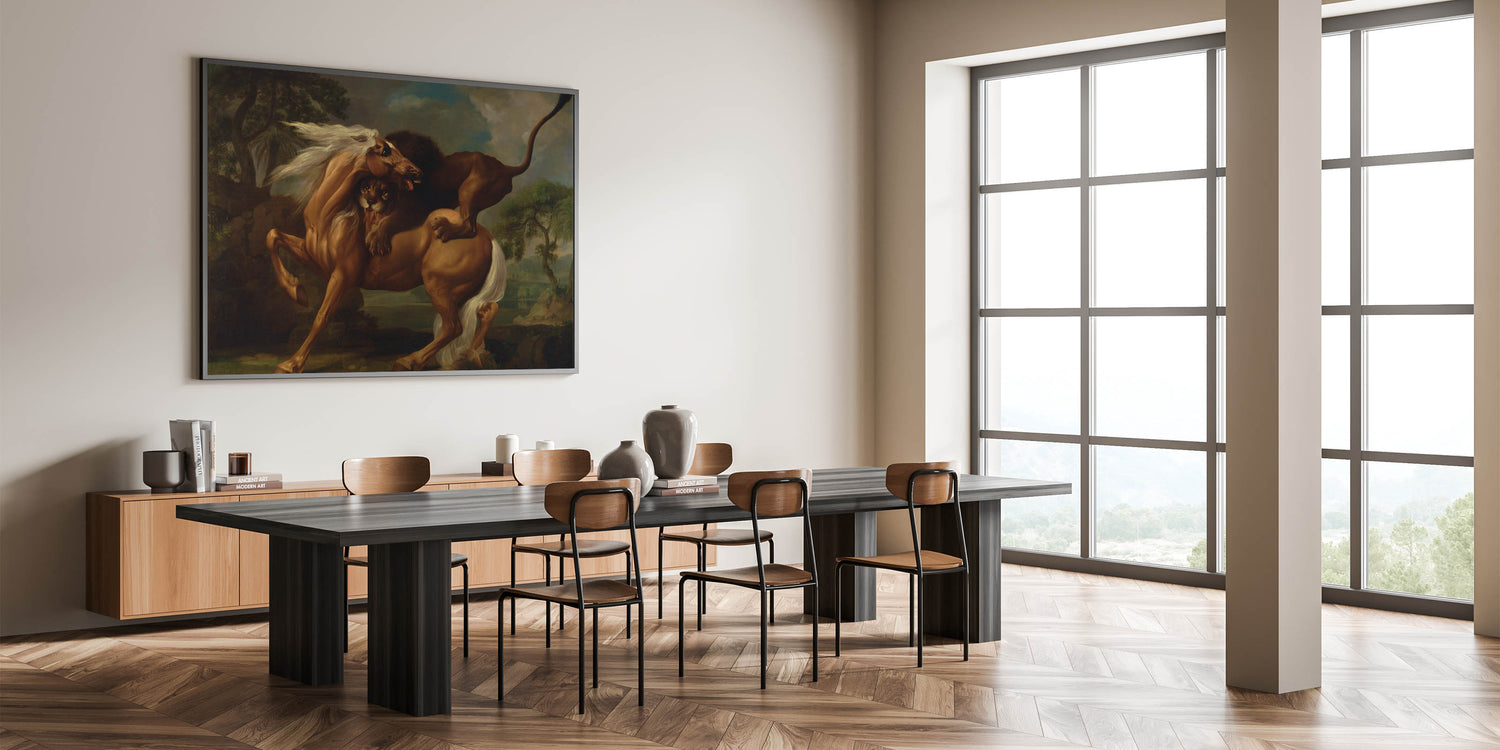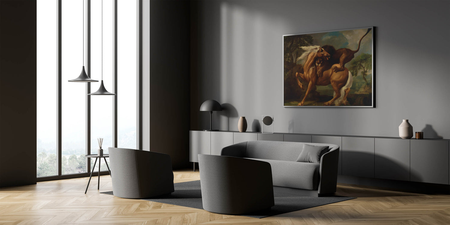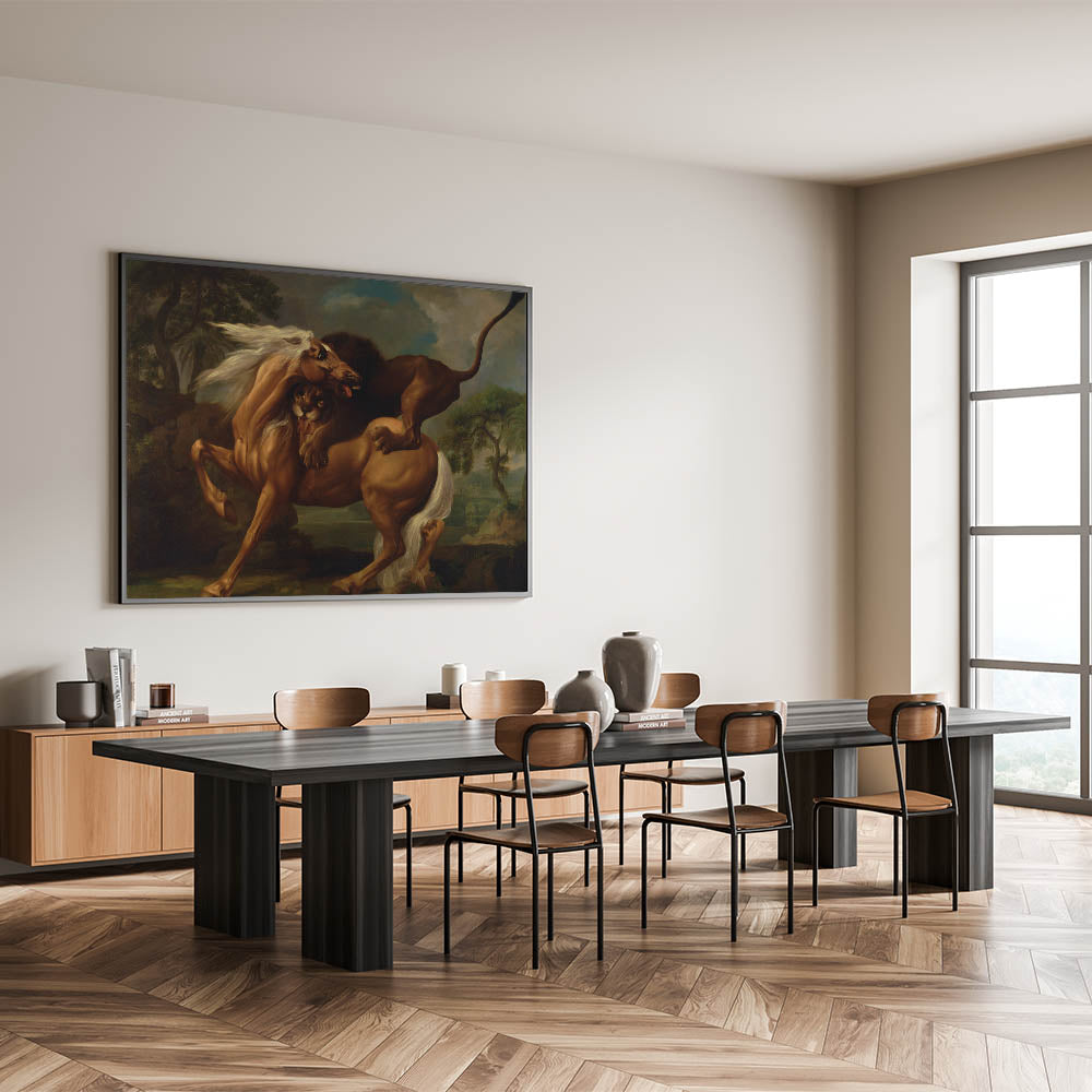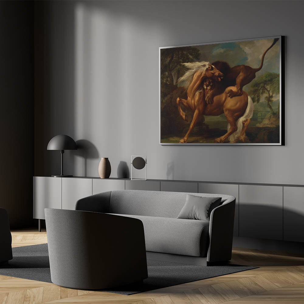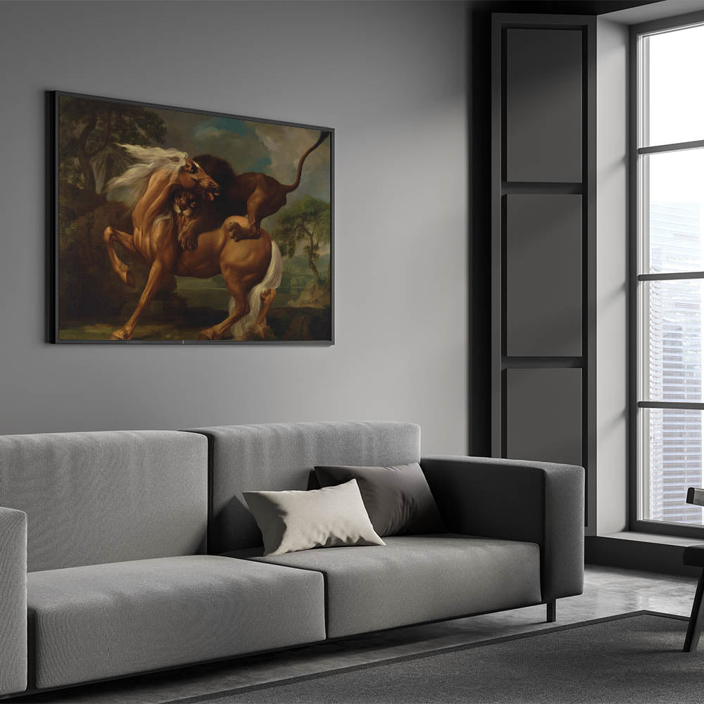 Bring the intensity of the Romantic era into your space with "A Lion Attacking a Horse" (1762) by George Stubbs. This dramatic and masterful painting captures the raw power and emotional tension of nature in conflict. The dynamic composition features a powerful lion mid-attack on a rearing horse, set against a lush, atmospheric landscape that highlights the Romantic fascination with the sublime and the untamed forces of nature.