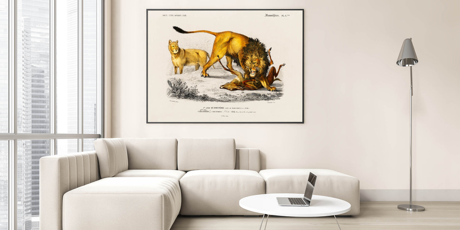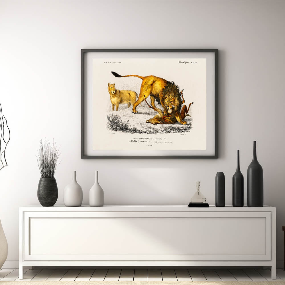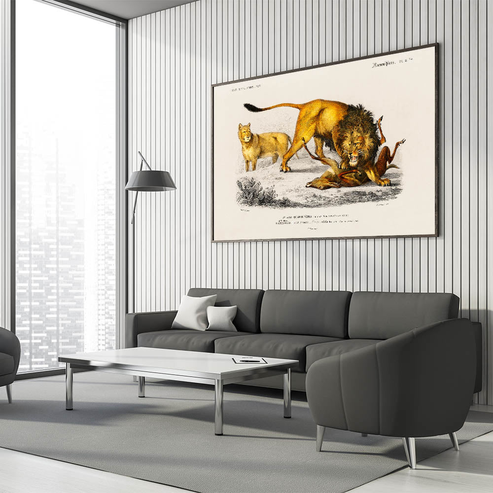 Bring the untamed beauty of the wild into your home with this striking Romanticism-style wall art featuring an intricate lion illustration by Charles Dessalines D'Orbigny. This historical Romanticism canvas highlights the majestic power of nature through detailed depictions of a lion and lioness in a dramatic scene. Perfect for lovers of both classic art and wildlife, this piece blends emotional landscapes and cultural significance.