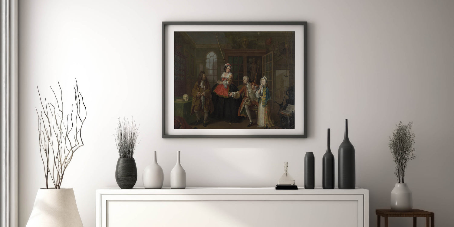 Experience the satirical brilliance of William Hogarth’s Marriage A-la-Mode 3: The Inspection, a thought-provoking masterpiece from the Romantic era. This intricate scene is part of Hogarth’s renowned series critiquing societal norms and the institution of marriage in 18th-century England. The detailed composition captures the tension, drama, and humor of this moment, with each character contributing to the rich storytelling.