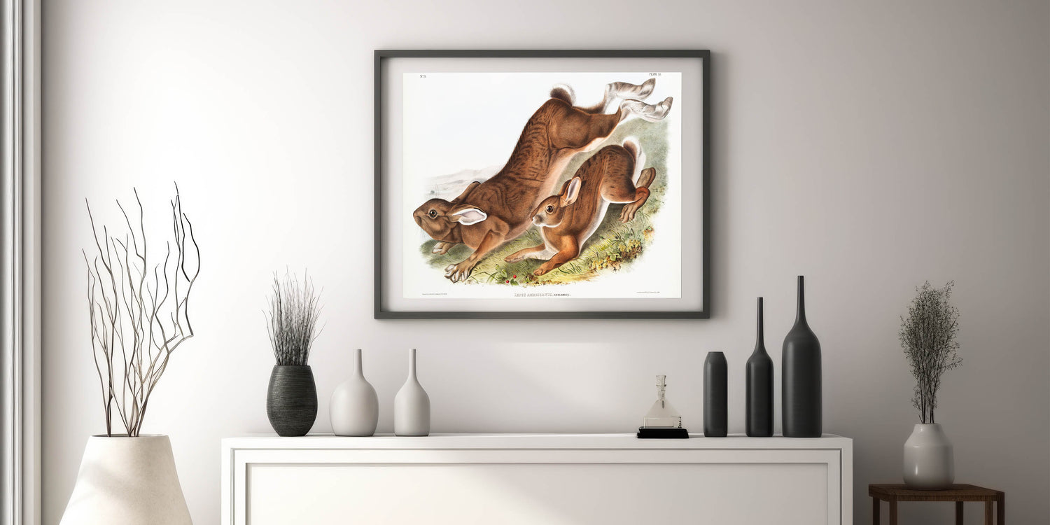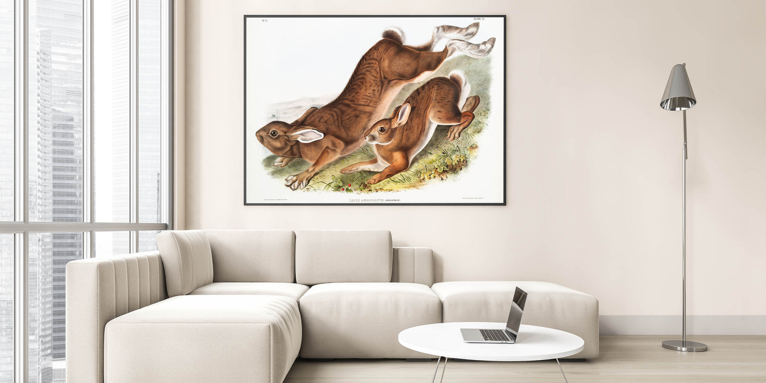 Add a touch of timeless charm to your space with this exquisite Romanticism-style wall art. Featuring "Northern Hares" by John Woodhouse Audubon, this artwork captures the lively movement and detail of these beautiful creatures in their natural habitat. The perfect blend of emotional landscapes and classic Romantic art, this piece will elevate your home decor with its historic and cultural essence.
