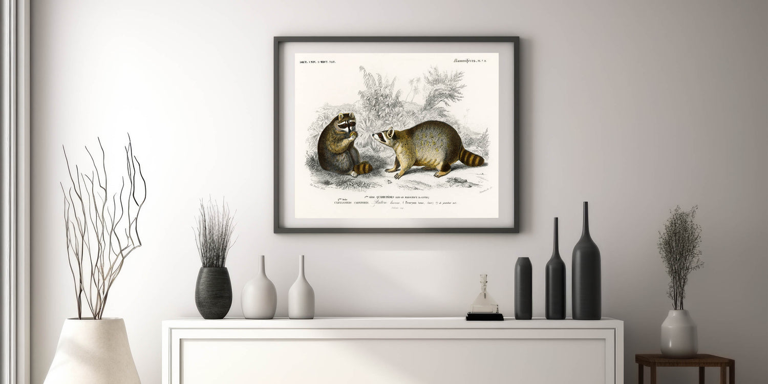 Celebrate the intricate beauty of Romanticism style wall art with this charming illustration of raccoons by Charles Dessalines D’Orbigny. This artwork, a part of 19th-century scientific illustrations, perfectly combines artistry and natural observation, showcasing the playful curiosity of raccoons amidst a lush background. The meticulous detailing and lifelike portrayal of the raccoons embody the Romantic era’s fascination with the natural world.