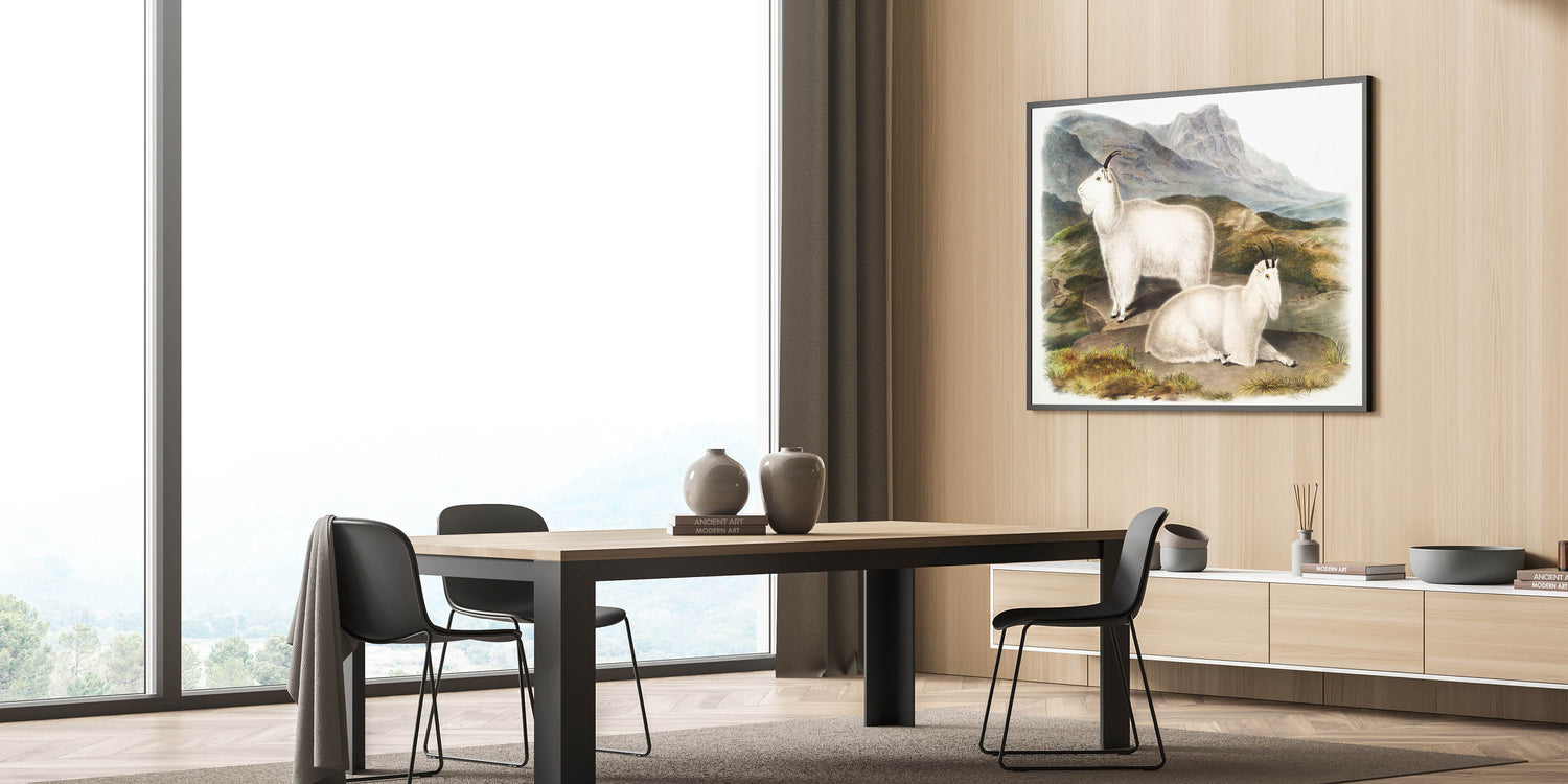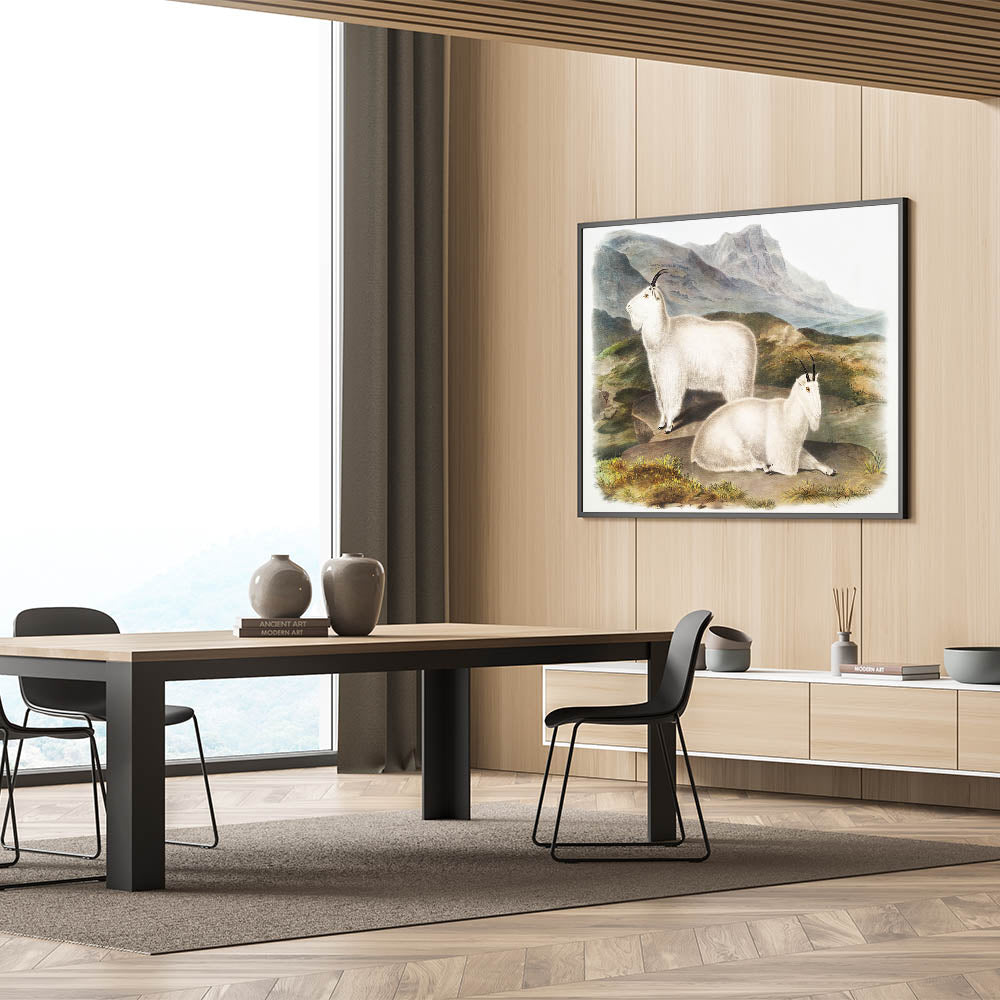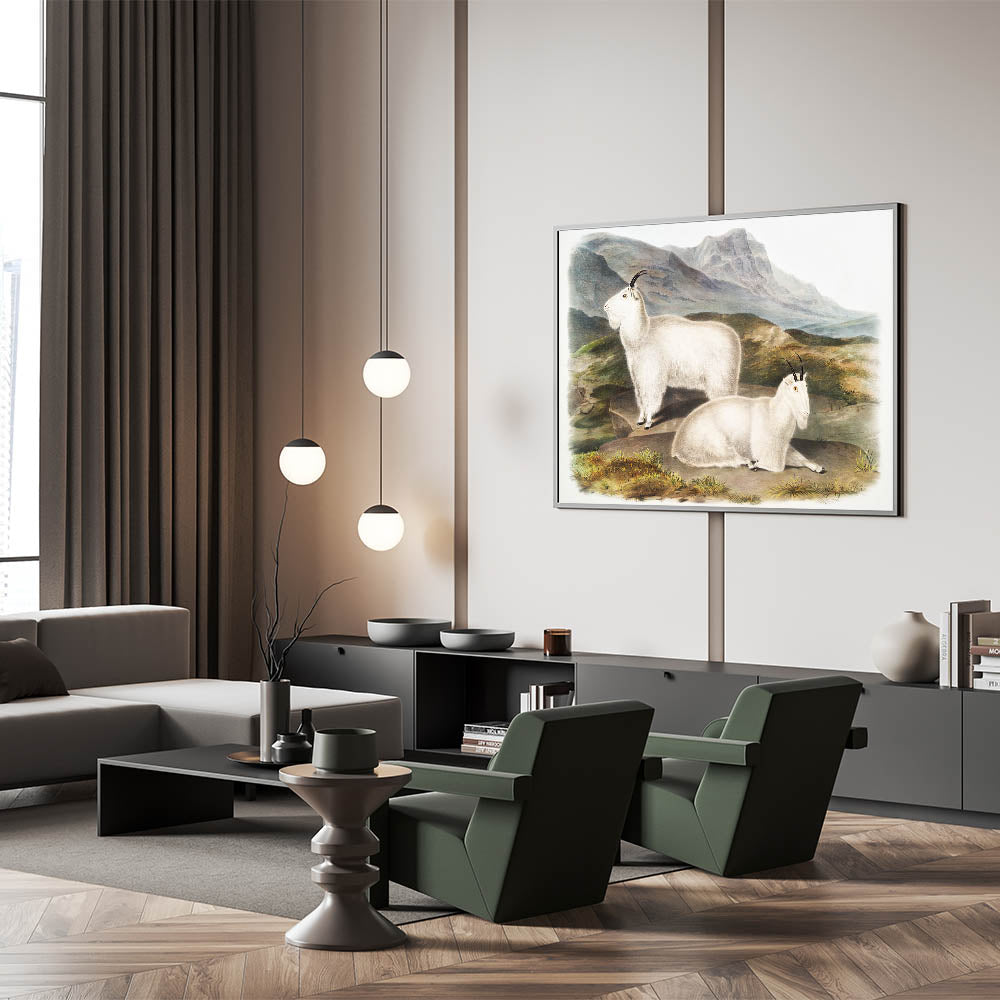 Experience the charm of Romanticism style wall art with this detailed illustration of the Rocky Mountain Goat by John Woodhouse Audubon. Part of the historic "Viviparous Quadrupeds of North America" collection (1845), this artwork captures the beauty of nature through intricate detail and lifelike rendering, embodying the essence of the Romantic era.