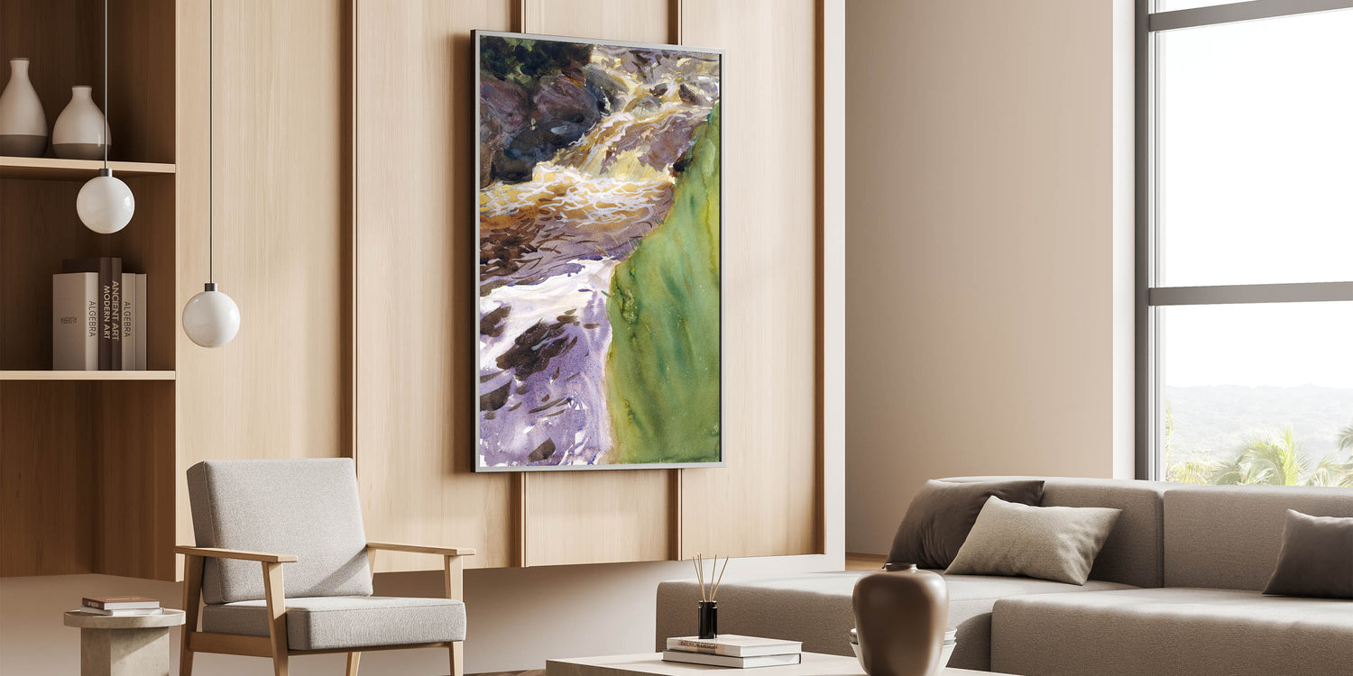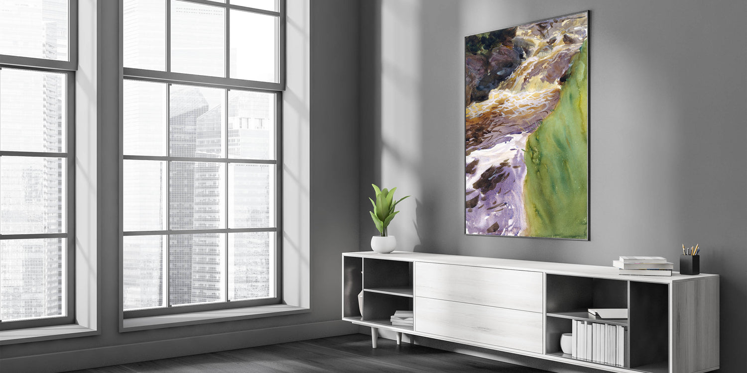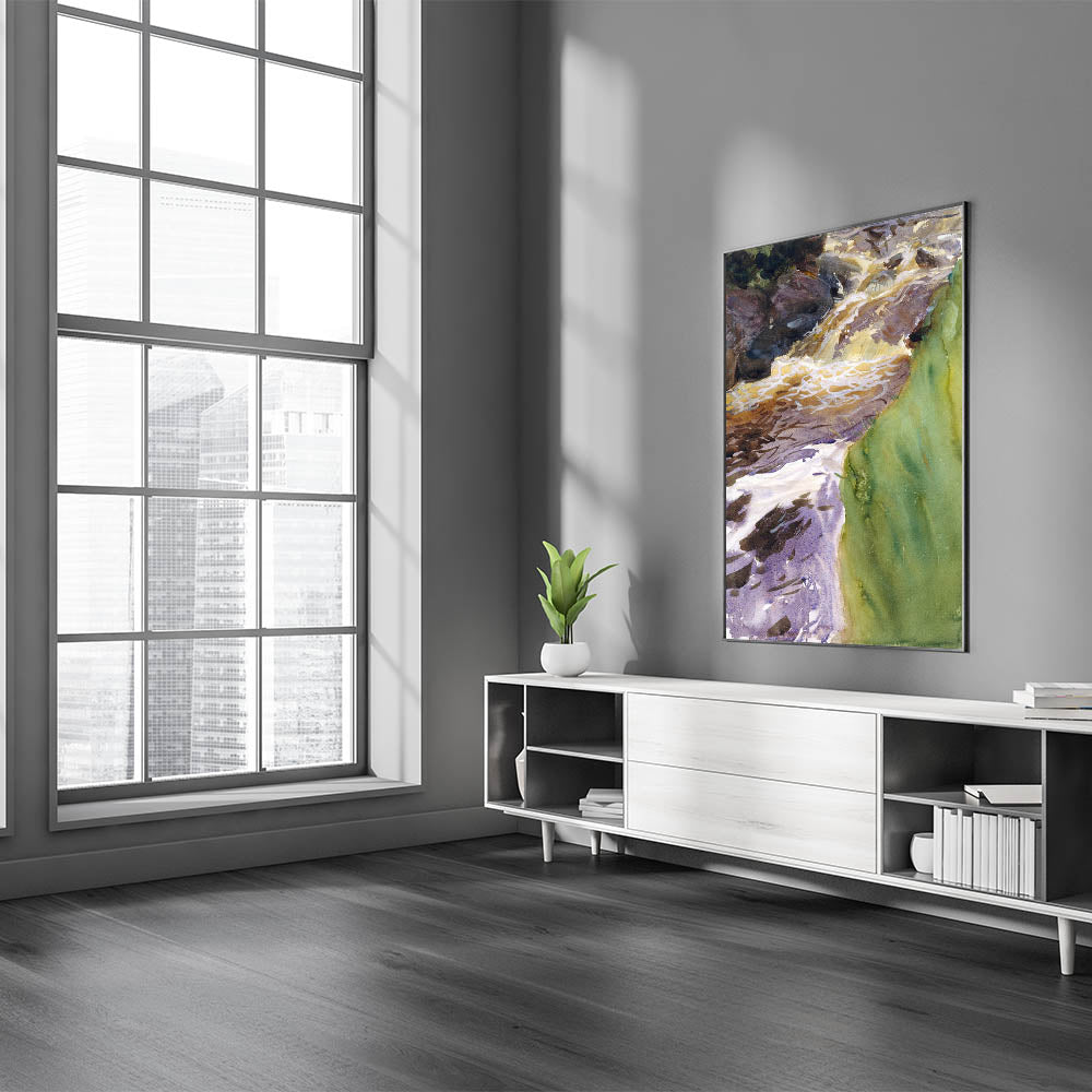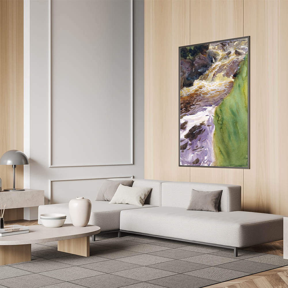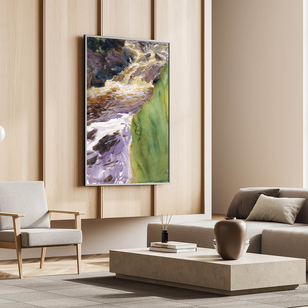 Immerse yourself in the serene beauty of nature with "Rushing Water," a vibrant and fluid Romanticism-inspired artwork by John Singer Sargent. This masterpiece captures the dynamic energy of a cascading stream, using soft yet expressive strokes and natural tones to evoke a sense of movement and tranquility. The harmonious blend of greens, browns, and purples reflects the Romantic era's fascination with nature’s raw elegance.