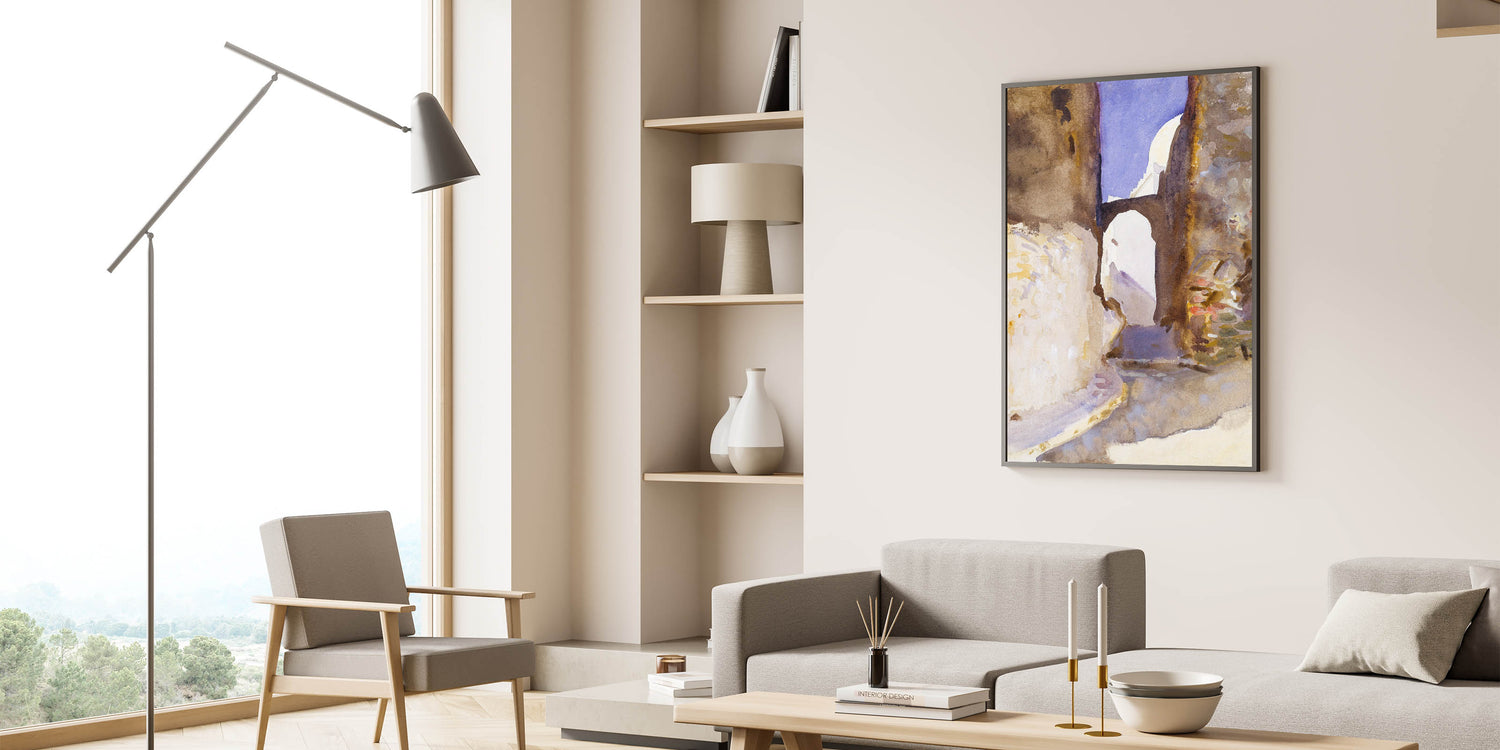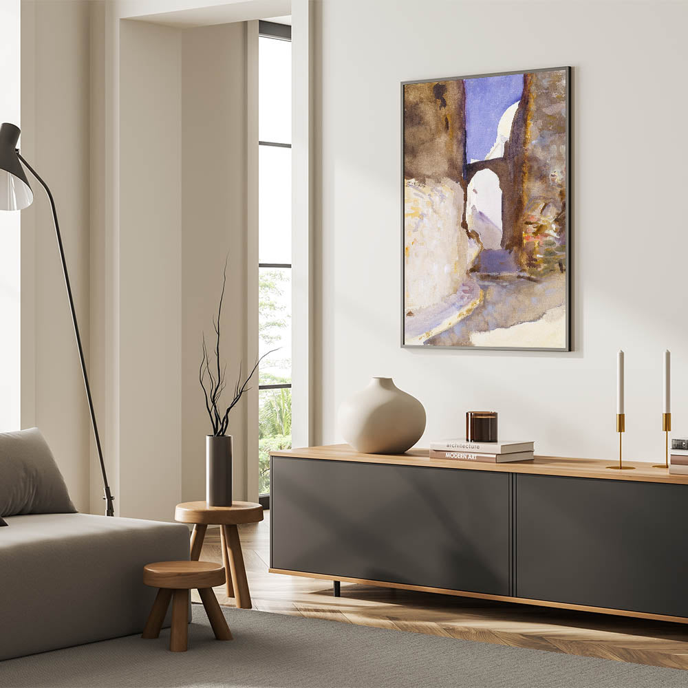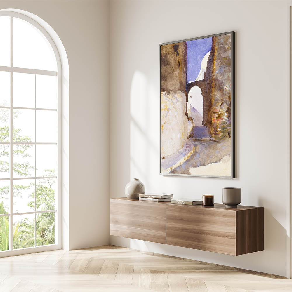 Experience the beauty of Romanticism with Street, Tangier (1895) by John Singer Sargent. This atmospheric watercolor captures a narrow street bathed in soft light, with its weathered walls and an arched gateway leading to an inviting expanse of sky. Sargent’s masterful use of color and texture evokes the vibrant yet tranquil essence of Moroccan architecture and landscapes, a hallmark of Romanticism style wall art.