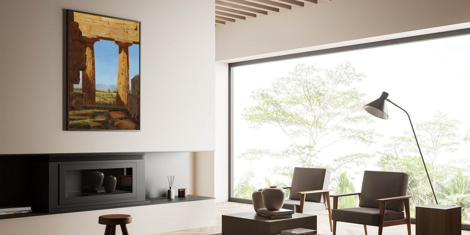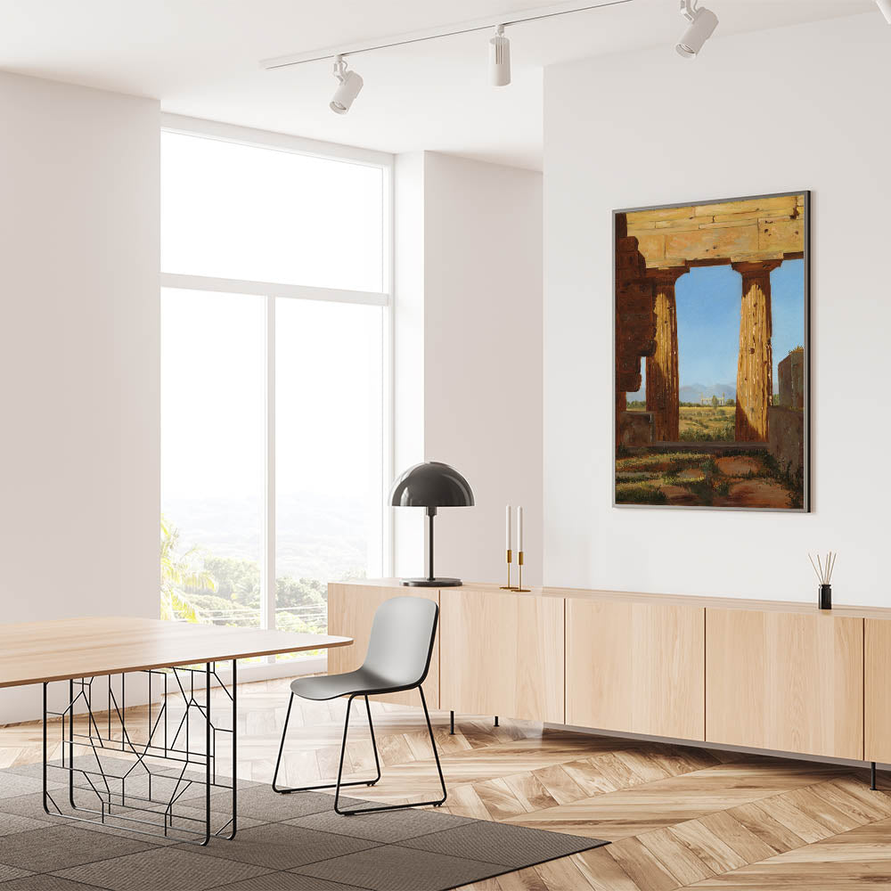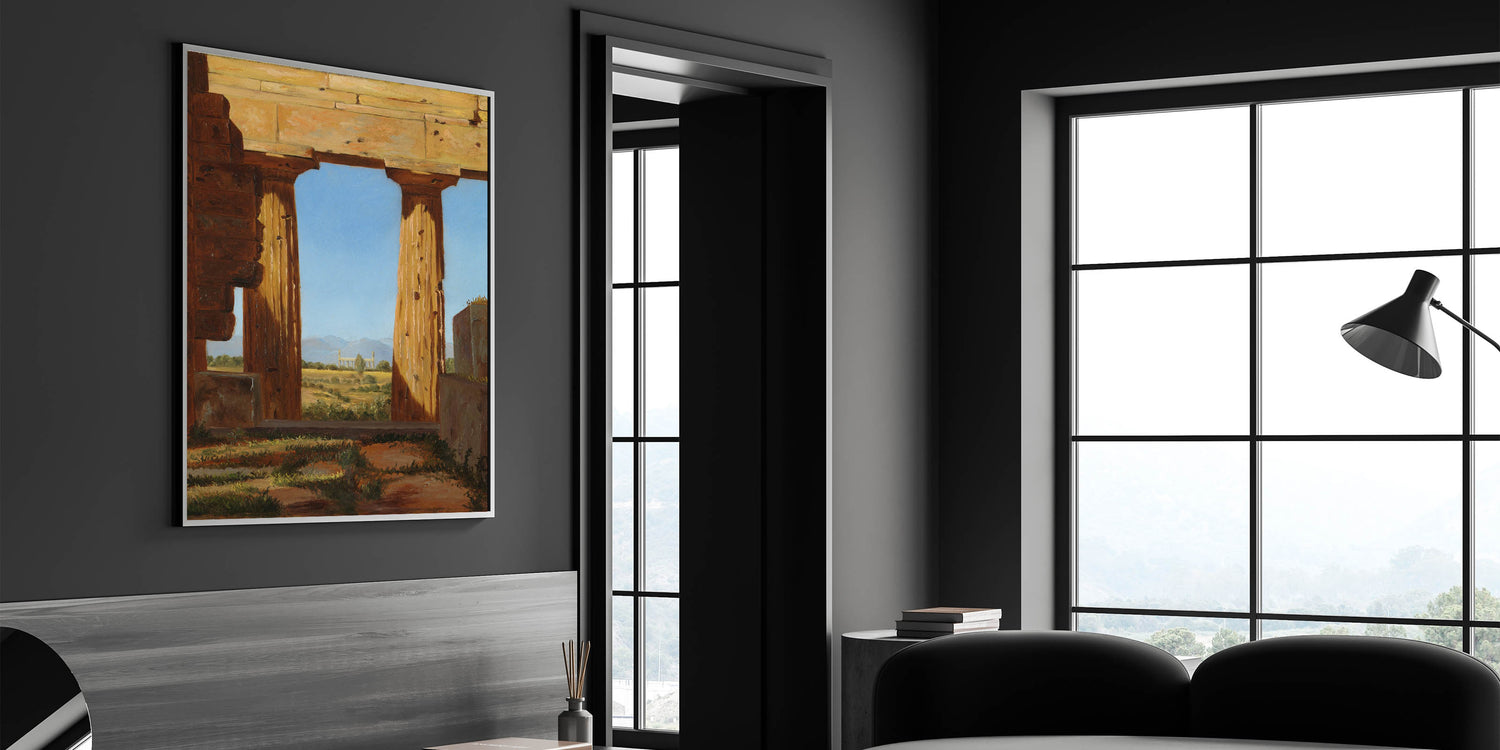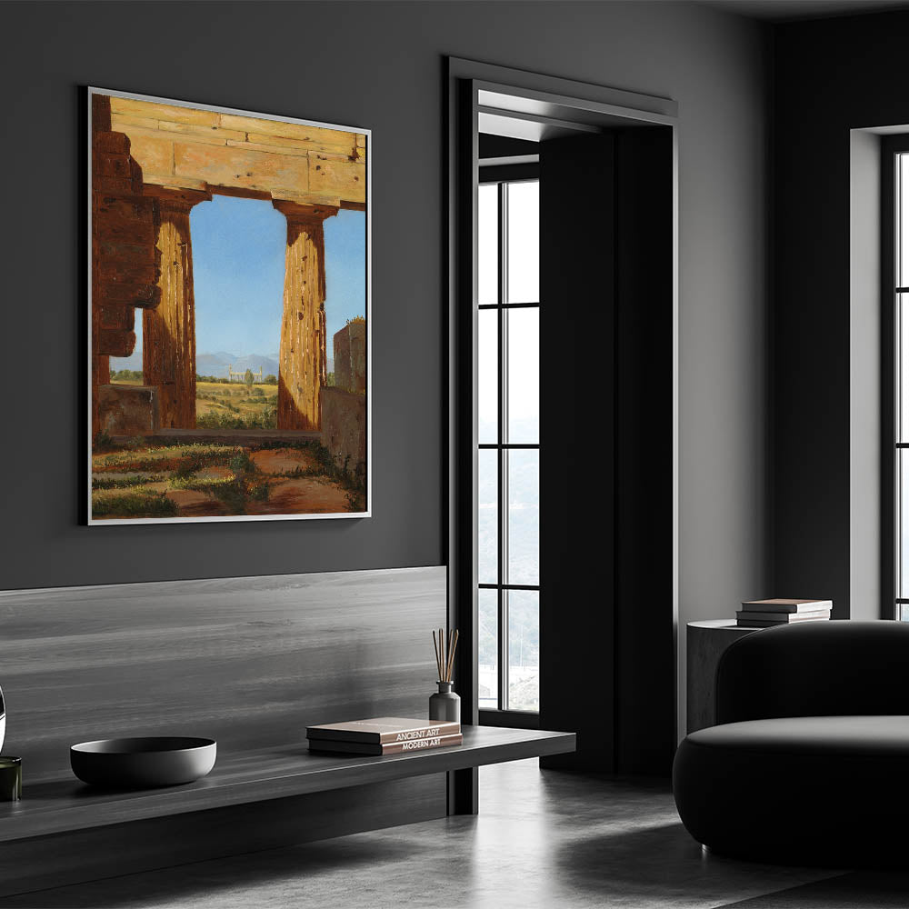 Step back into the ancient world with Columns of the Temple of Neptune at Paestum by Constantin Hansen. This Romantic-era masterpiece captures the ruins of an iconic Greek temple, framed by the golden light of the Italian countryside. The vibrant blue sky contrasts with the aged stone, offering a powerful visual of time’s passage and the enduring beauty of classical architecture.