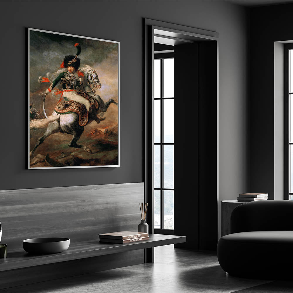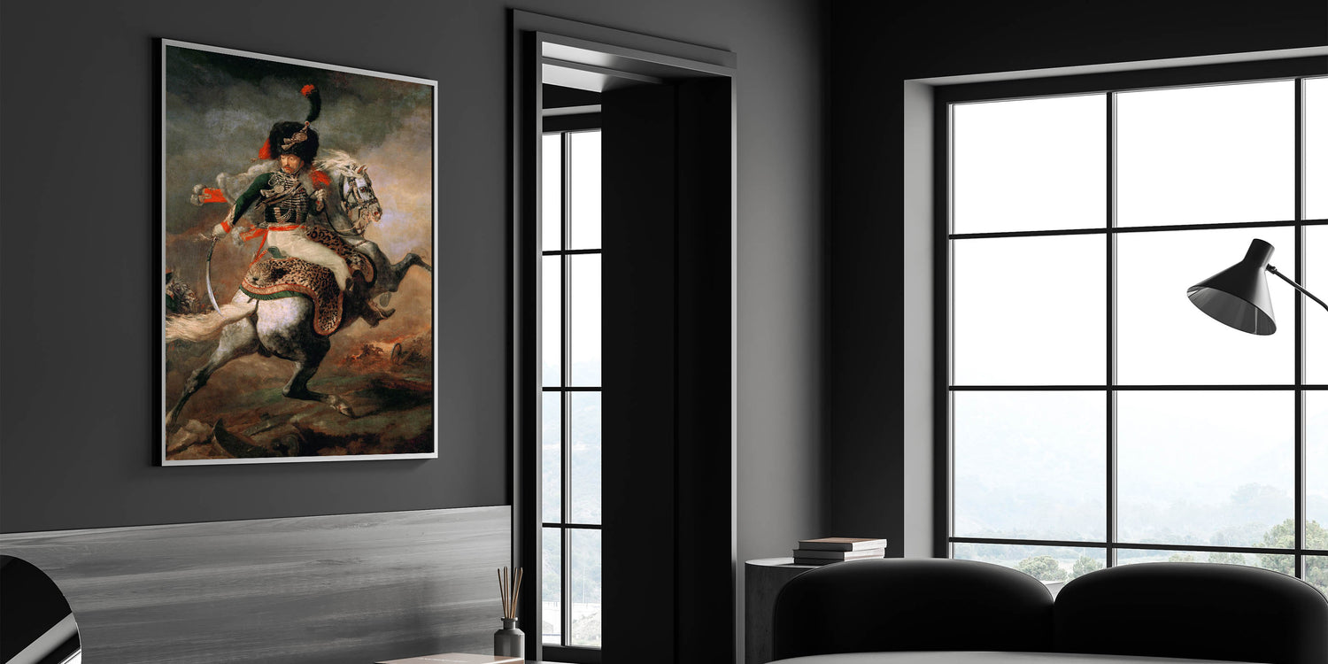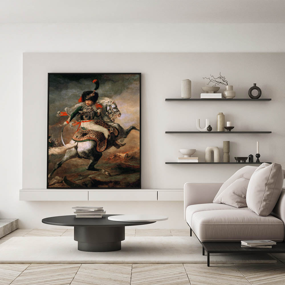 Bring the bold energy of the Romantic era into your home with The Charging Chasseur (1812) by Théodore Géricault. This iconic masterpiece exemplifies Romanticism style wall art, portraying the heroic figure of a cavalry officer mid-charge, enveloped in the chaos of battle. With vivid detail and dramatic movement, this painting captures the essence of courage and the unpredictability of war.