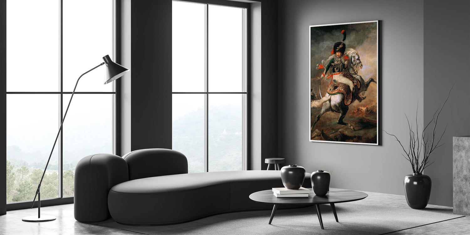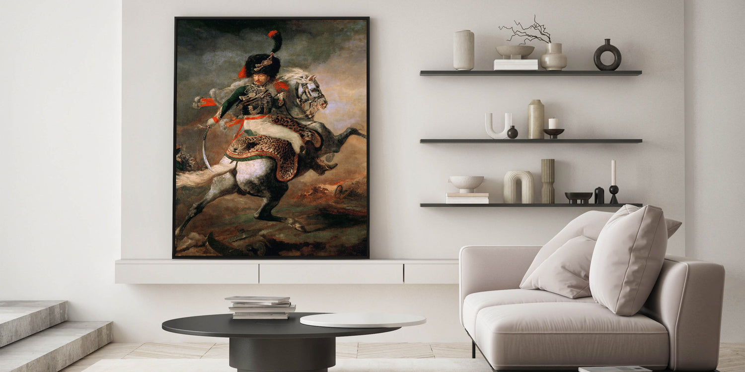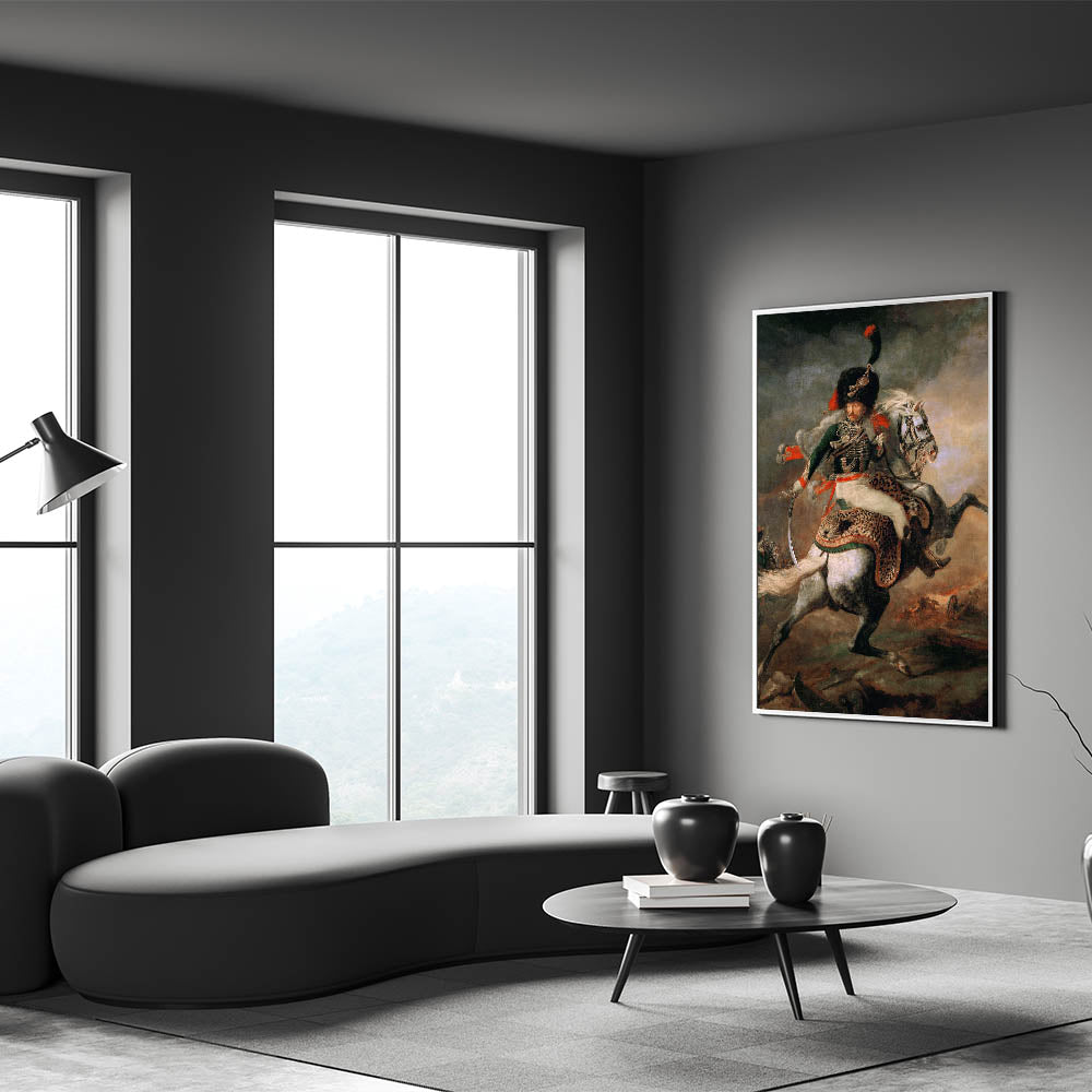 Bring the bold energy of the Romantic era into your home with The Charging Chasseur (1812) by Théodore Géricault. This iconic masterpiece exemplifies Romanticism style wall art, portraying the heroic figure of a cavalry officer mid-charge, enveloped in the chaos of battle. With vivid detail and dramatic movement, this painting captures the essence of courage and the unpredictability of war.