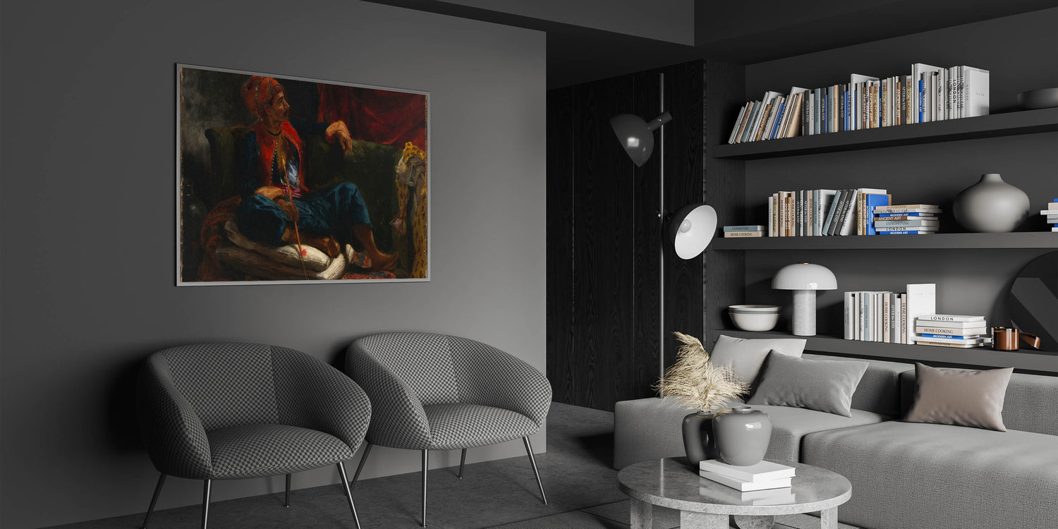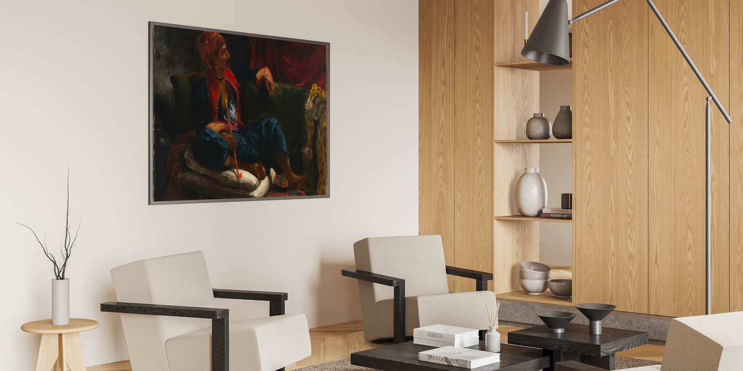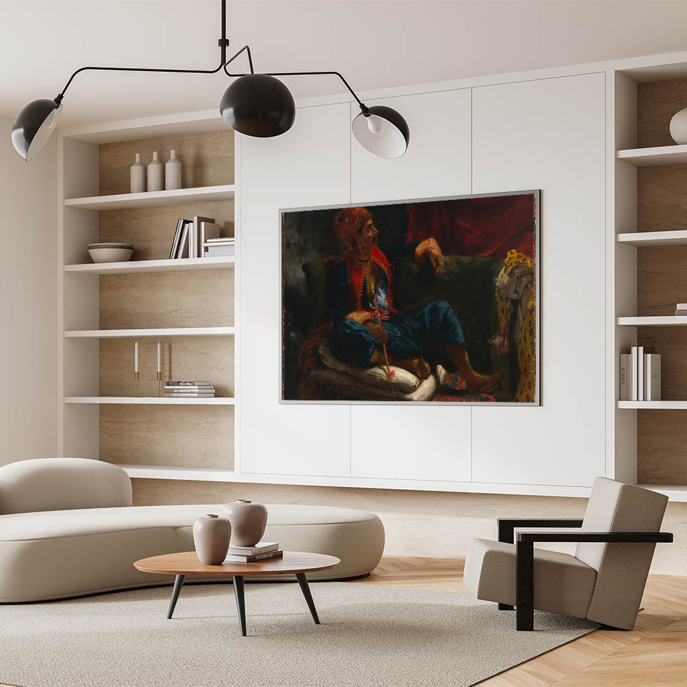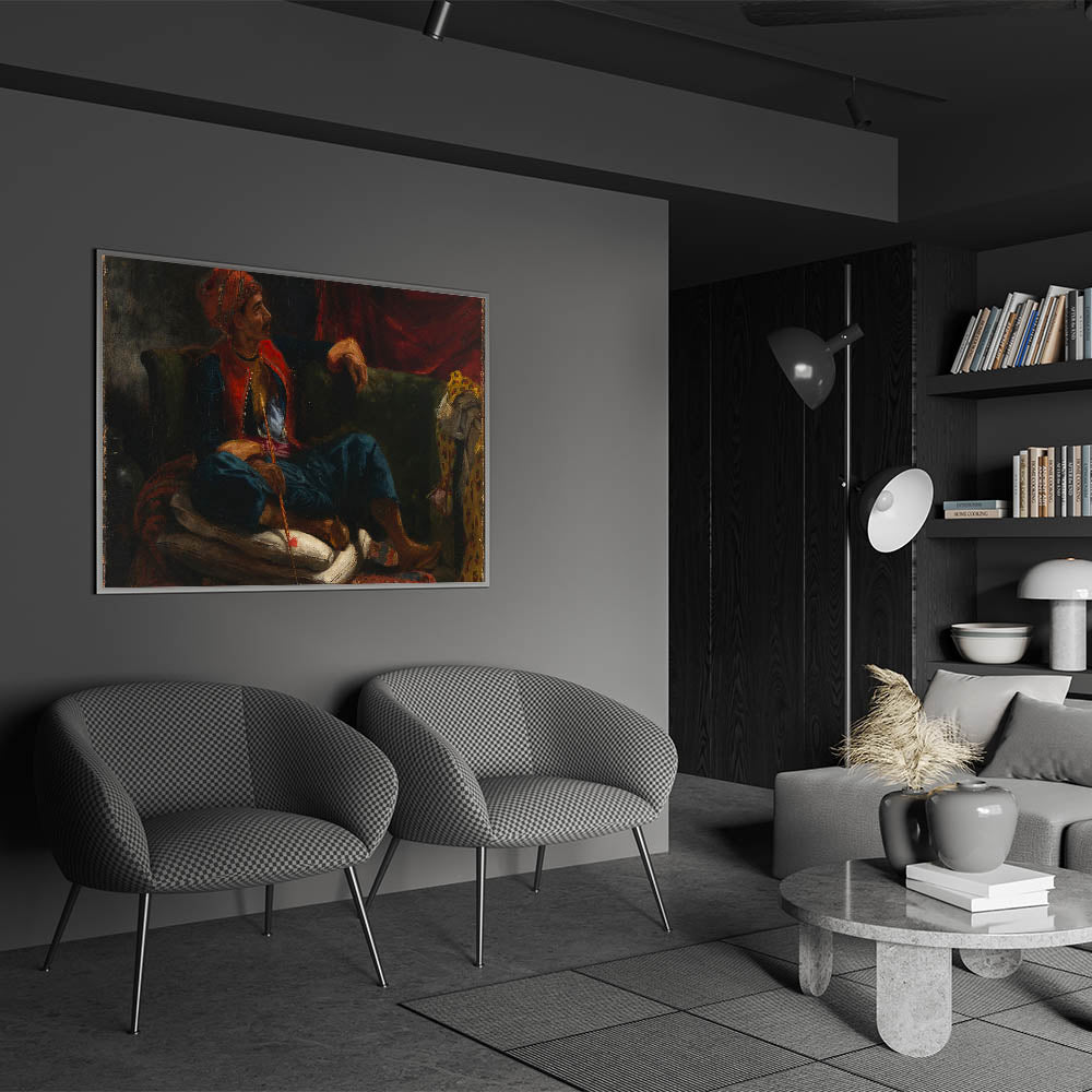 Experience the intensity and vibrancy of Romanticism with "The Smoker" by Eugène Delacroix. This striking portrait captures a moment of quiet contemplation, focusing on a figure dressed in exotic attire. Delacroix’s bold use of color and light contrasts vividly against the dark, moody backdrop, making the piece an evocative example of the emotional depth and cultural richness of the Romantic era.