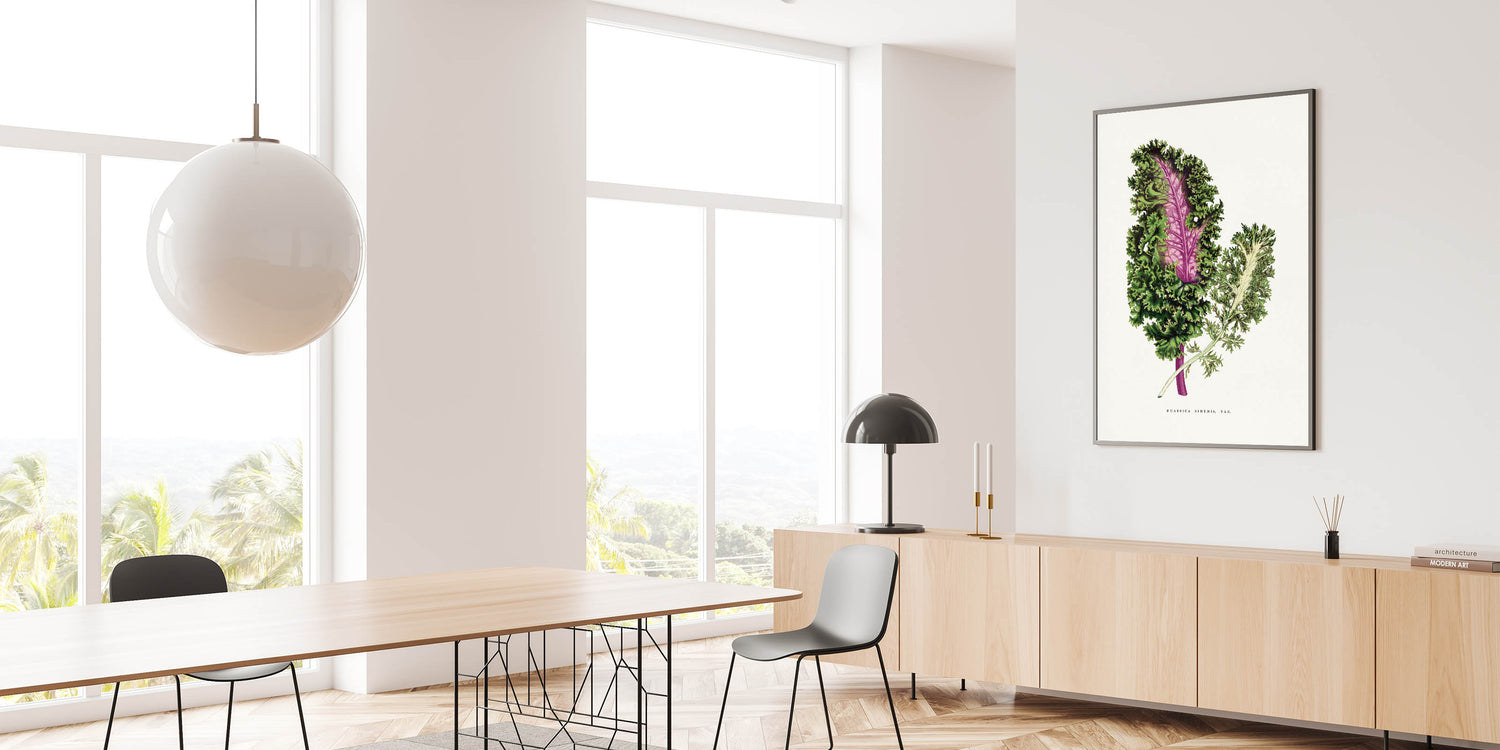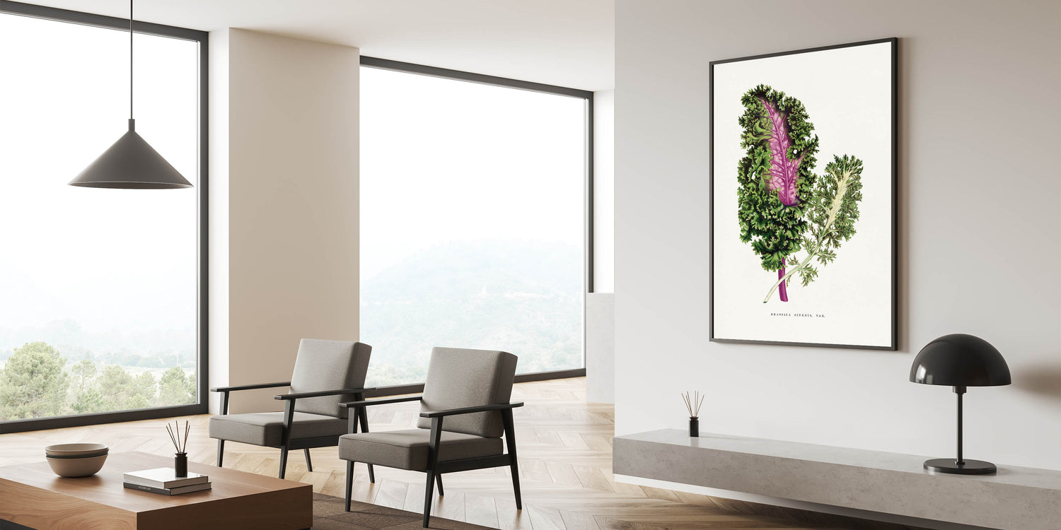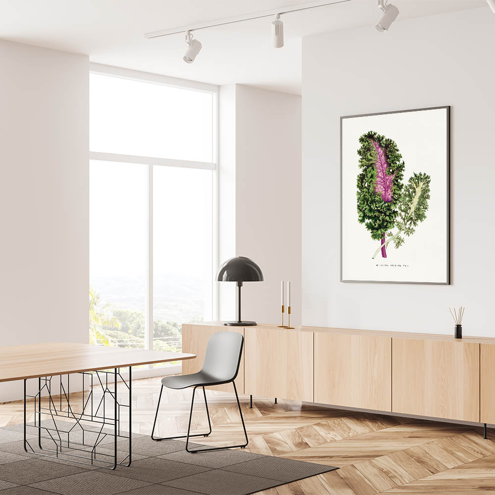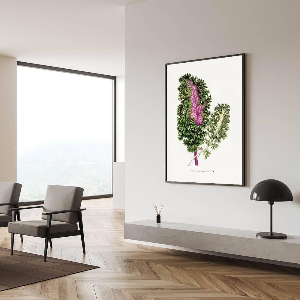 Discover the beauty of nature through this Romanticism style wall art featuring a detailed illustration of wild cabbage leaves. Originally created in the mid-19th century, this botanical artwork combines scientific accuracy with artistic charm, making it a perfect example of classic Romantic paintings. The vibrant green foliage paired with striking purple stems showcases the elegance and richness of Romantic art for home decor.