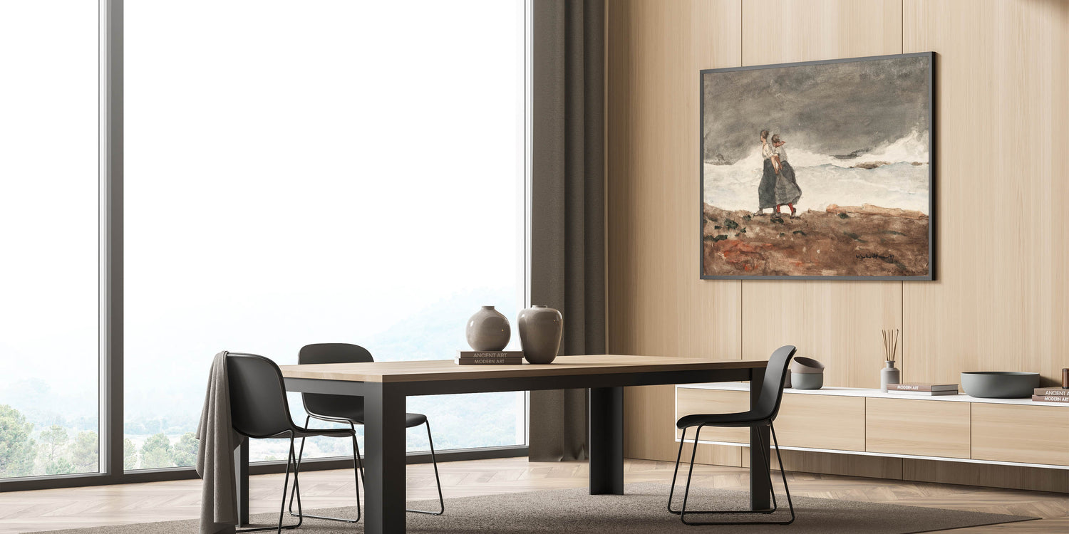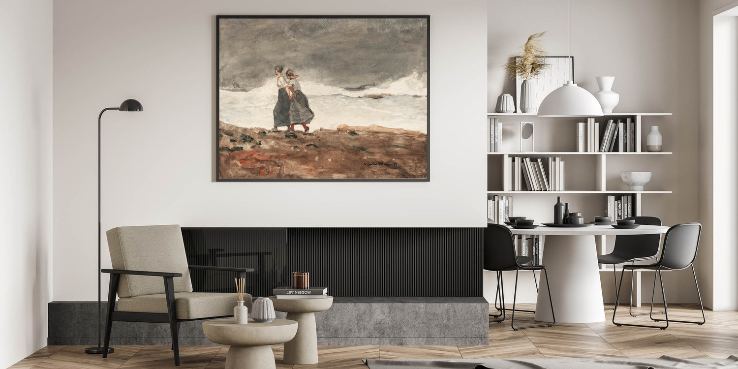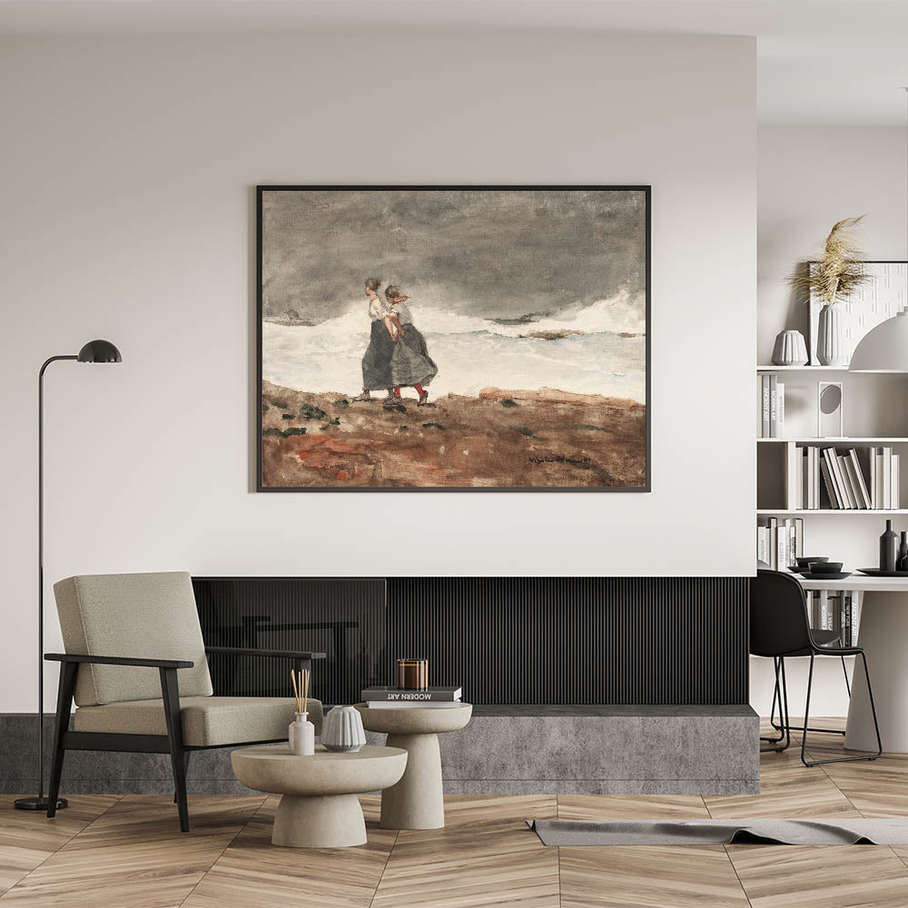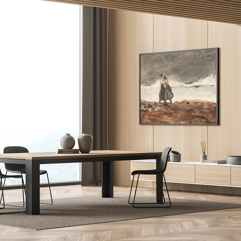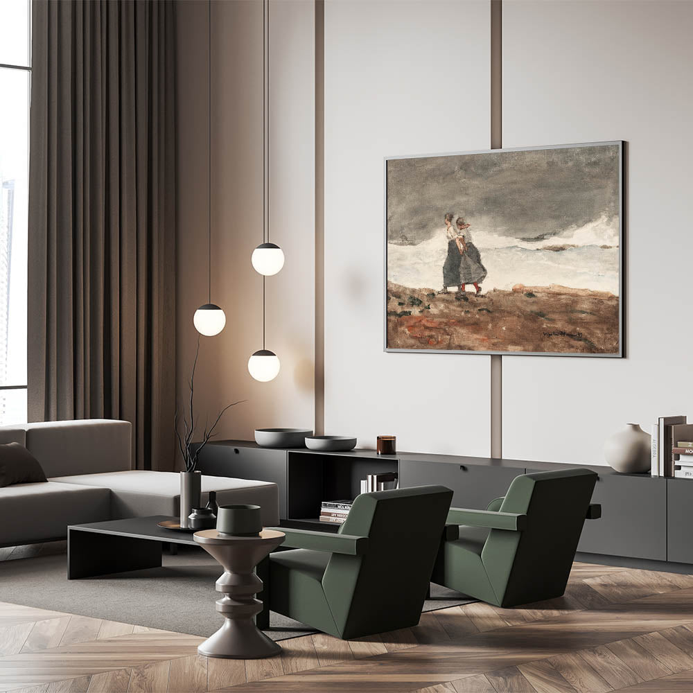 Capture the raw power of nature with Winslow Homer’s "Danger," a compelling Realism artwork that portrays two women bracing themselves against a stormy coastal landscape. The artist’s signature use of muted colors and dynamic brushstrokes emphasizes the mood of tension as the waves crash against the shore. Homer skillfully conveys the resilience of the figures against the formidable force of the ocean, making this piece both dramatic and evocative. It’s an ideal print for spaces that appreciate rugged beauty and the intensity of the natural world.