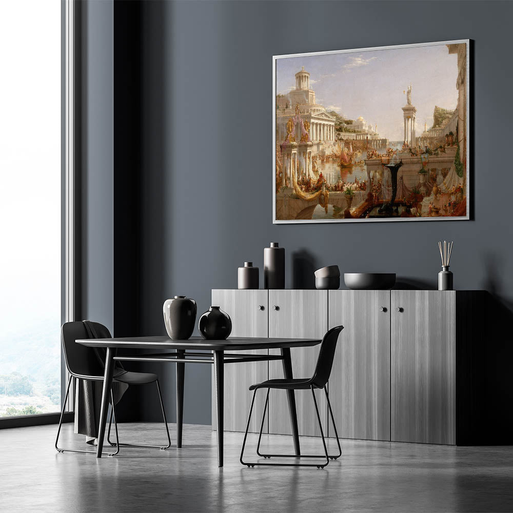 Step into the grandeur of Romanticism with The Consummation of Empire, an iconic masterpiece by Thomas Cole. Part of The Course of Empire series, this artwork vividly portrays a thriving civilization at its peak. With intricate architectural details, vibrant color palettes, and dynamic scenes of celebration, the painting exudes the opulence and complexity of the Romantic era.
