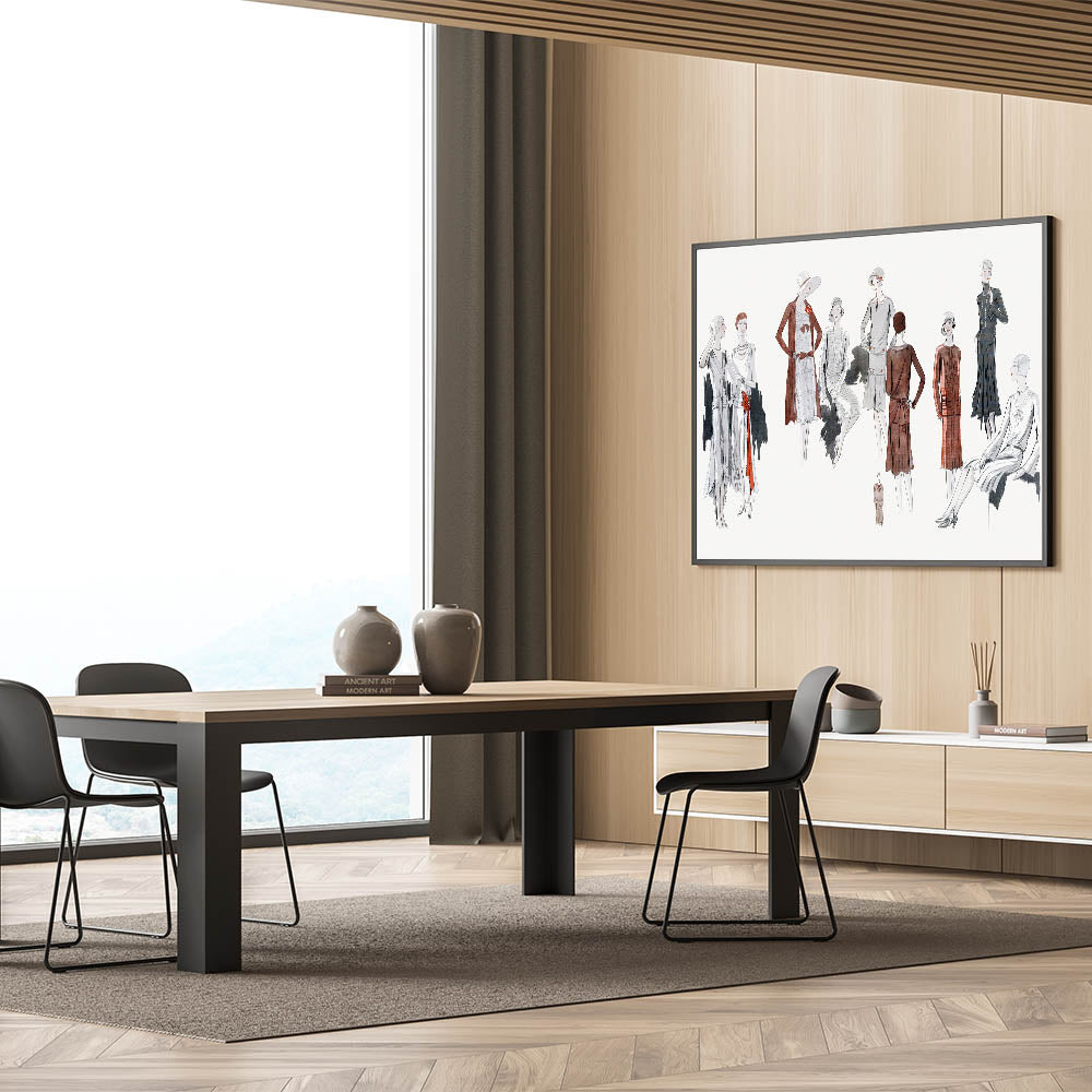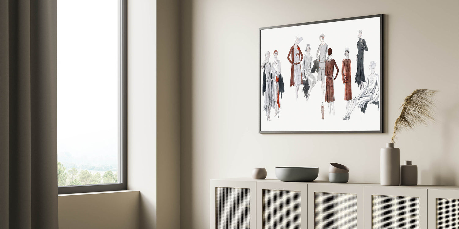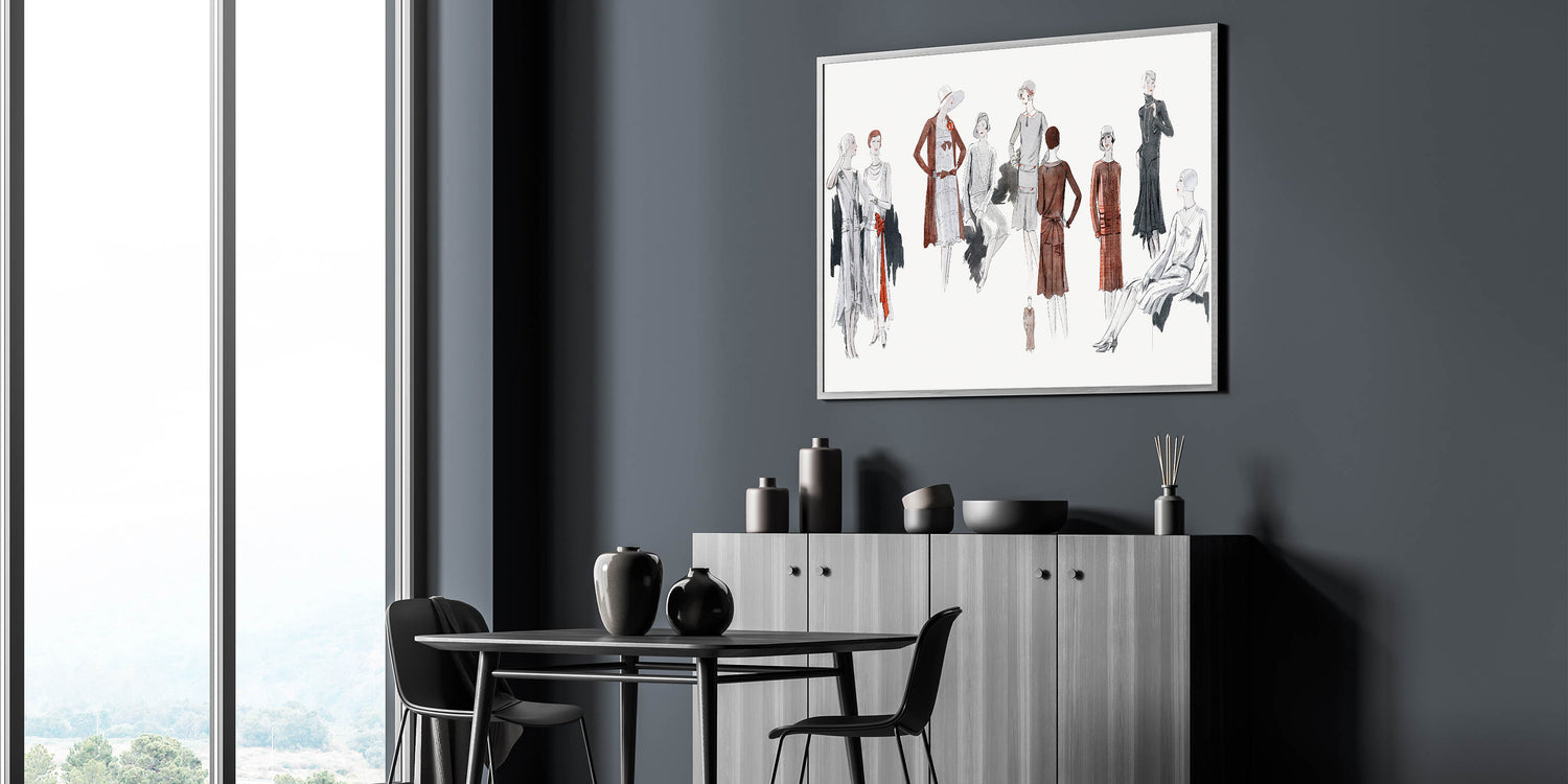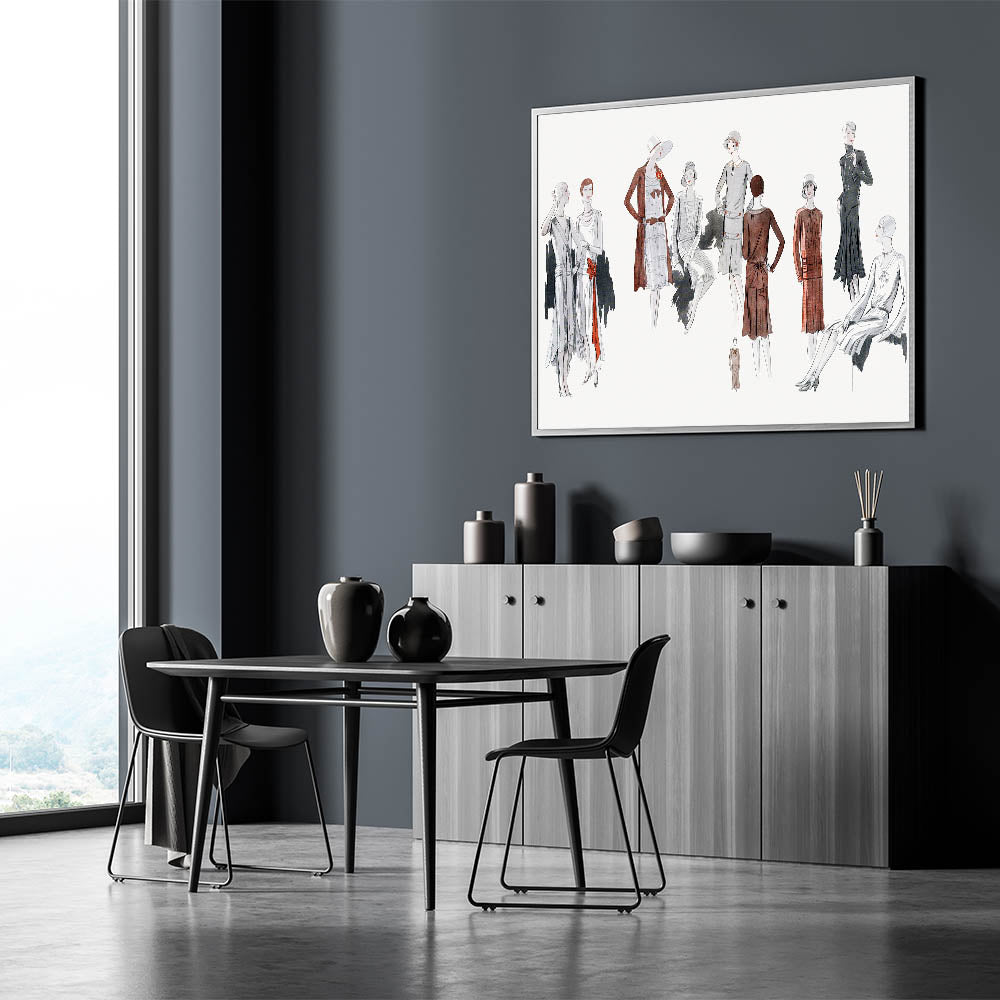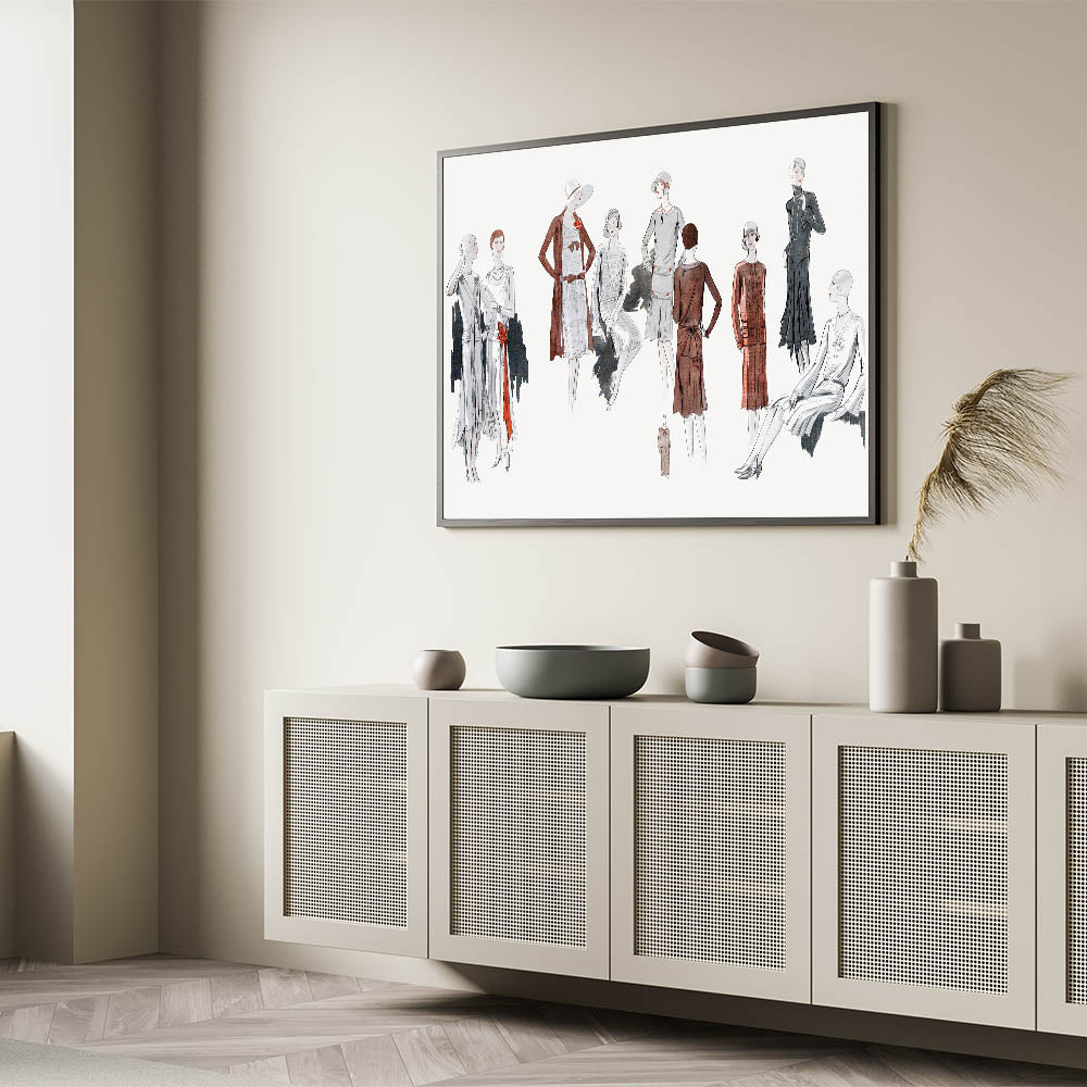 Embrace the elegance of 1920s fashion with this exquisite Art Deco wall art piece. Featuring a variety of stylishly dressed figures, this illustration captures the distinctive lines and sophisticated aesthetic of the Art Deco period. The muted palette with rich browns, blacks, and subtle reds adds a touch of vintage charm, perfect for both modern and traditional decor settings.