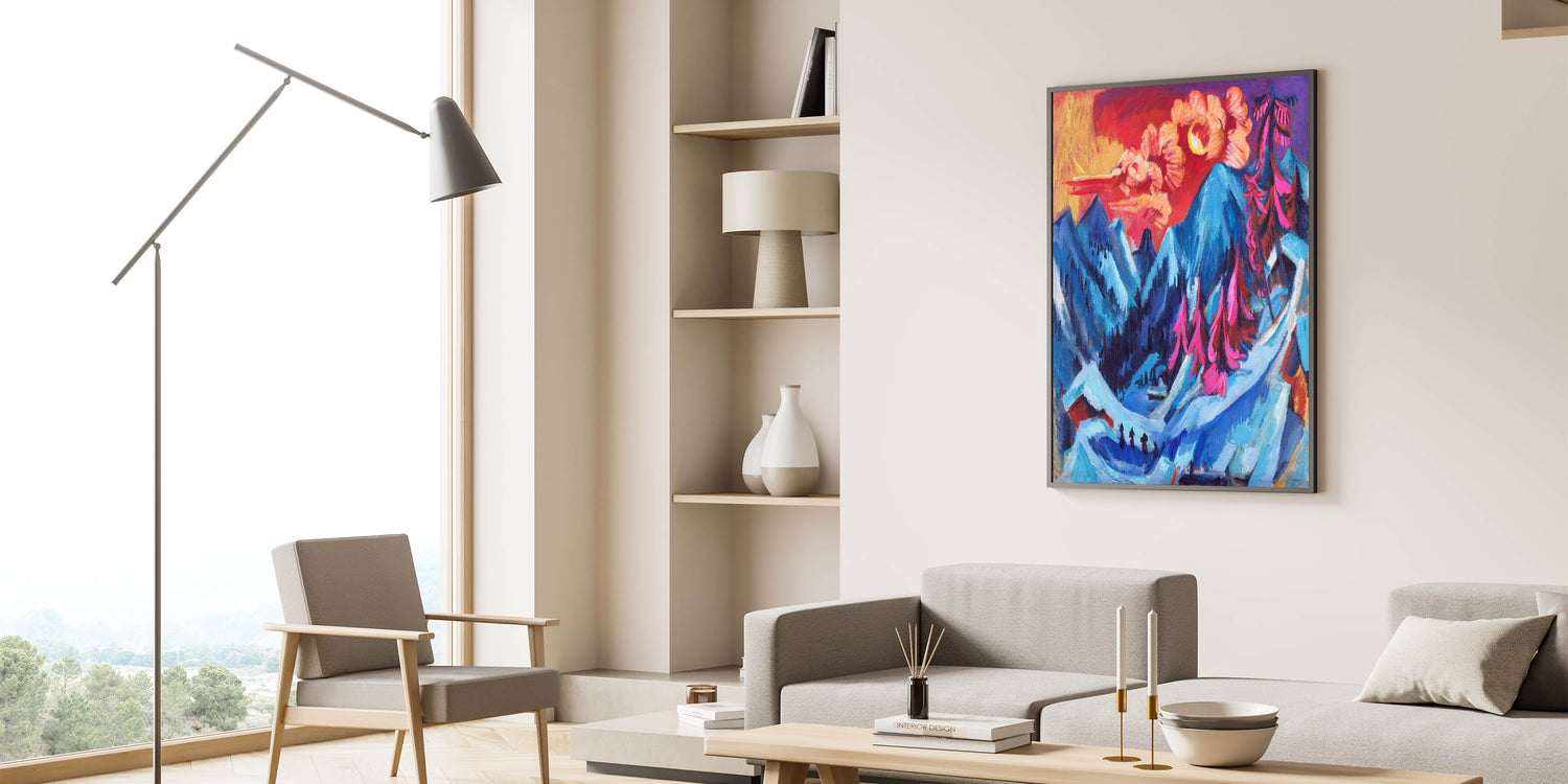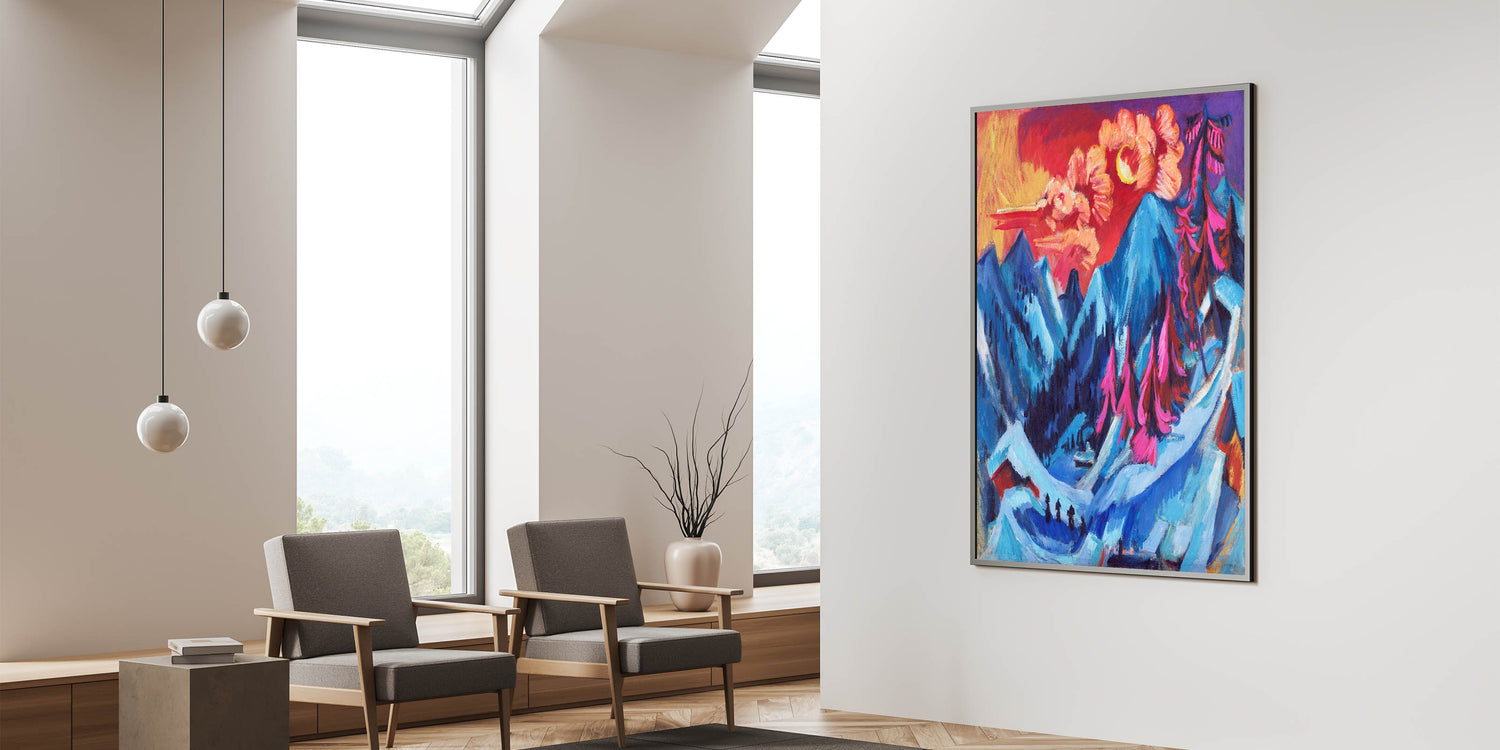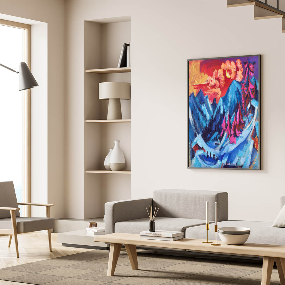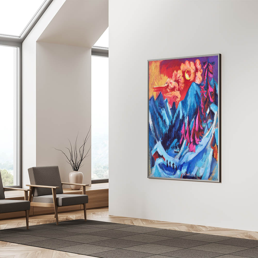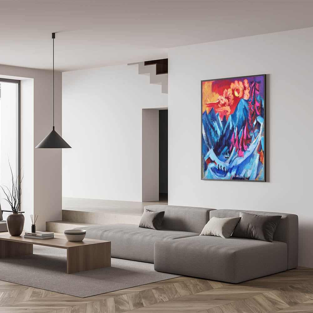 Transform your space with the dramatic beauty of this Expressionist winter landscape. Depicting a surreal mountain scene under a vibrant moonlit sky, this Contemporary Expressionist Art piece combines bold colors and dynamic brushstrokes to create an abstract yet evocative masterpiece. The striking palette of deep blues, radiant reds, and vivid pinks captures the magical interplay of light and shadow, infusing your decor with energy and emotion.