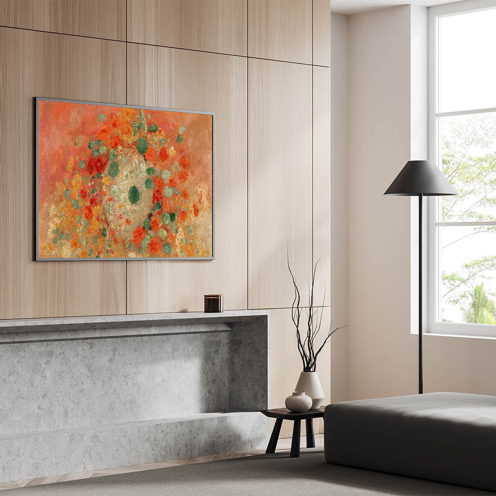 Bring the beauty of nature into your space with this vibrant modern wall art featuring a stunning arrangement of nasturtiums. The artwork showcases a symphony of orange, red, and green hues that create a lively and inviting atmosphere. With its abstract floral composition and warm tones, this piece is perfect for adding a touch of sophistication and energy to any room.