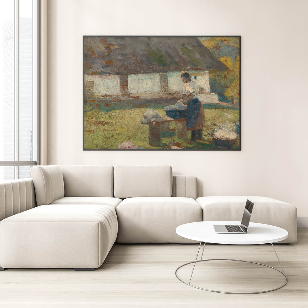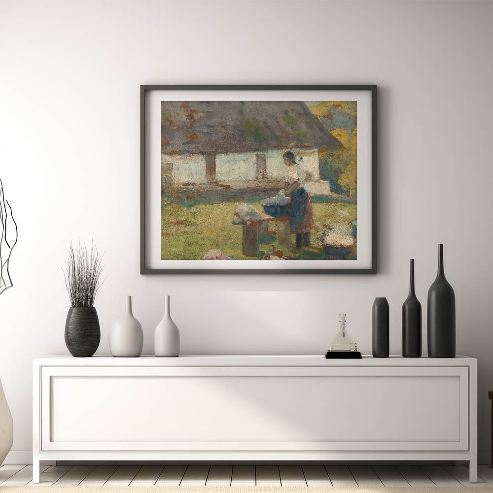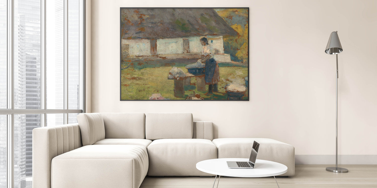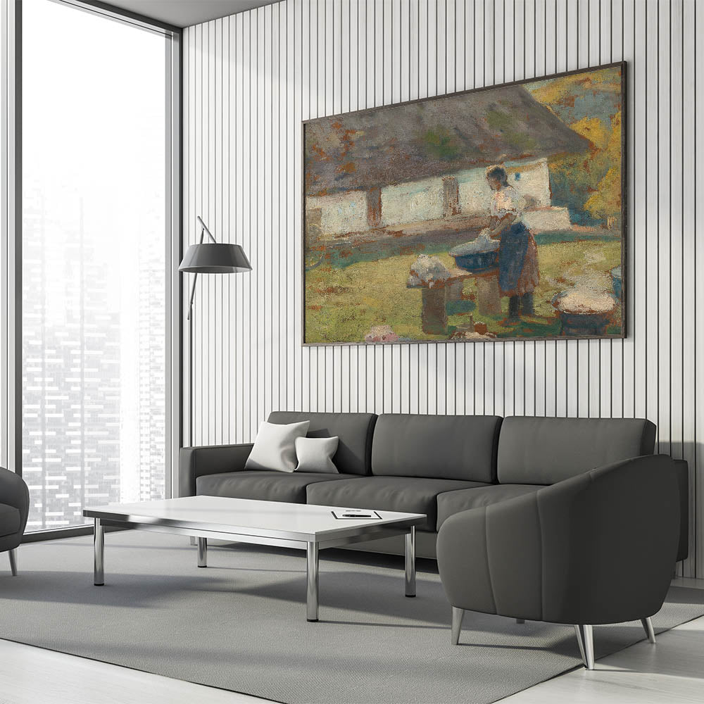 Immerse yourself in the tranquil simplicity of rural life with Lajos Csordák's Washing Scene. This Impressionist masterpiece captures a moment of quiet labor, where a woman washes clothes in a picturesque countryside setting. The earthy tones and textured brushwork beautifully convey the rustic charm of the scene, evoking nostalgia and admiration for simpler times