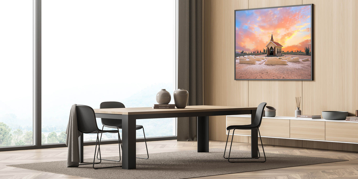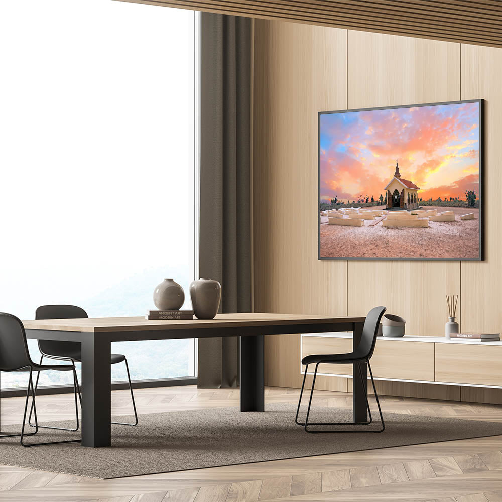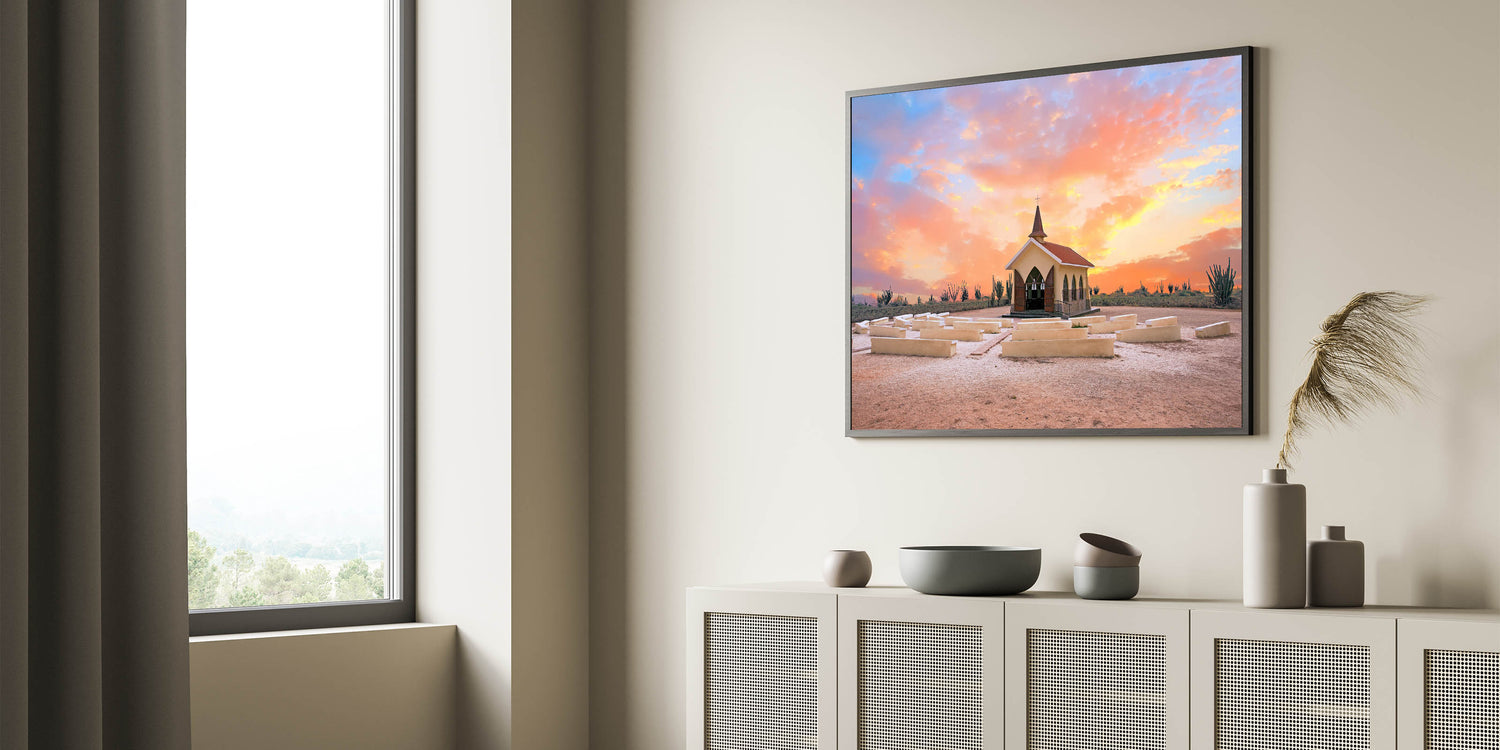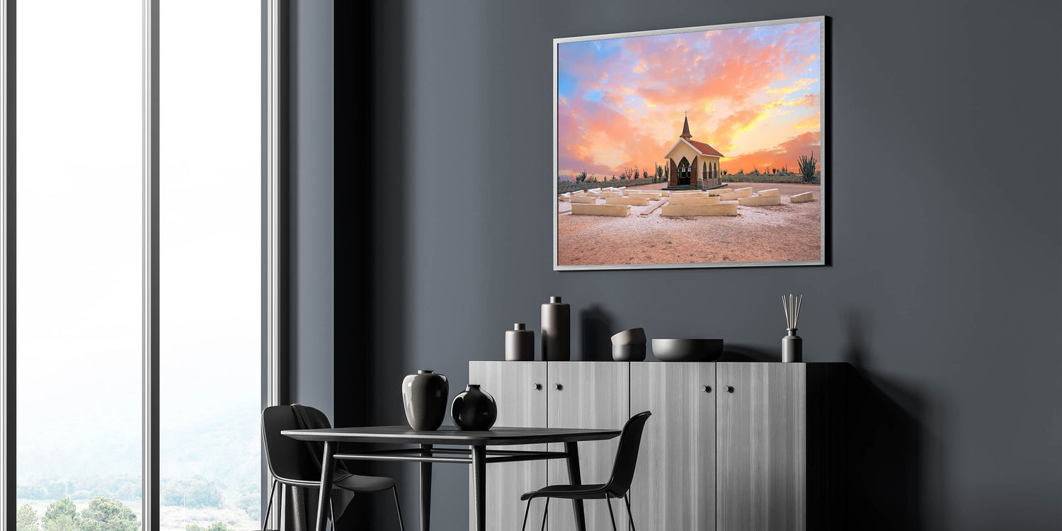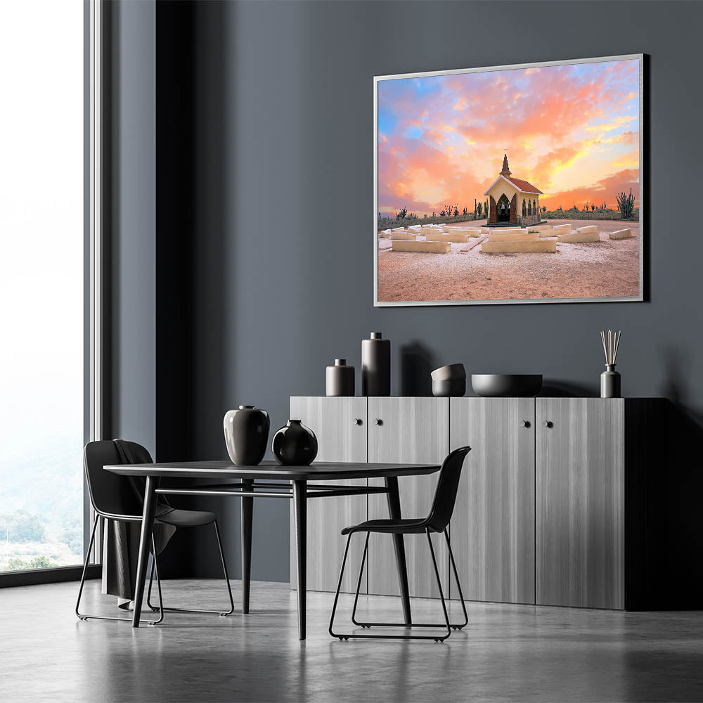 This stunning wall art captures a serene moment in Aruba's landscape, showcasing a charming chapel bathed in the warm hues of a sunset. Set against a desert-like backdrop with cacti and vibrant colors filling the sky, this piece reflects the natural beauty and cultural charm of the Caribbean island. The soft blend of pinks, oranges, and purples in the sky highlights the peaceful atmosphere, making it a perfect addition to any room in need of warmth and tranquility.