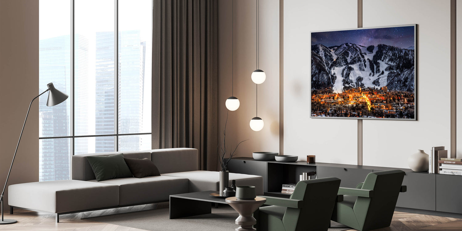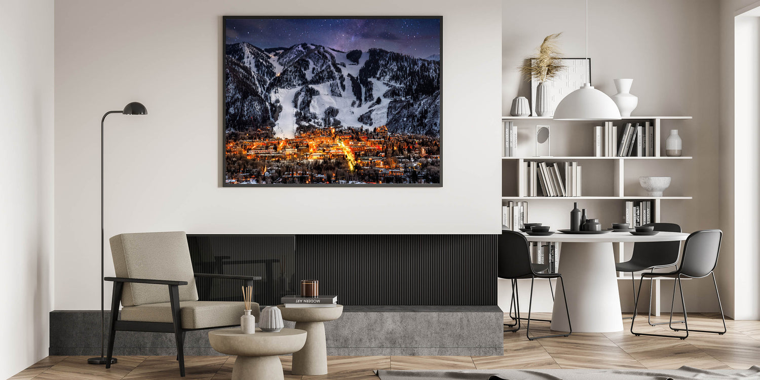 Bring the beauty of Aspen's winter nights into your home with this breathtaking Aspen mountain wall decor. This striking artwork features a stunning view of Aspen’s illuminated city lights nestled beneath snow-covered ski slopes and mountains, all under a starlit sky. The contrast between the warm city glow and the cool, snowy landscape creates a mesmerizing piece that will add elegance and sophistication to any room.