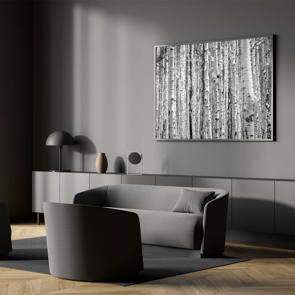 - High-quality Aspen, Colorado art prints featuring a black-and-white Aspen forest