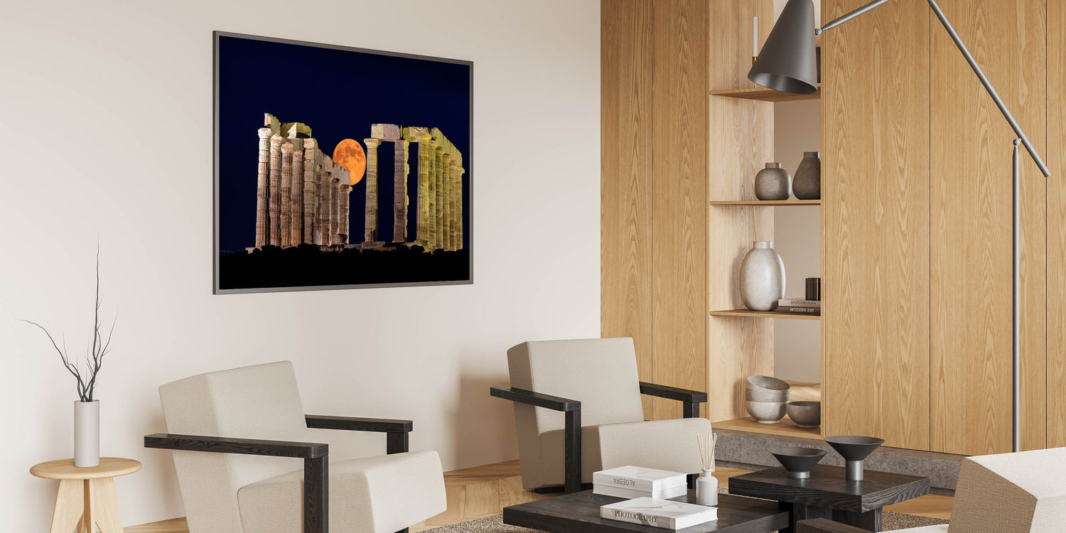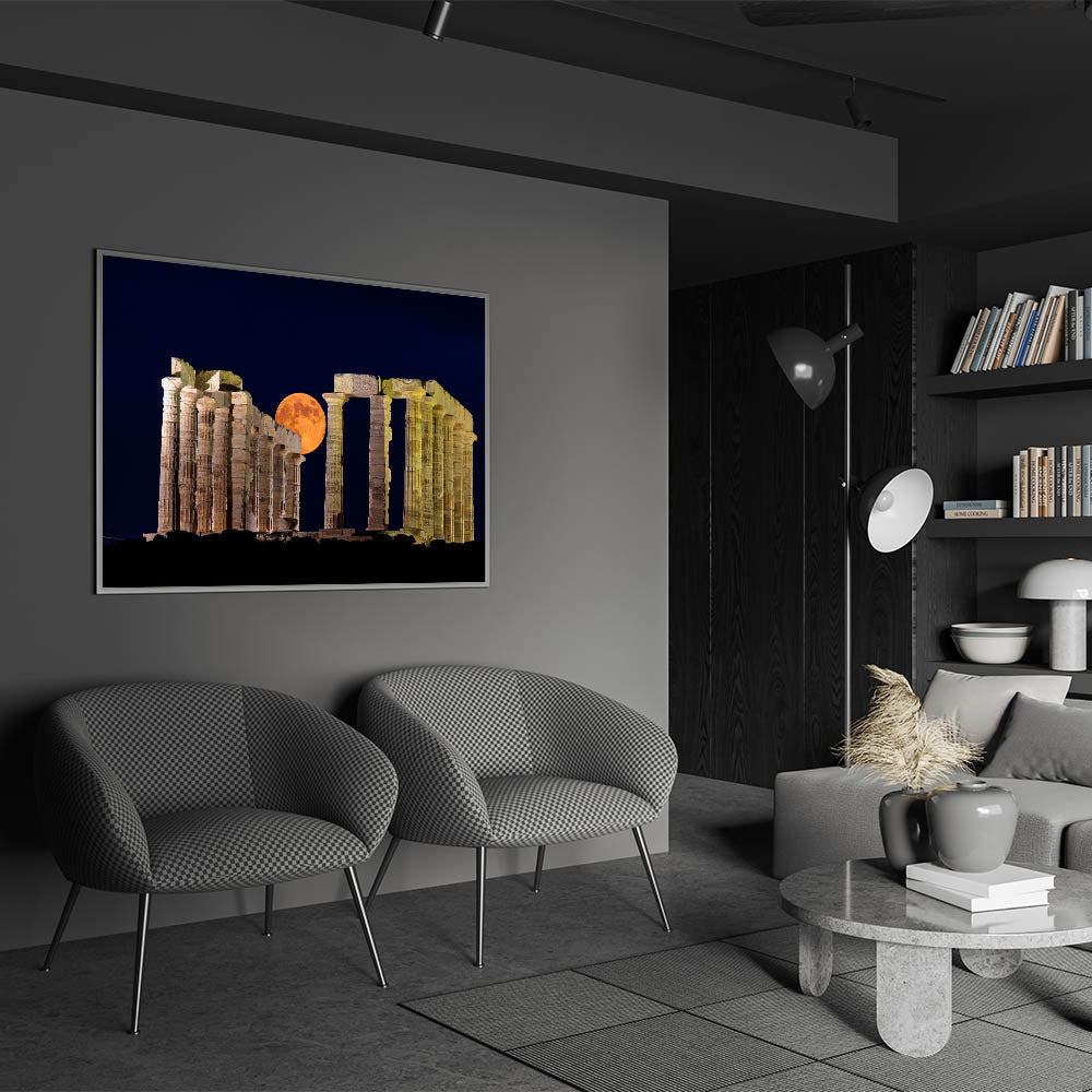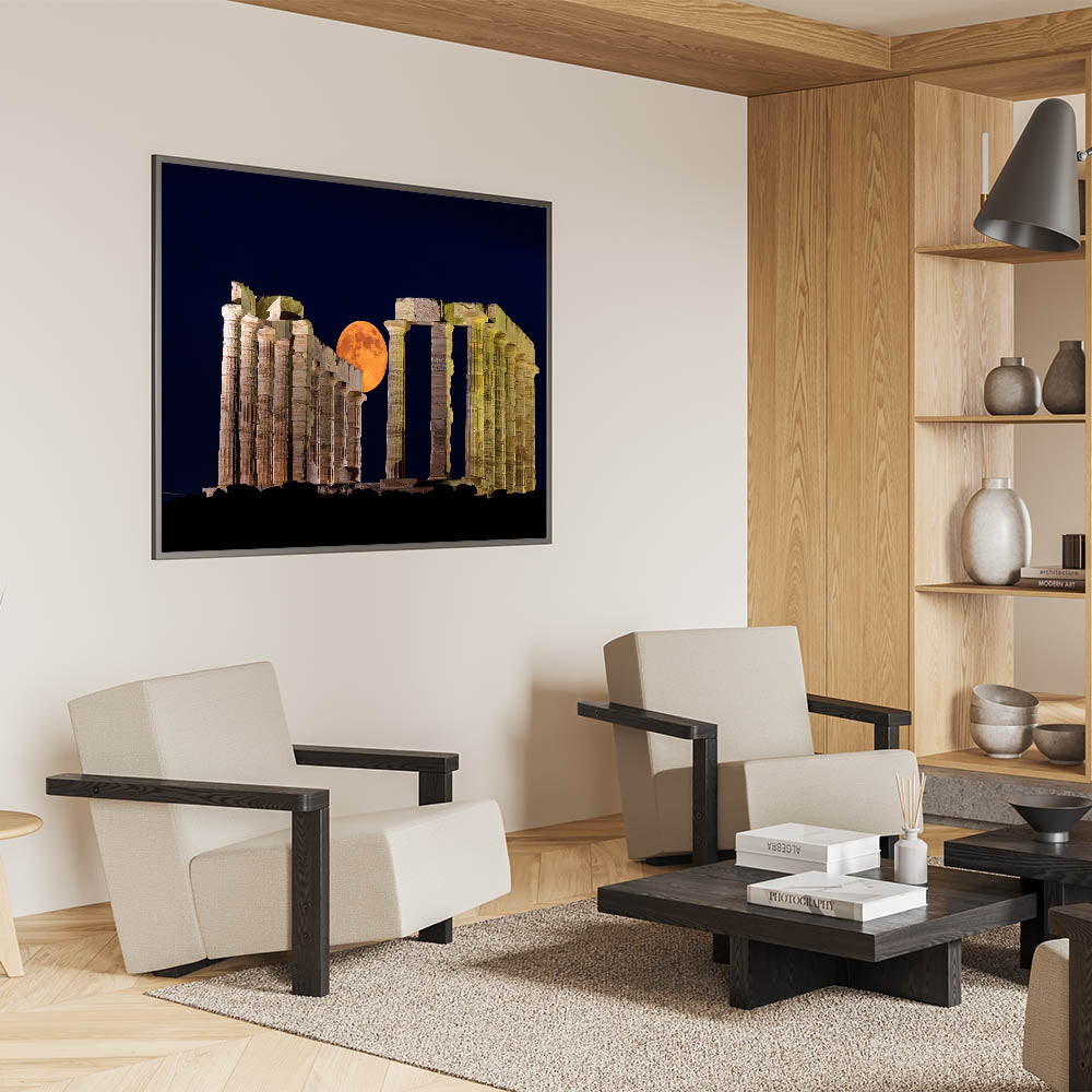 Capture the awe-inspiring beauty of ancient Greece with this Athens Wall Art featuring the illuminated Temple of Poseidon under a glowing full moon. This majestic artwork from the Athens Wall Art Collection adds a dramatic yet serene touch to any space, showcasing the mystical allure of one of Greece's most iconic landmarks.