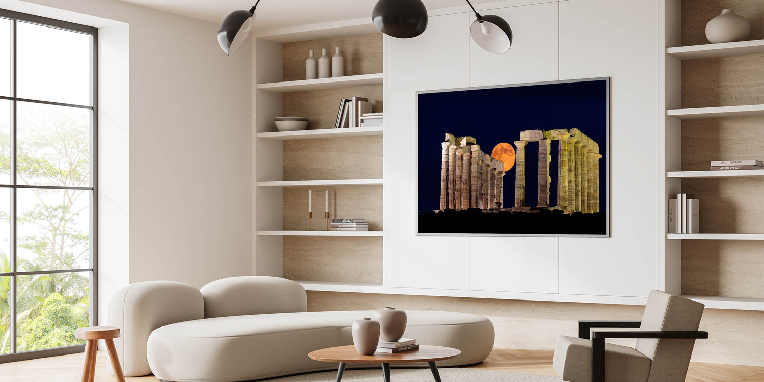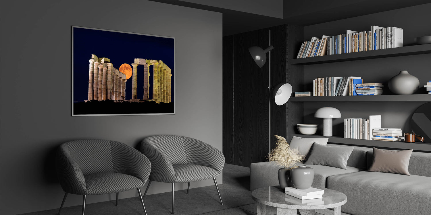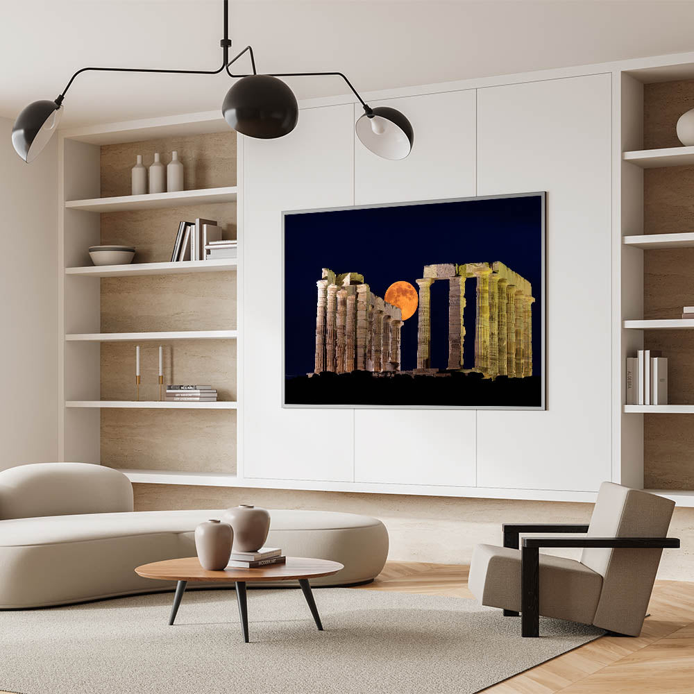 Capture the awe-inspiring beauty of ancient Greece with this Athens Wall Art featuring the illuminated Temple of Poseidon under a glowing full moon. This majestic artwork from the Athens Wall Art Collection adds a dramatic yet serene touch to any space, showcasing the mystical allure of one of Greece's most iconic landmarks.