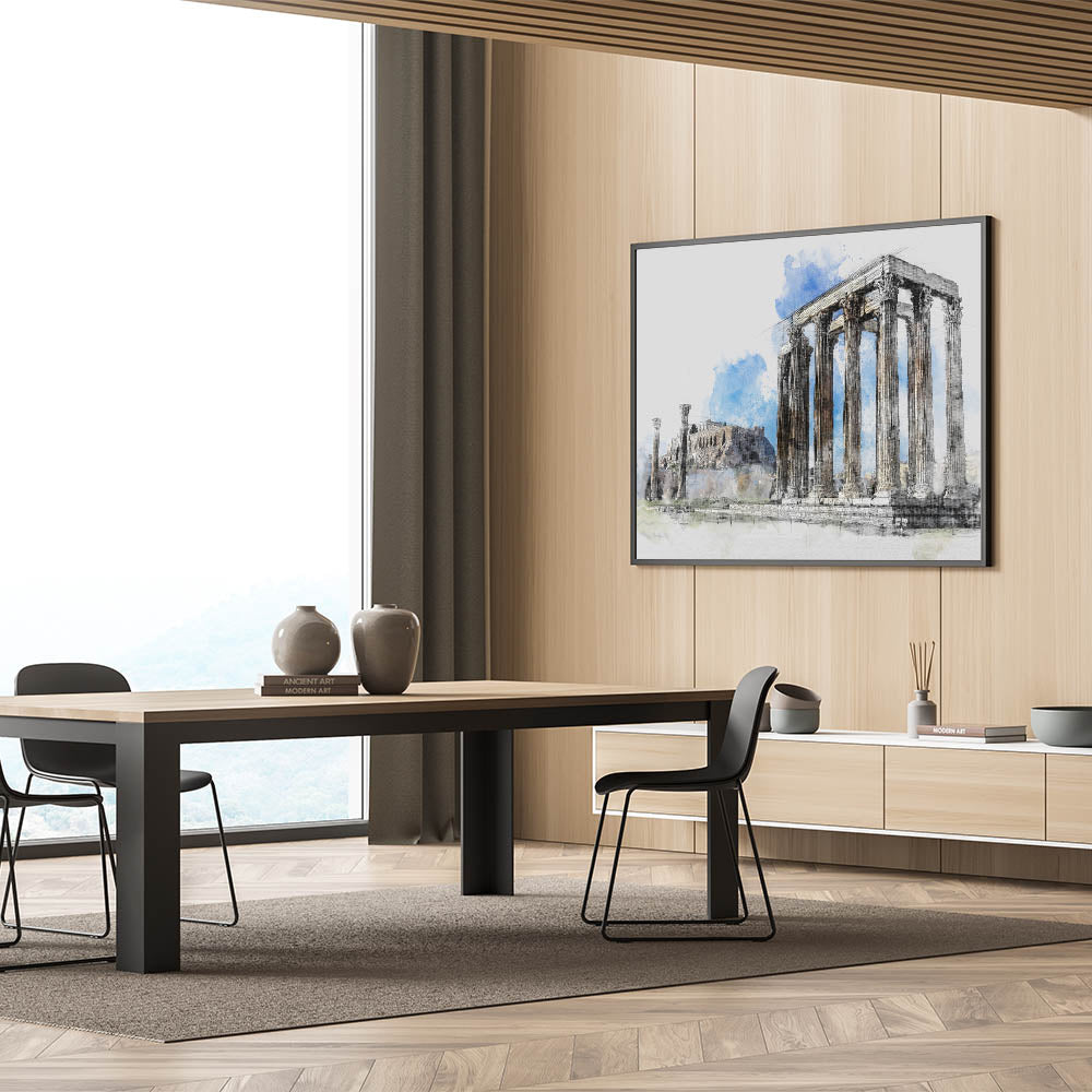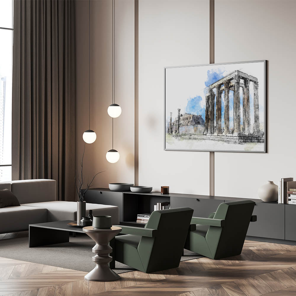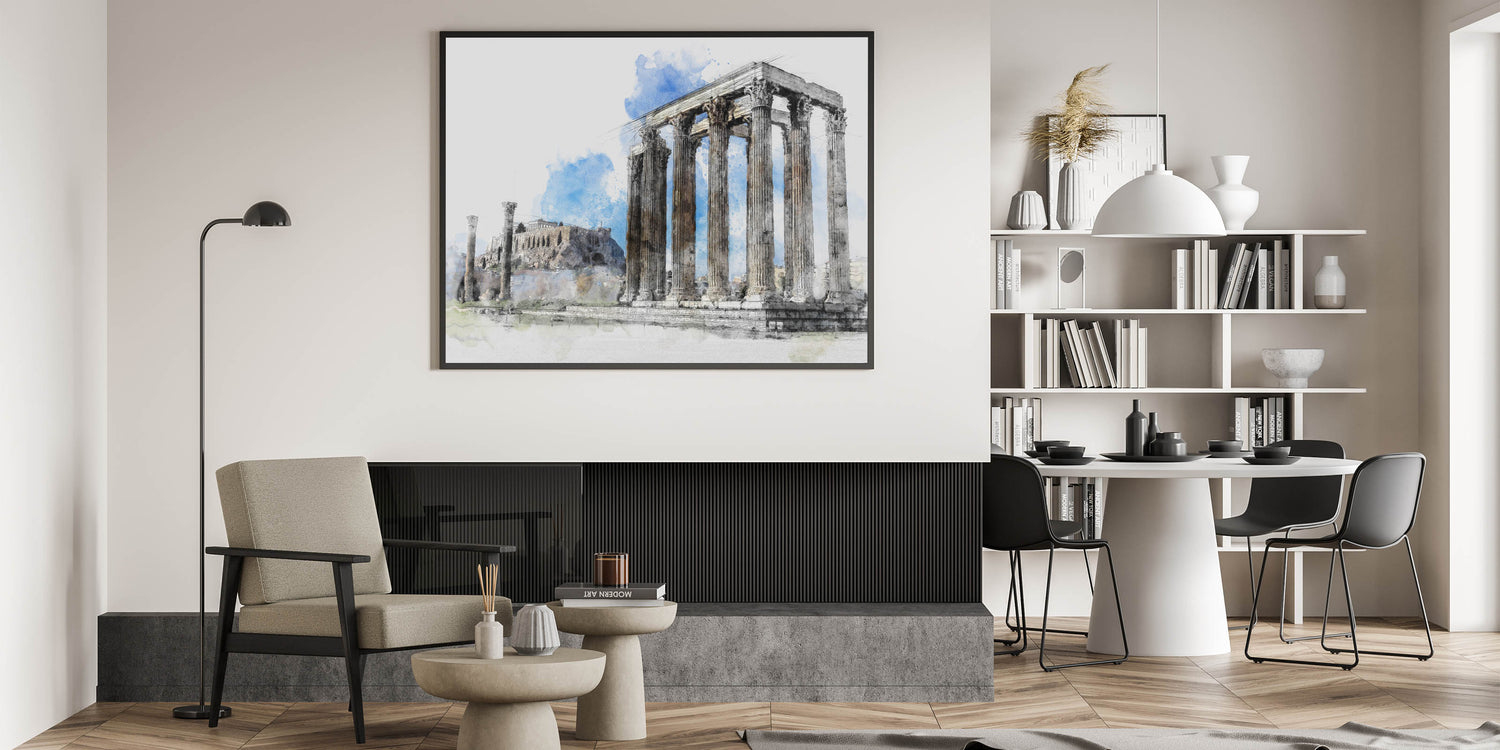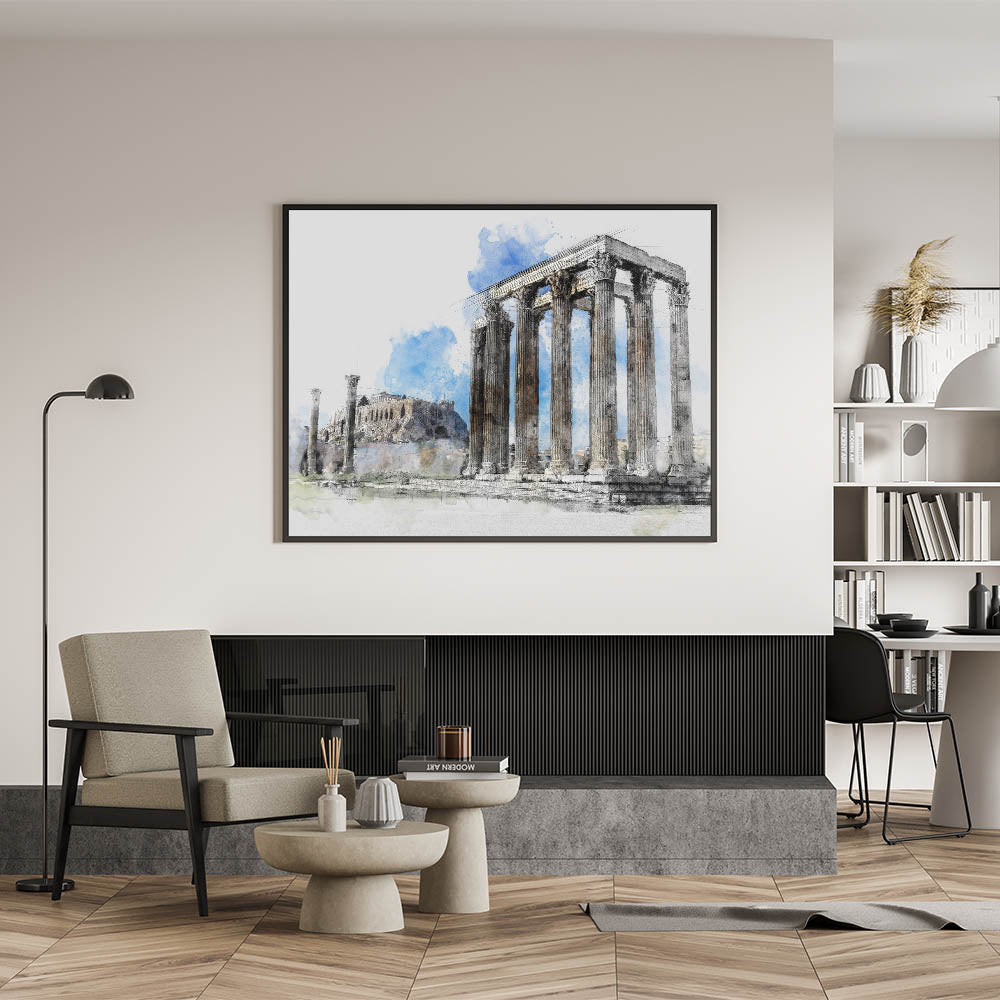 Bring a piece of ancient Athens to your home with this stunning Athens Wall Art, featuring a watercolor rendering of the Acropolis and the Temple of Zeus. This artistic piece, part of our Athens Wall Art Collection, combines the historical significance of ancient Greece with a modern watercolor aesthetic, making it the perfect blend of culture and contemporary art.