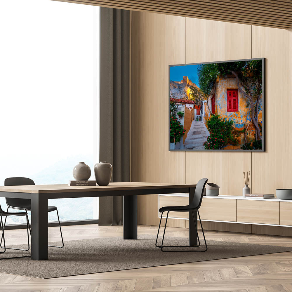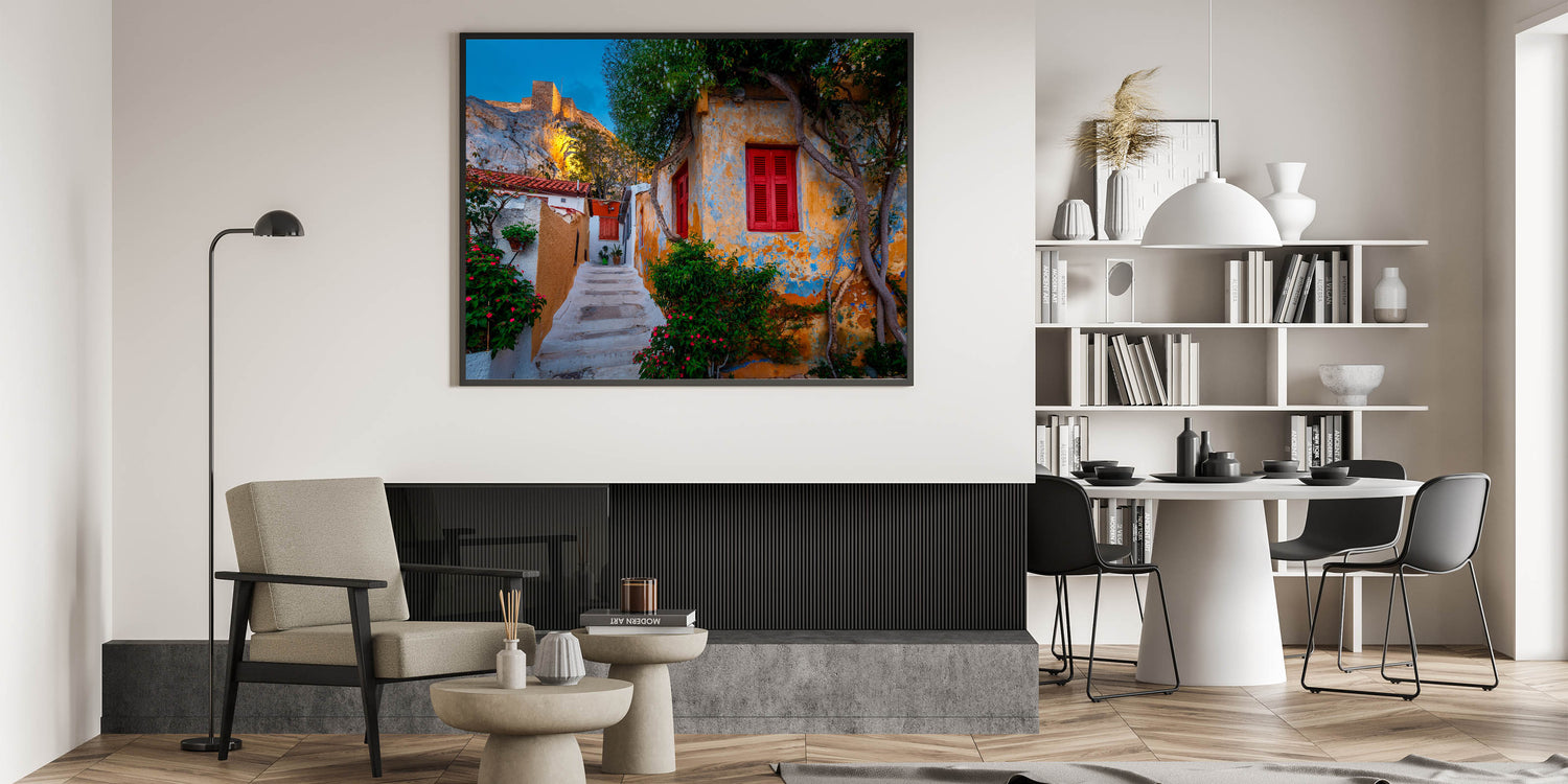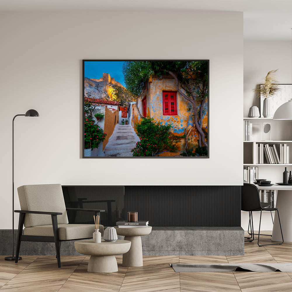 • High-Quality Greece Prints: Capturing the vibrant colors and fine details of this charming street, this piece embodies the perfect balance between history and everyday life in Athens.