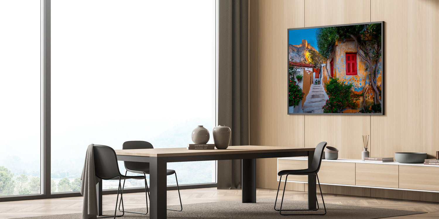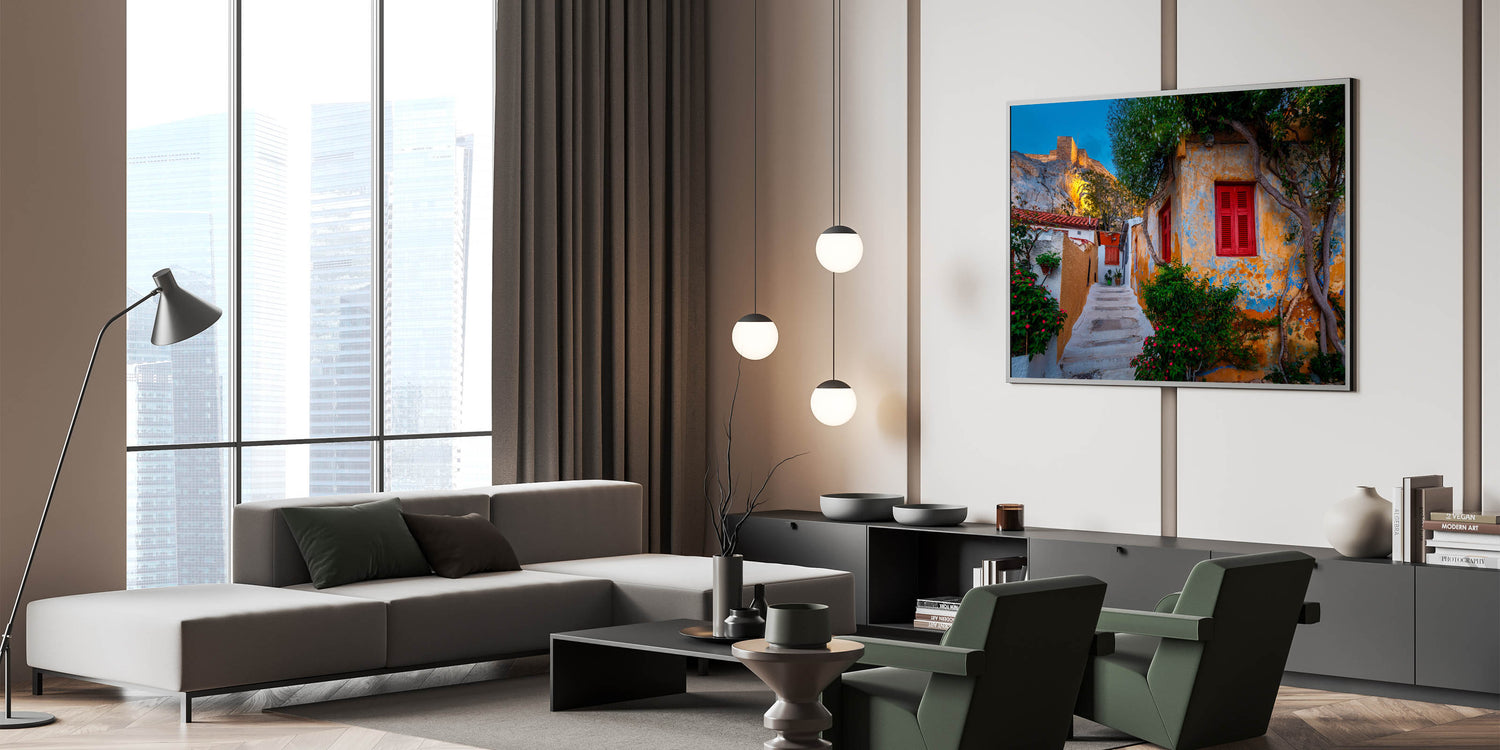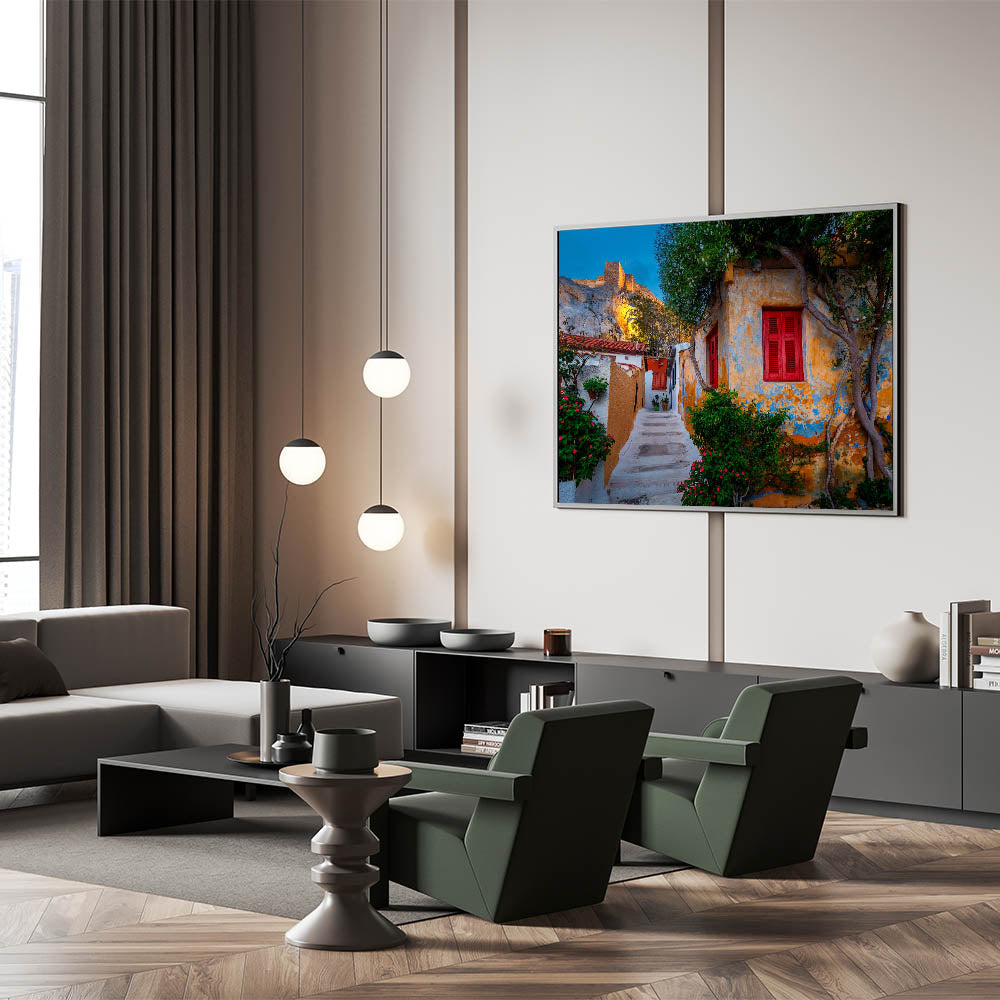 • High-Quality Greece Prints: Capturing the vibrant colors and fine details of this charming street, this piece embodies the perfect balance between history and everyday life in Athens.